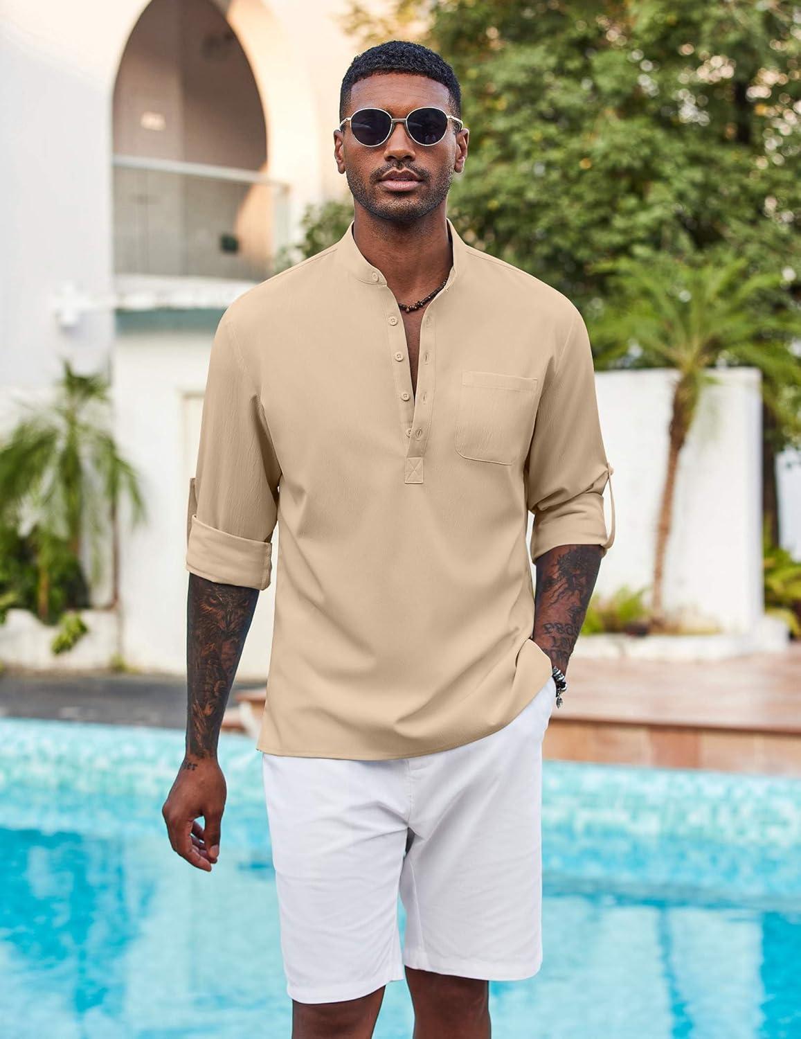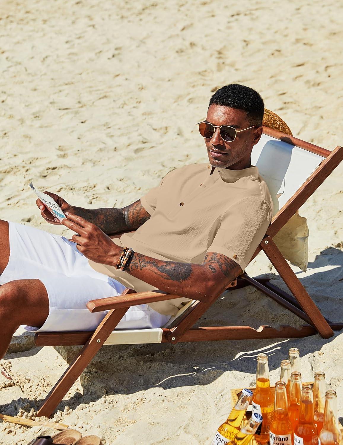 COOFANDY Henley Shirts for Men Short Sleeve Band Collar Casual Shirt Summer Hippie Vacation Beach T Shirts with Pocket(Khaki)