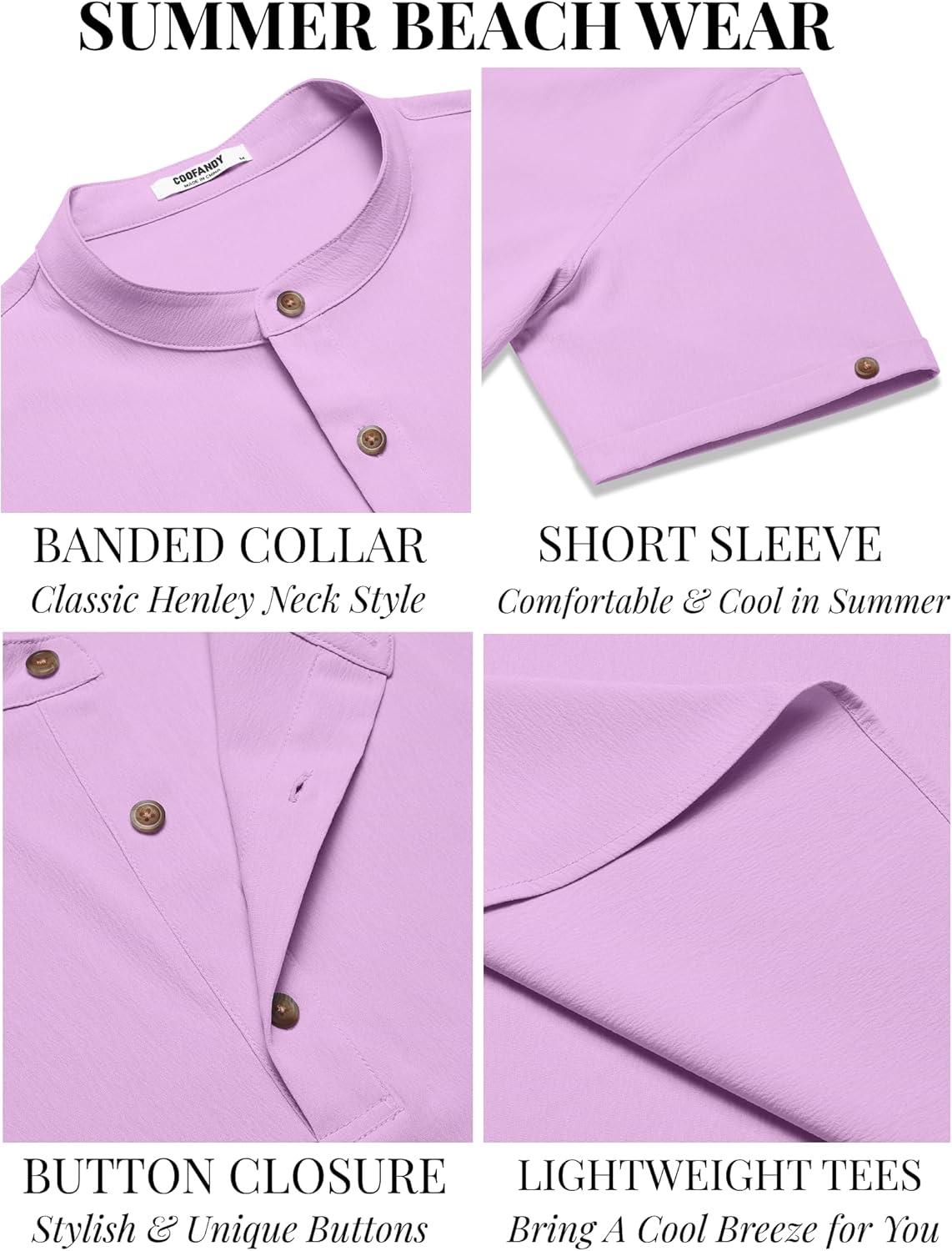 COOFANDY Men’s Casual Henley Shirts Short Sleeve Summer Beach T-Shirts Banded Collar Henleys Button Tee Shirt(Light Purple)