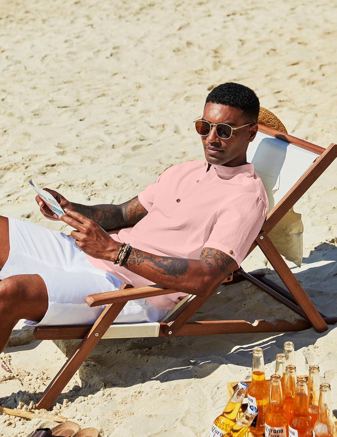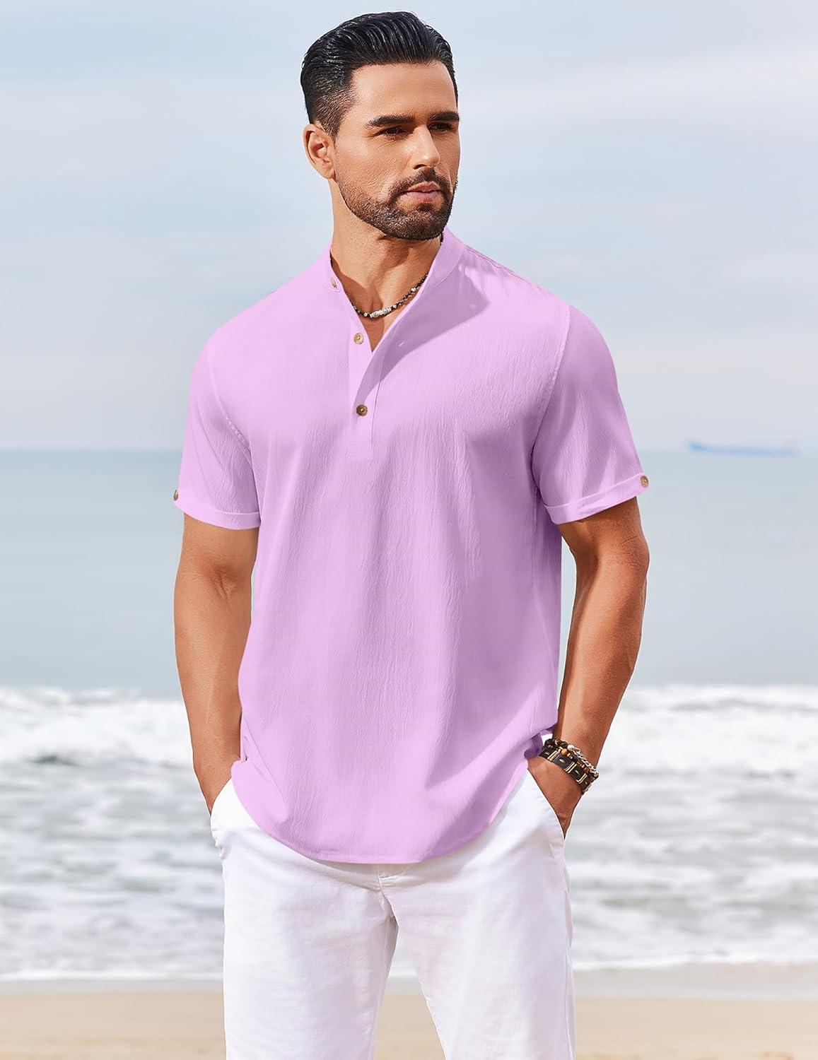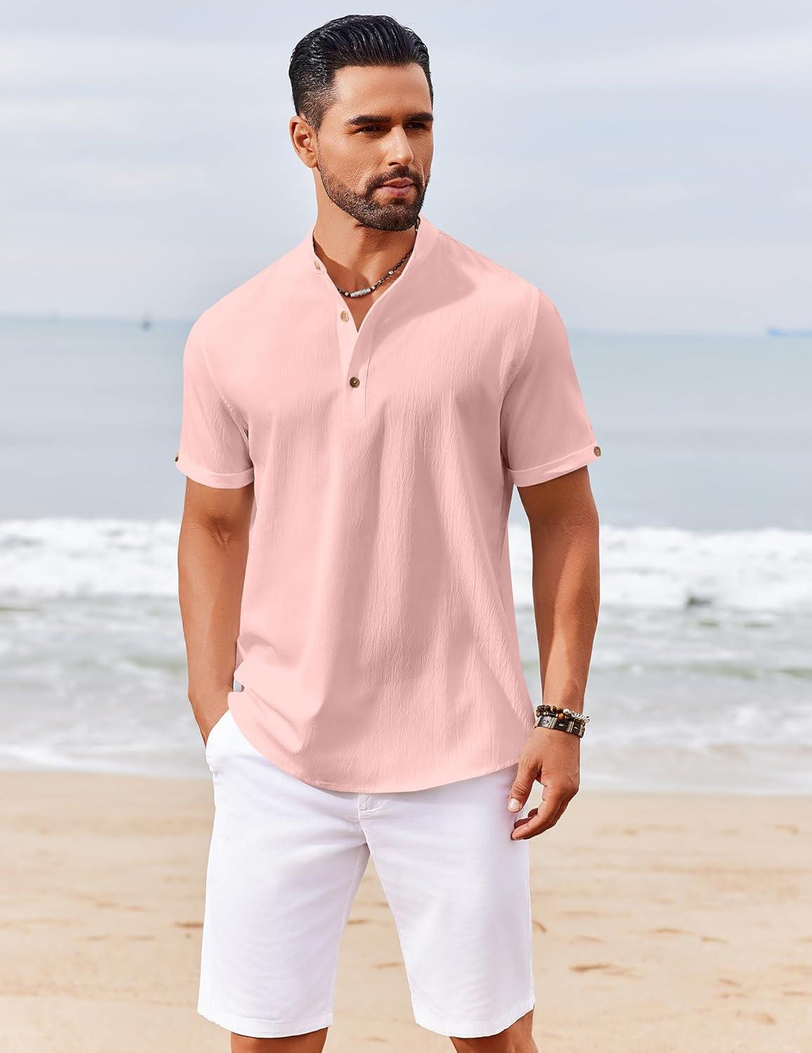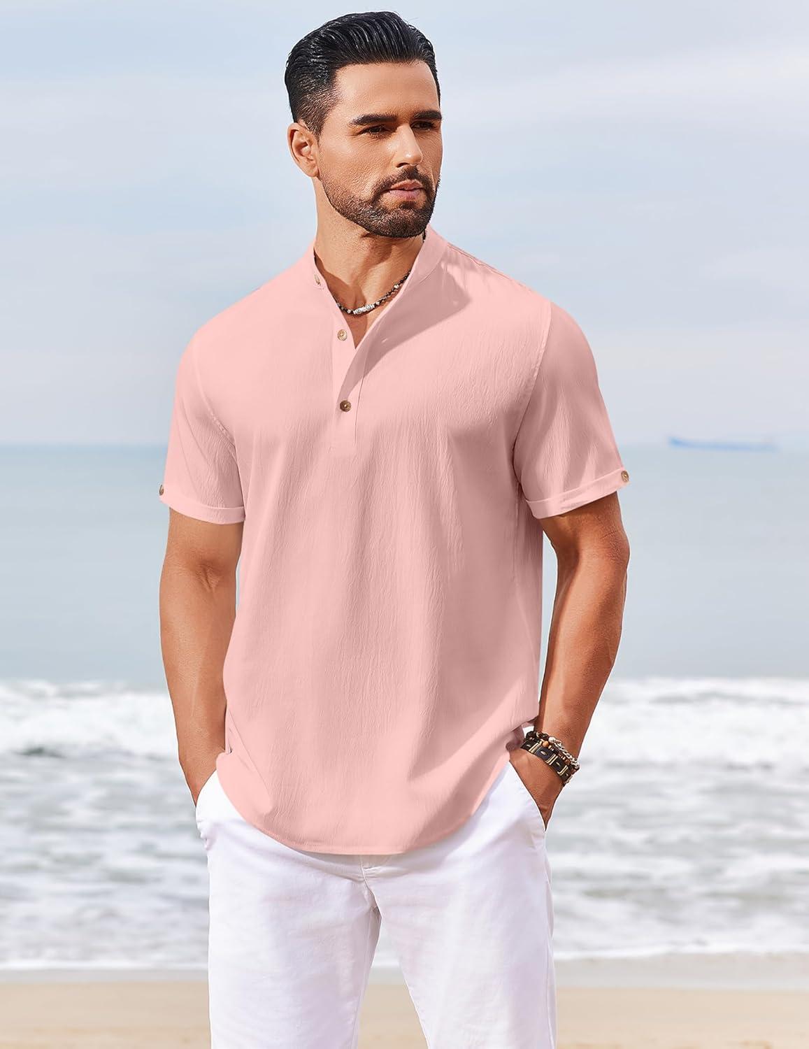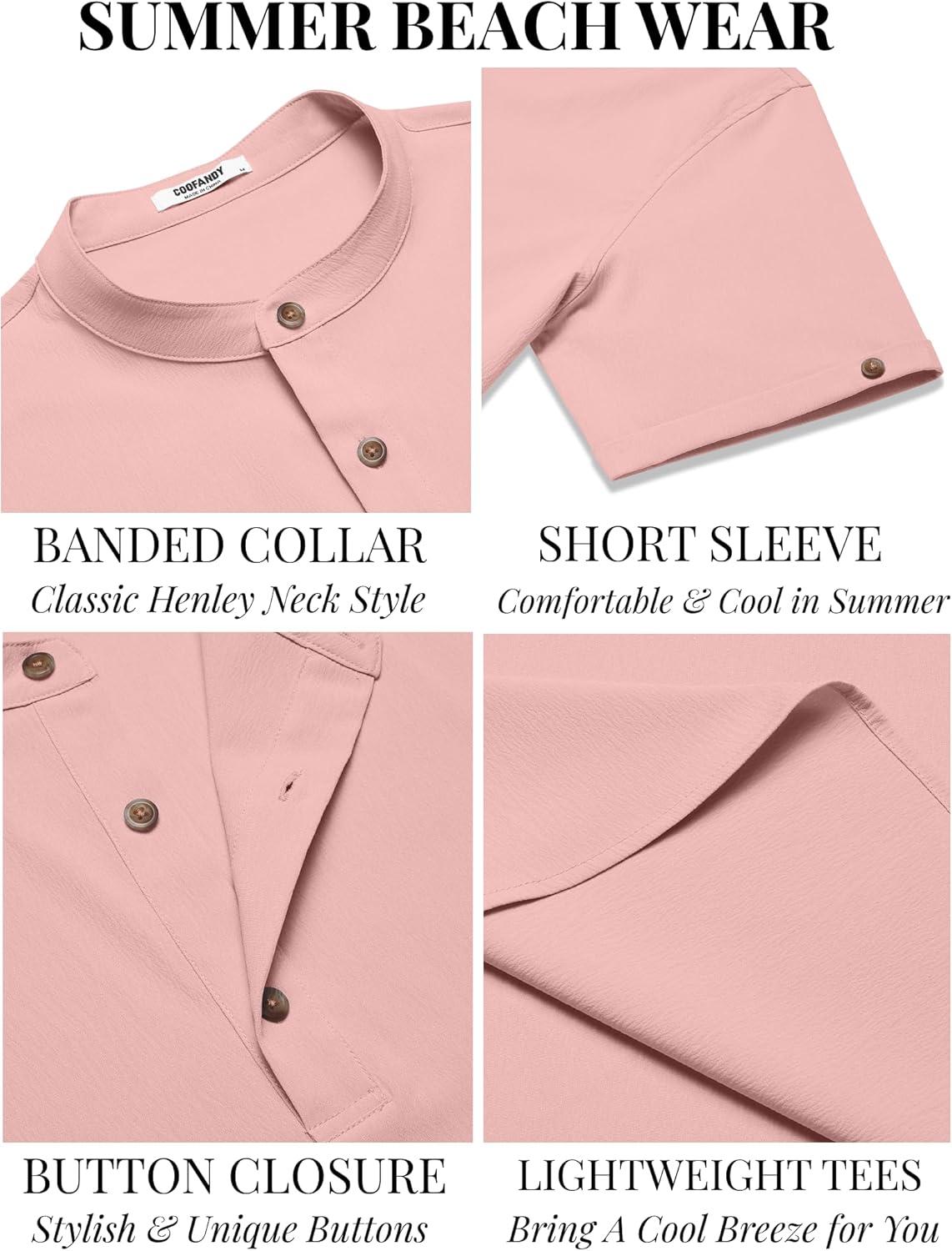 COOFANDY Men’s Casual Henley Shirts Short Sleeve Summer Beach T-Shirts Banded Collar Henleys Button Tee Shirt(Pink)