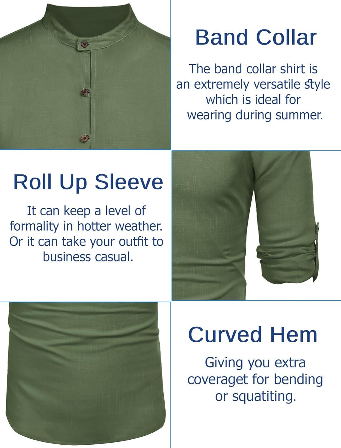 COOFANDY Men’s Casual Henley Shirt Long Sleeve Band Collar Shirts Summer Beach Hippie Button T-Shirts(Dark Green)