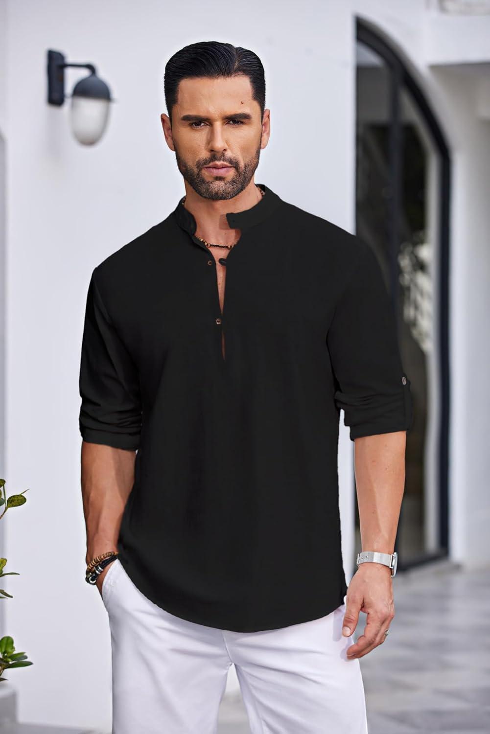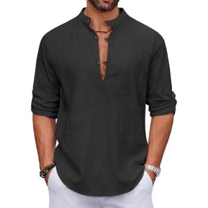 COOFANDY Men’s Cotton Linen Henley Shirt Casual Beach Hippie Shirts Long Sleeve T-Shirts(Black)