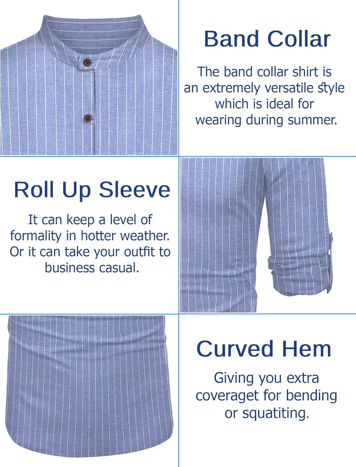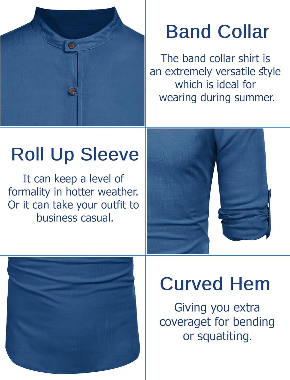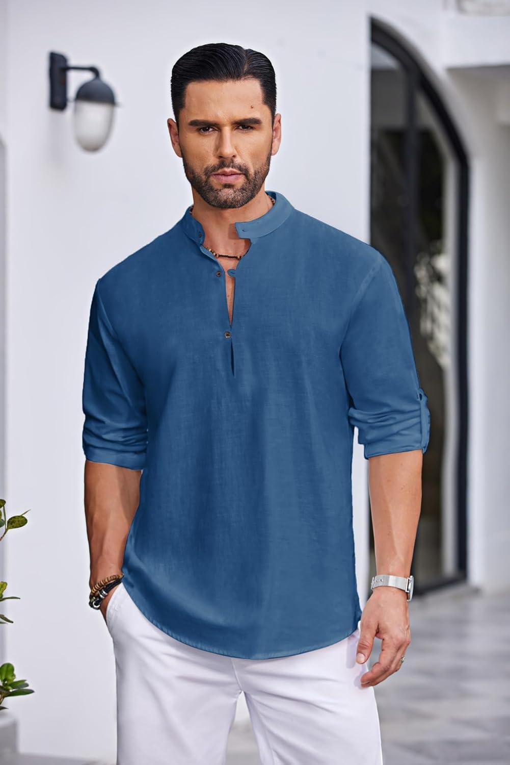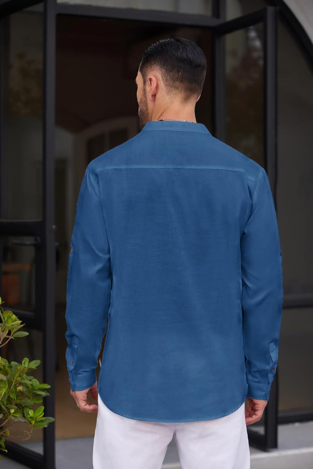 COOFANDY Men’s Casual Henley Shirt Long Sleeve Band Collar Shirts Summer Beach Hippie Button T-Shirts(Blue)