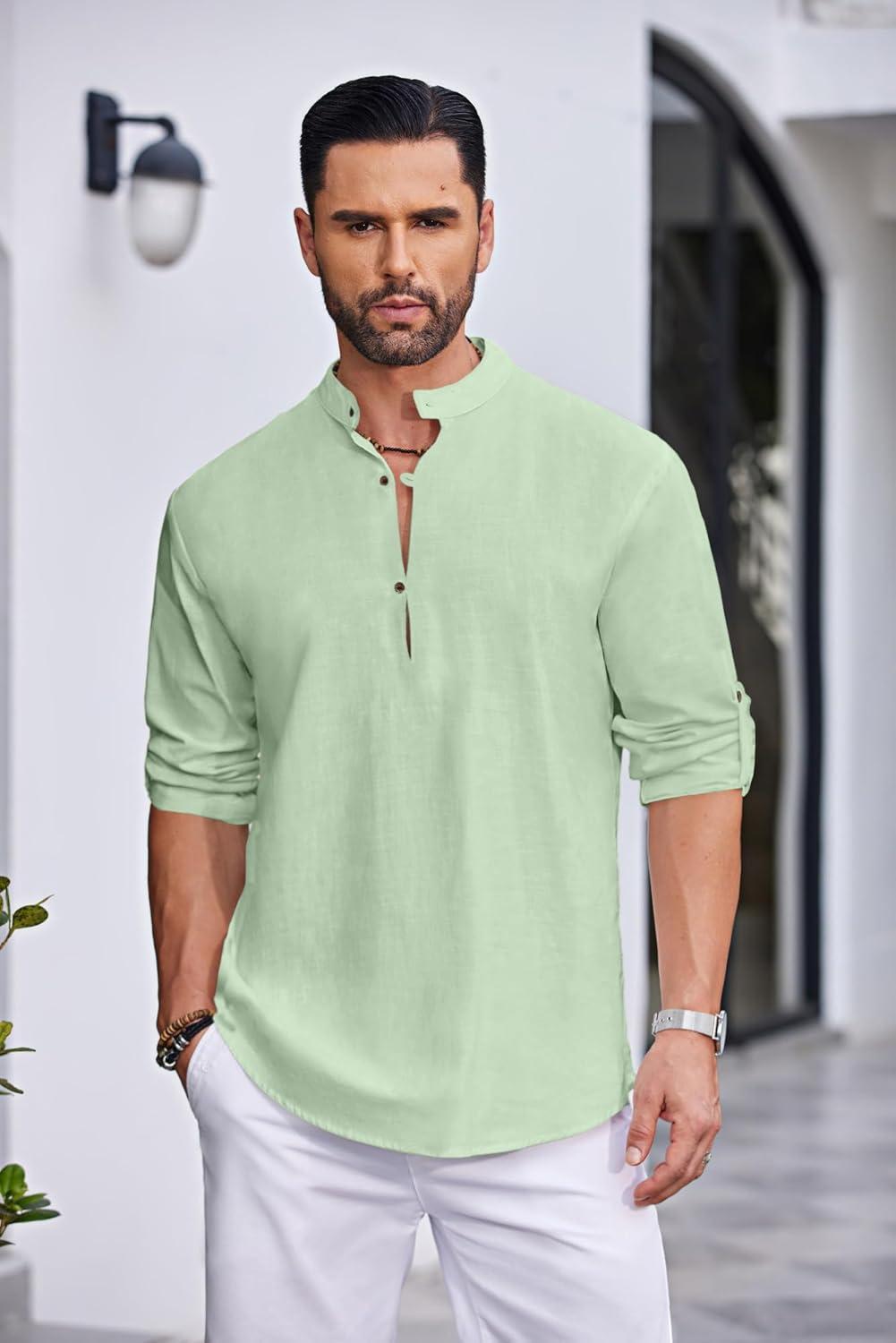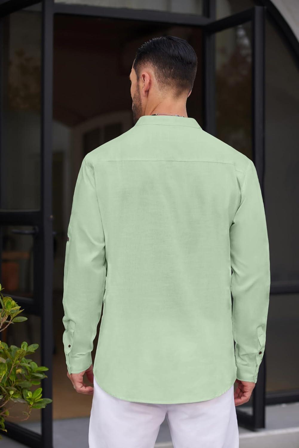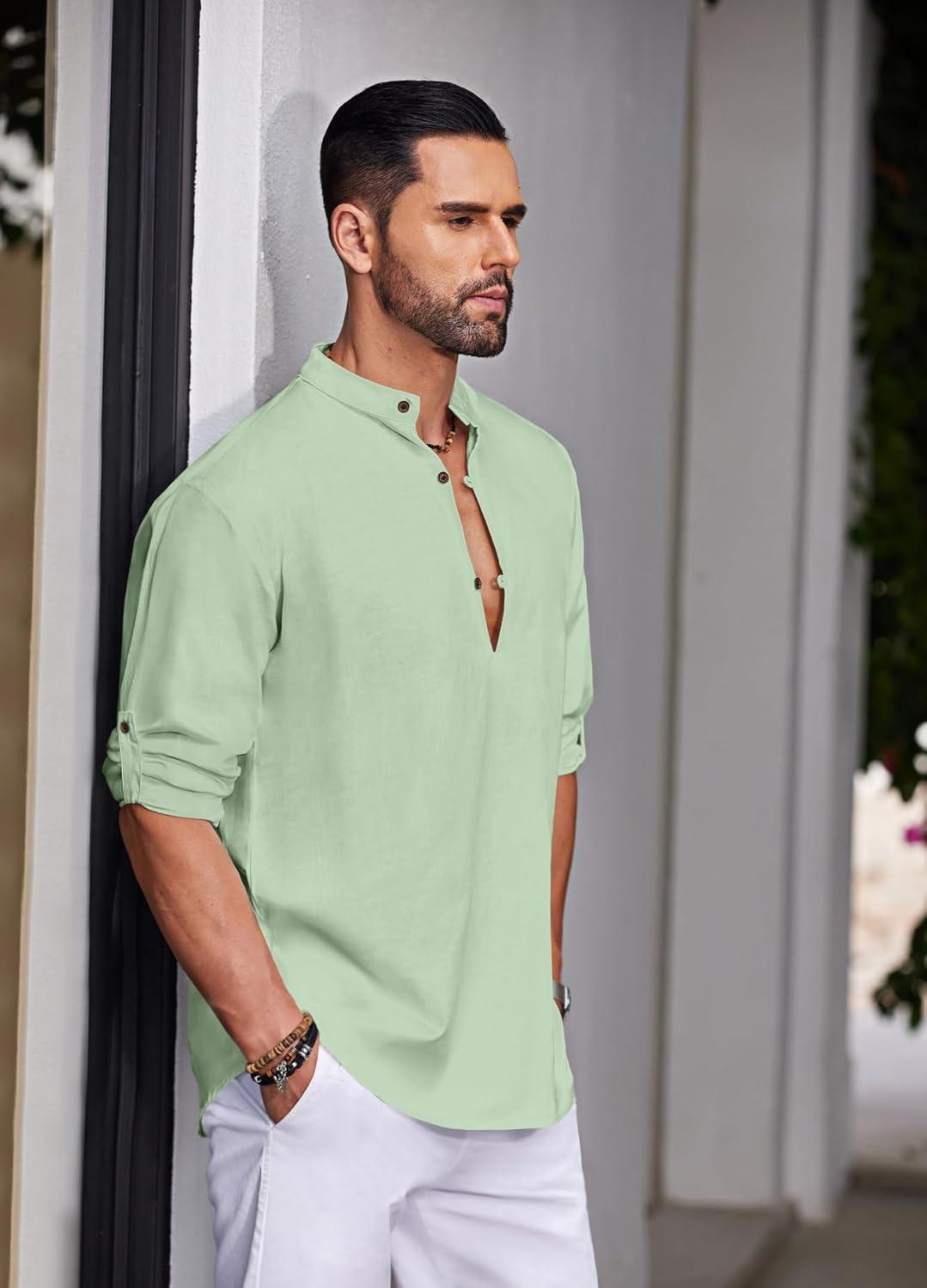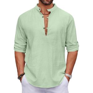 COOFANDY Men’s Cotton Linen Henley Shirt Casual Beach Hippie Shirts Long Sleeve T-Shirts(Light Green)