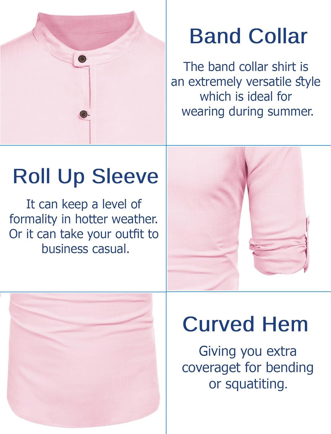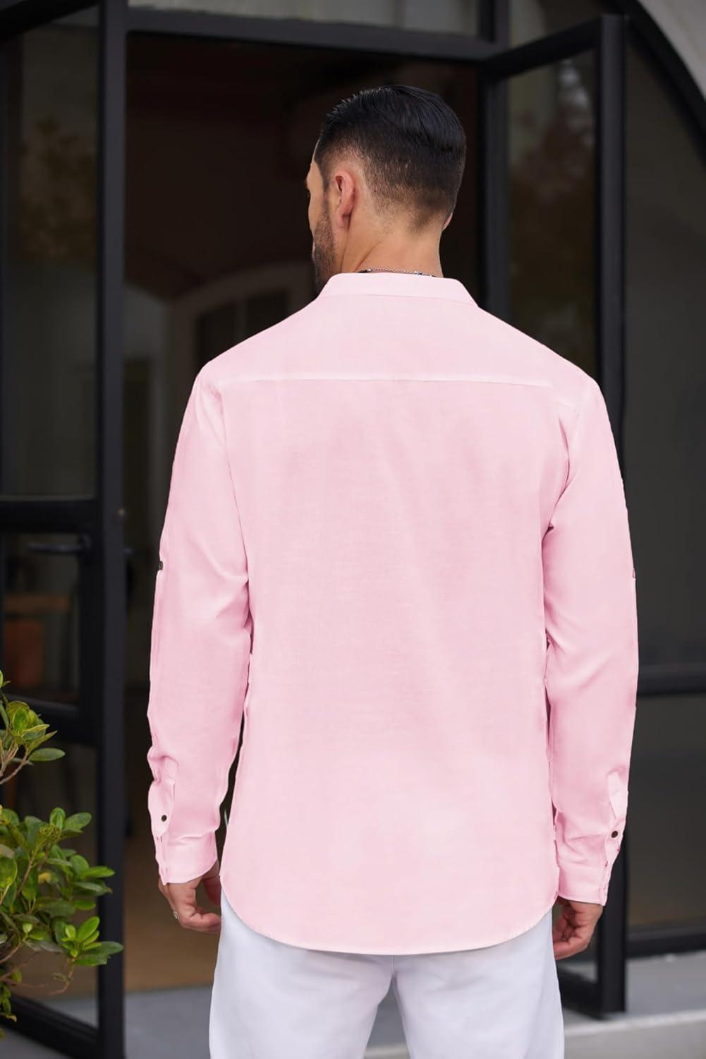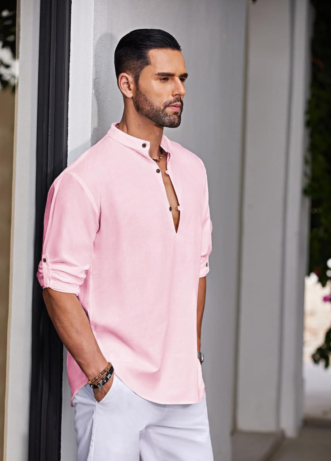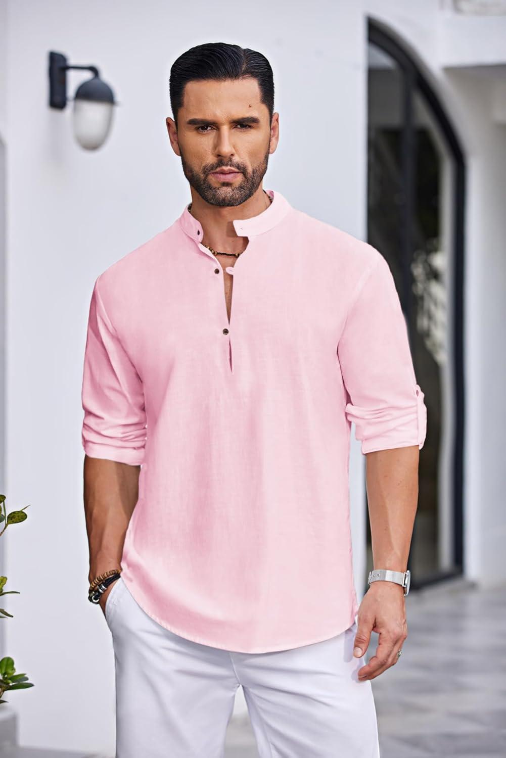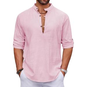 COOFANDY Men’s Cotton Linen Henley Shirt Casual Beach Hippie Shirts Long Sleeve T-Shirts(Pink)