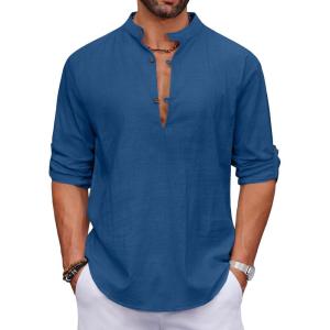 COOFANDY Men’s Cotton Linen Henley Shirt Casual Beach Hippie Shirts Long Sleeve T-Shirts(Dark Blue)