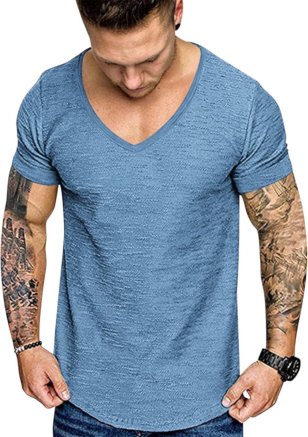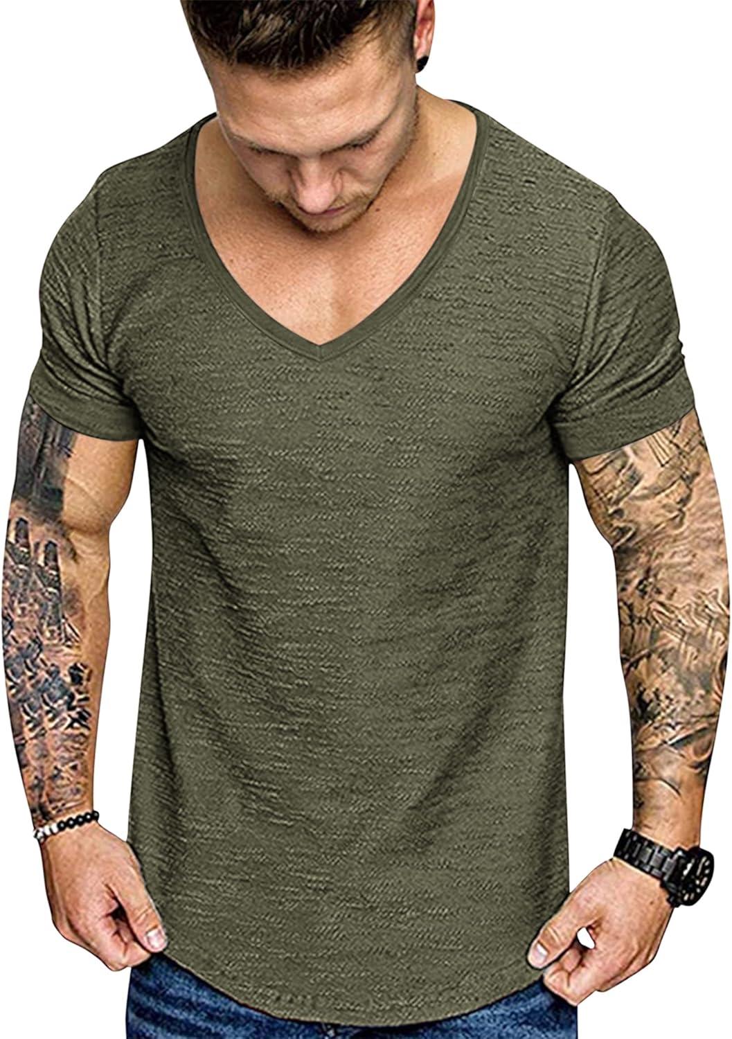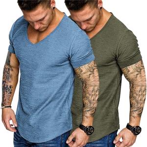 COOFANDY Mens 2 Pack Muscle V Neck T Shirt Fitted Gym Workout Short Sleeve Bodybuilding Tee(Army Green/Blue)