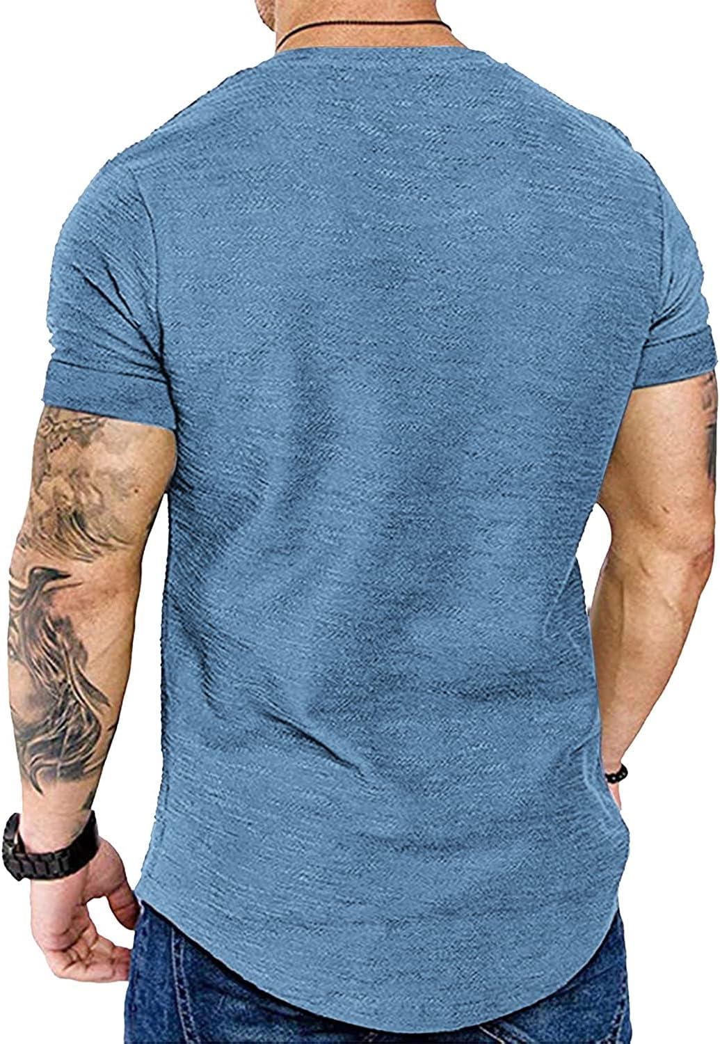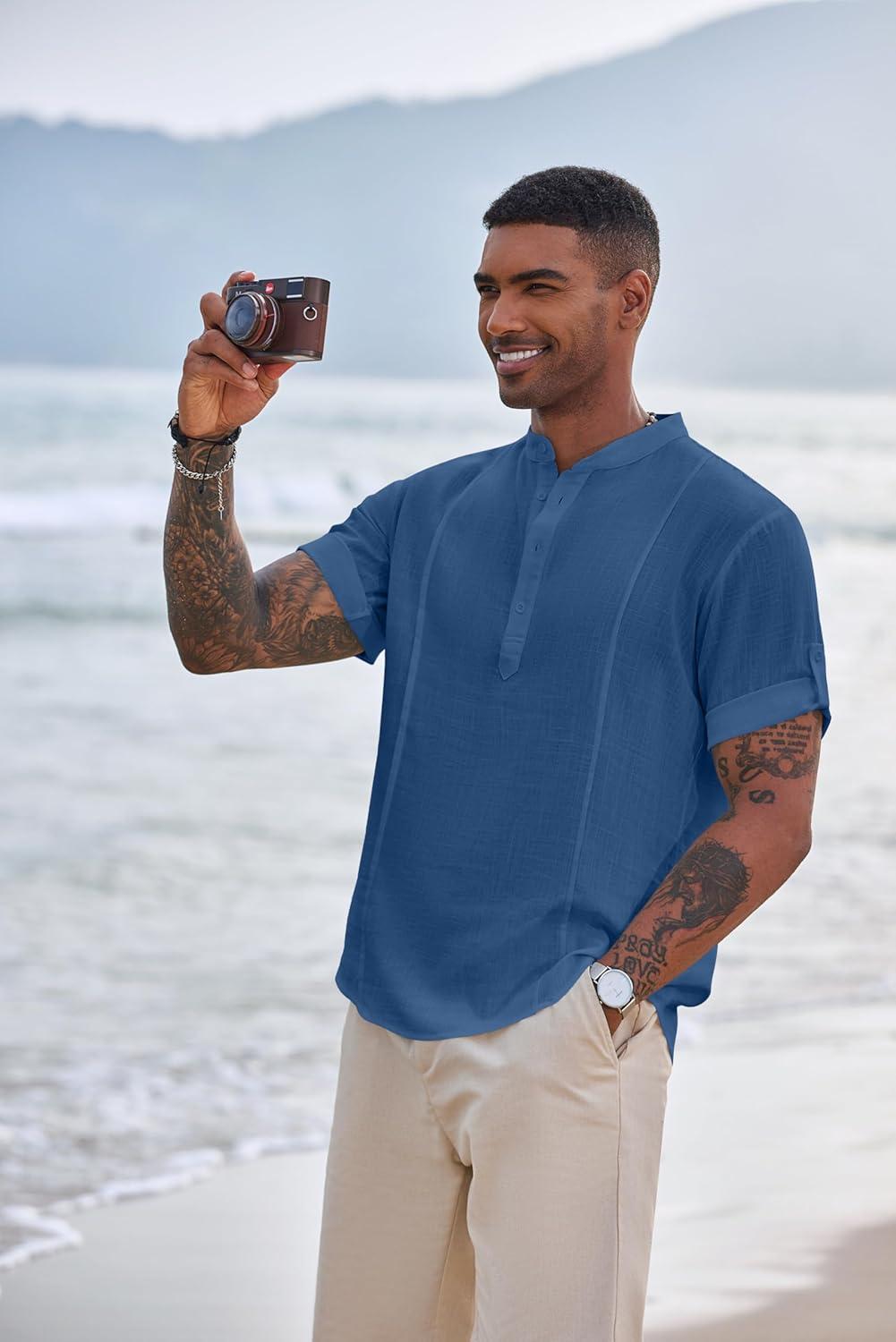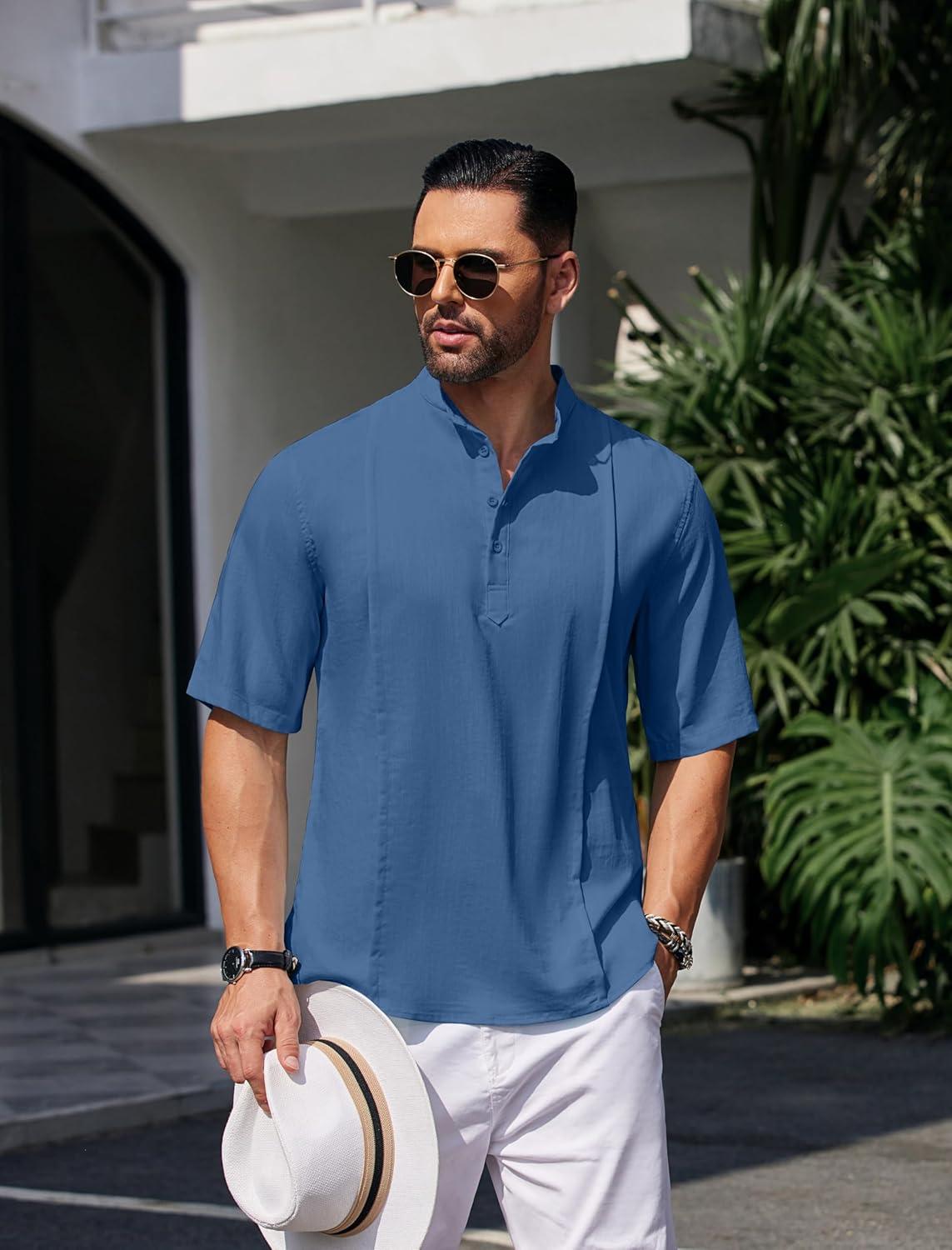 COOFANDY Men’s Henley T-Shirts Short Sleeve Casual Button Henley Shirts Band Collar Tee Summer Beach Hippie Shirts(Denim Blue)