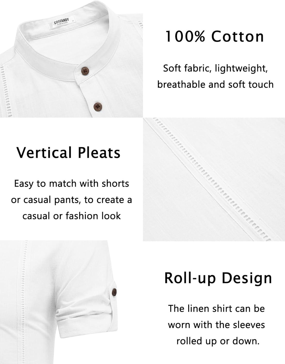 COOFANDY Men’s Cotton Linen Henley Shirt Short Sleeve Hippie Casual Band Collar Summer Beach T-Shirts(A-white)