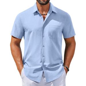 COOFANDY Men’s Button Down Shirts Casual Short Sleeve Linen Shirt Summer Beach Top with Pocket(Light Blue)