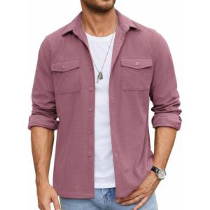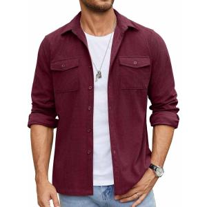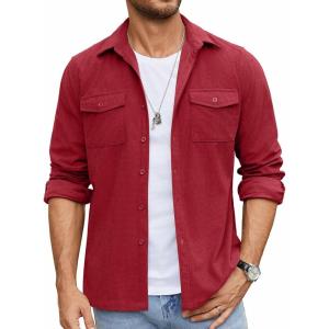 • COOFANDY Men’s Button Down Waffle Shirt Jacket Casual Long Sleeve Shacket Lightweight Overshirts with Flap Pockets(Deep Red)