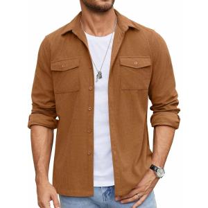• COOFANDY Men’s Button Down Waffle Shirt Jacket Casual Long Sleeve Shacket Lightweight Overshirts with Flap Pockets(Brown)