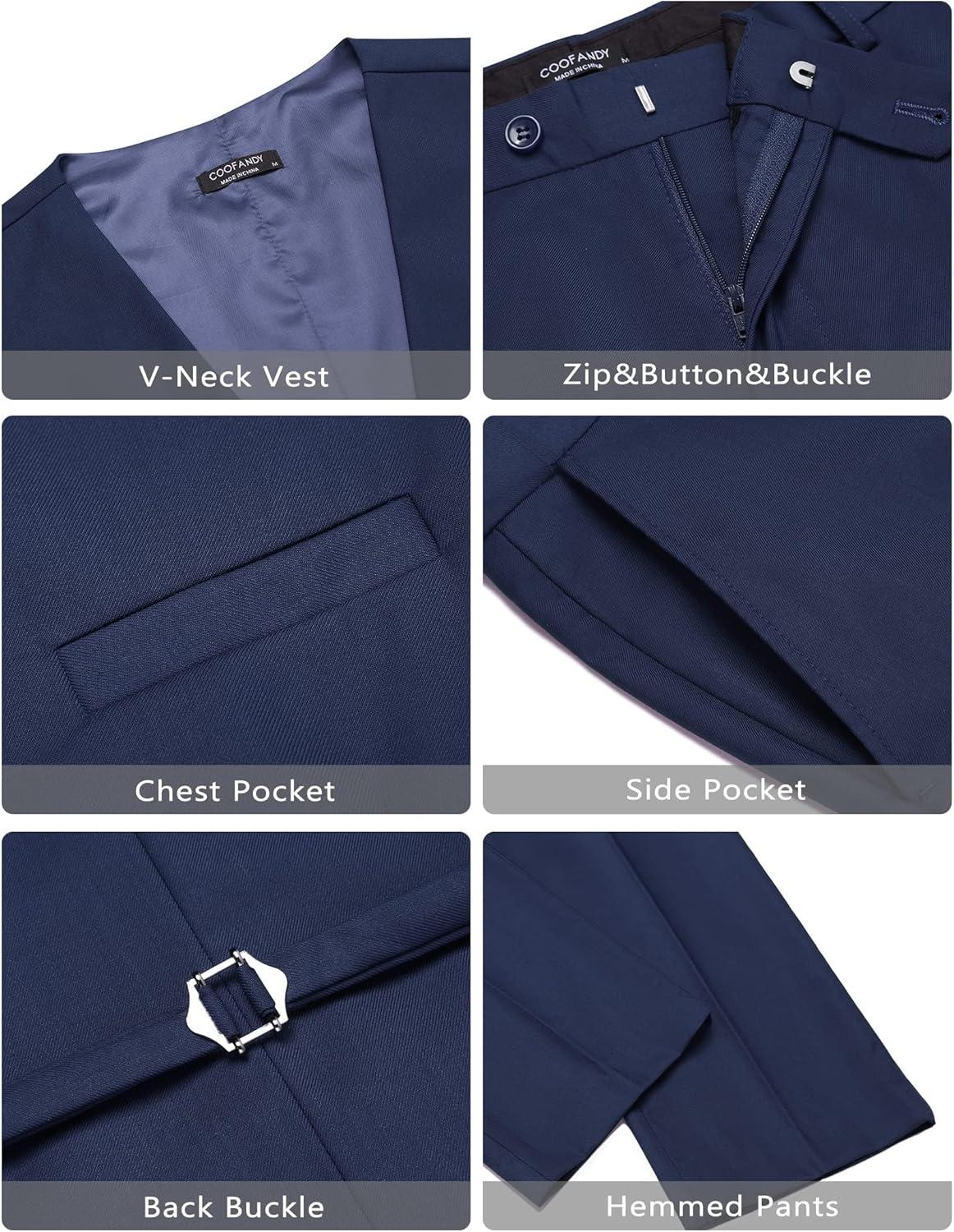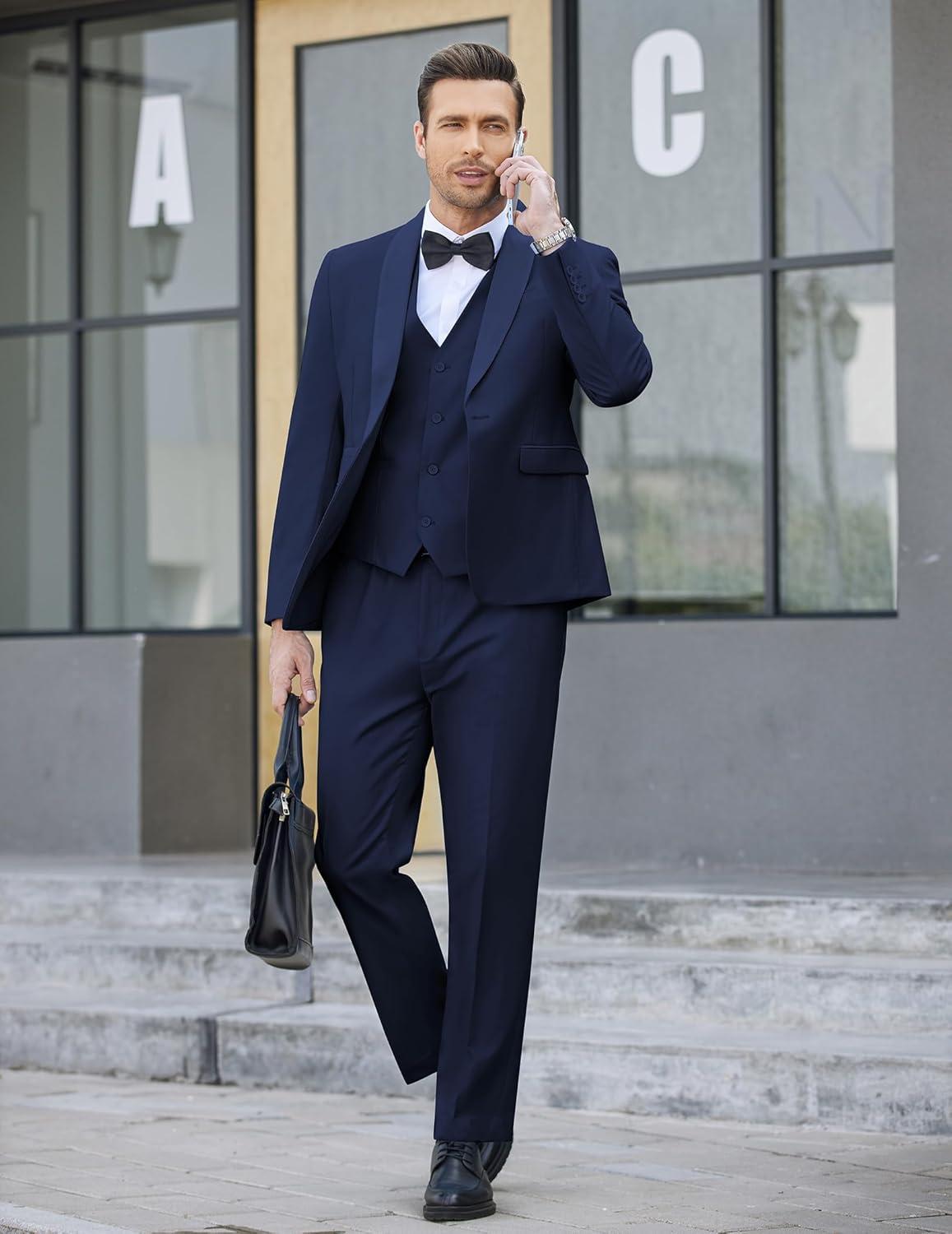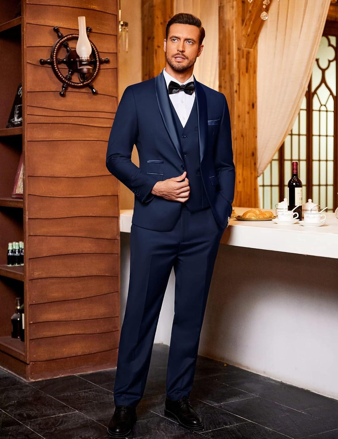 COOFANDY Men’s 3 Pieces Suit Slim Fit Tuxedo Set One Button Shawl Lapel Dinner Prom Jacket Vest Pants with Tie(Navy Blue)