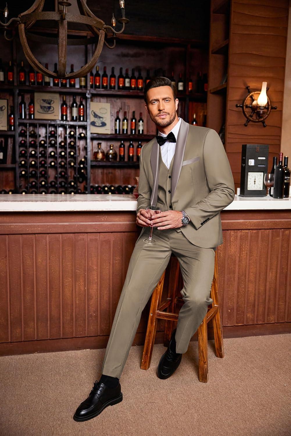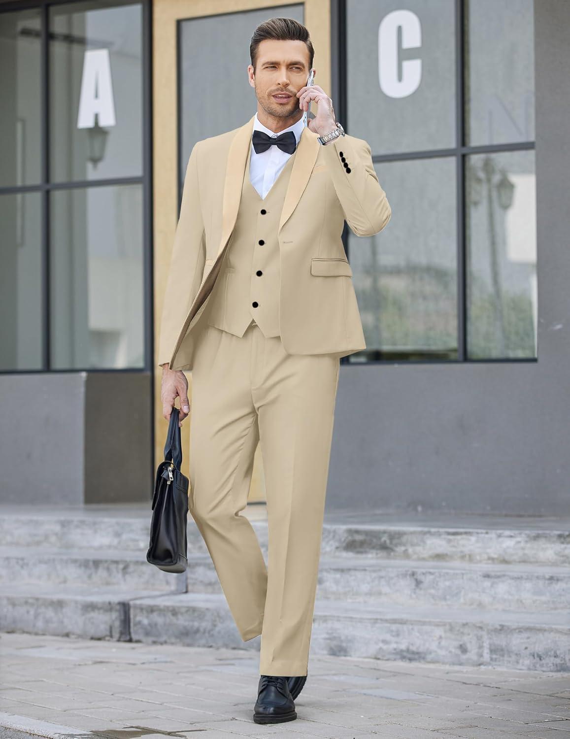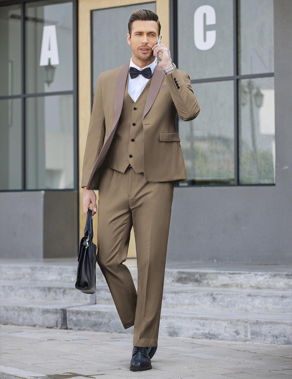 COOFANDY Men’s 3 Pieces Suit Slim Fit Tuxedo Set One Button Shawl Lapel Dinner Prom Jacket Vest Pants with Tie(Khaki)