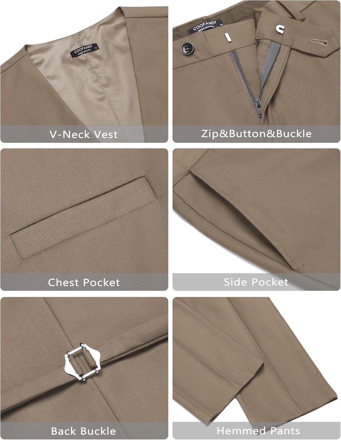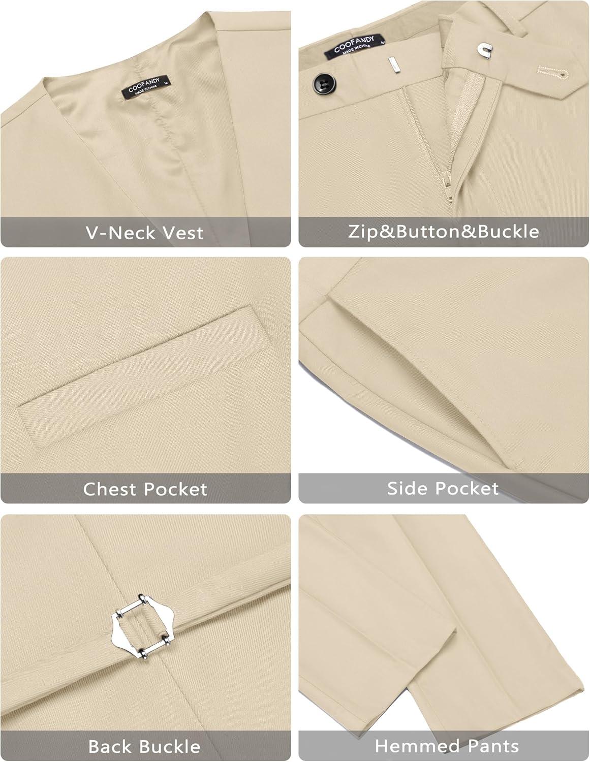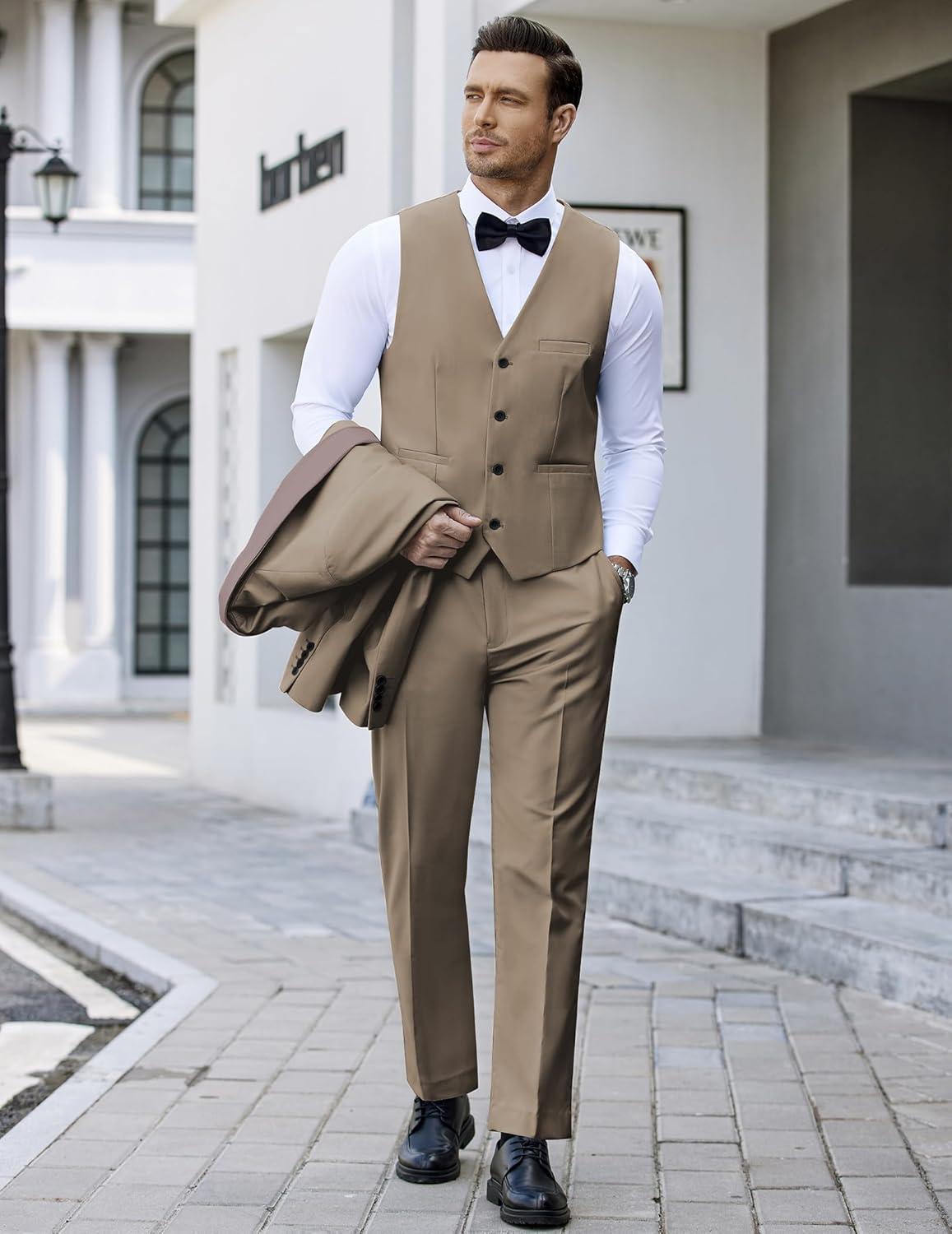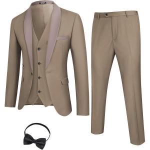 COOFANDY Men’s 3 Pieces Suit Slim Fit Tuxedo Set One Button Shawl Lapel Dinner Prom Jacket Vest Pants with Tie(Khaki)