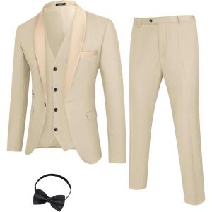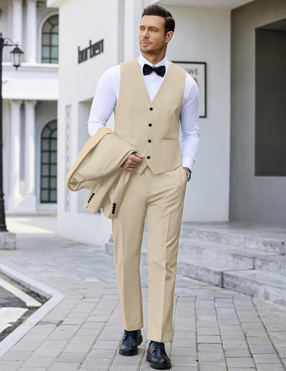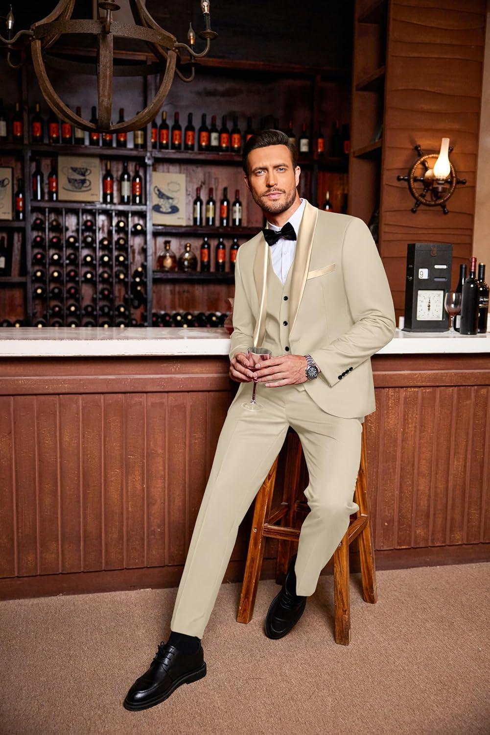 COOFANDY Men’s 3 Pieces Suit Slim Fit Tuxedo Set One Button Shawl Lapel Dinner Prom Jacket Vest Pants with Tie(Light Khaki)