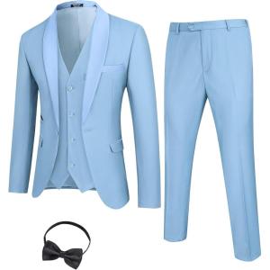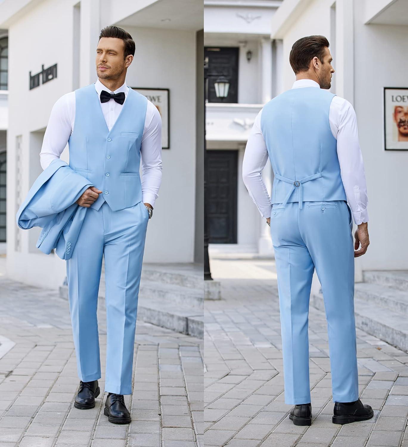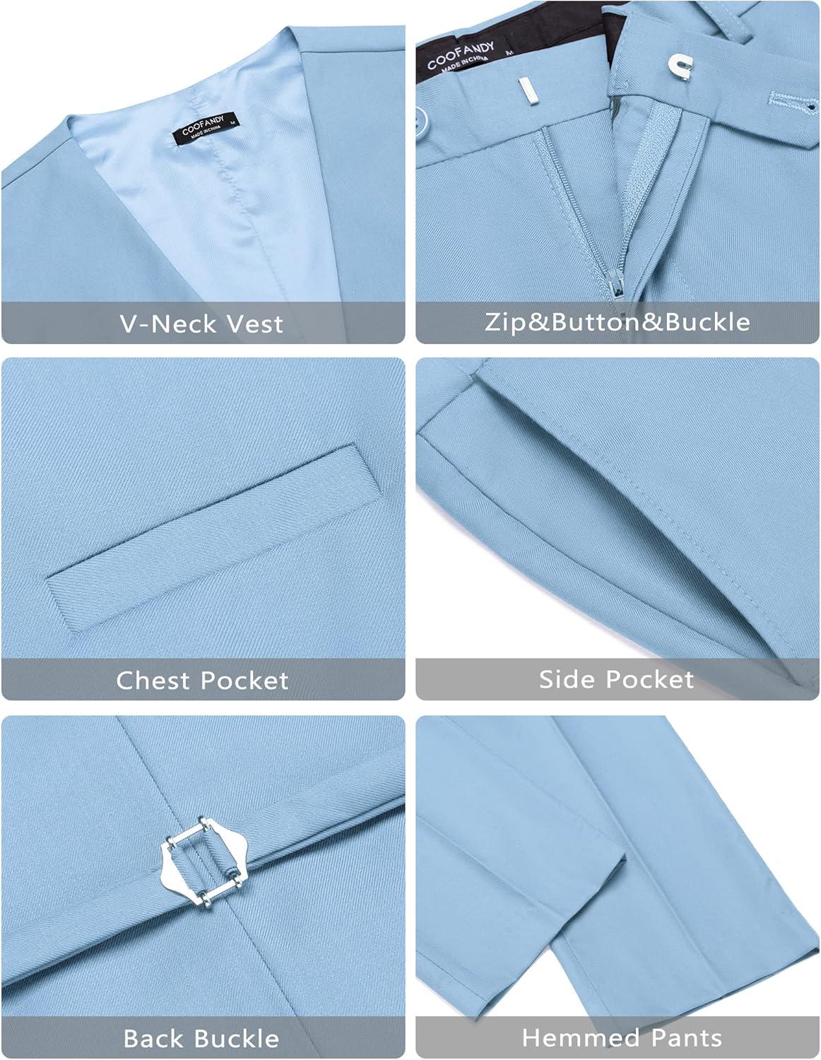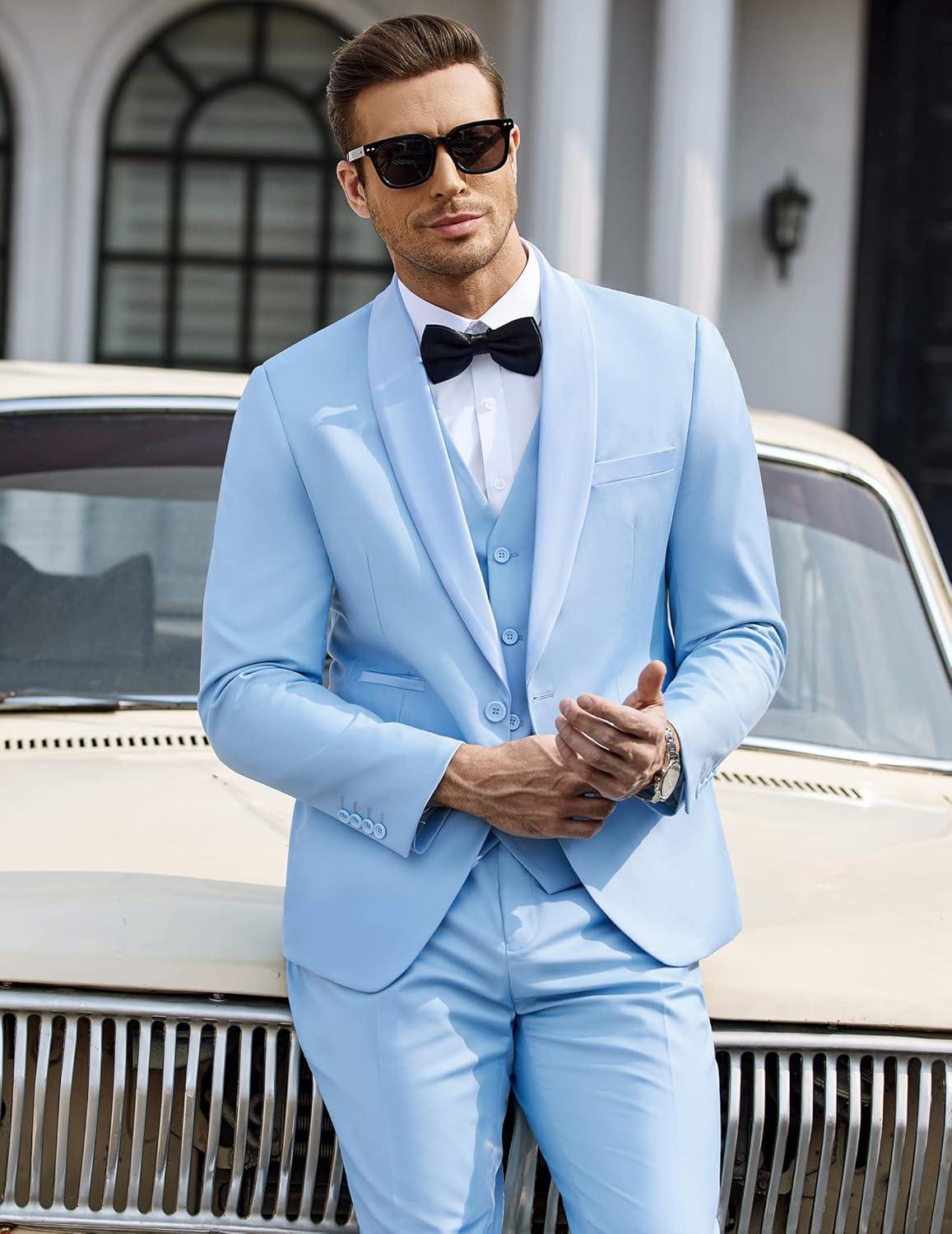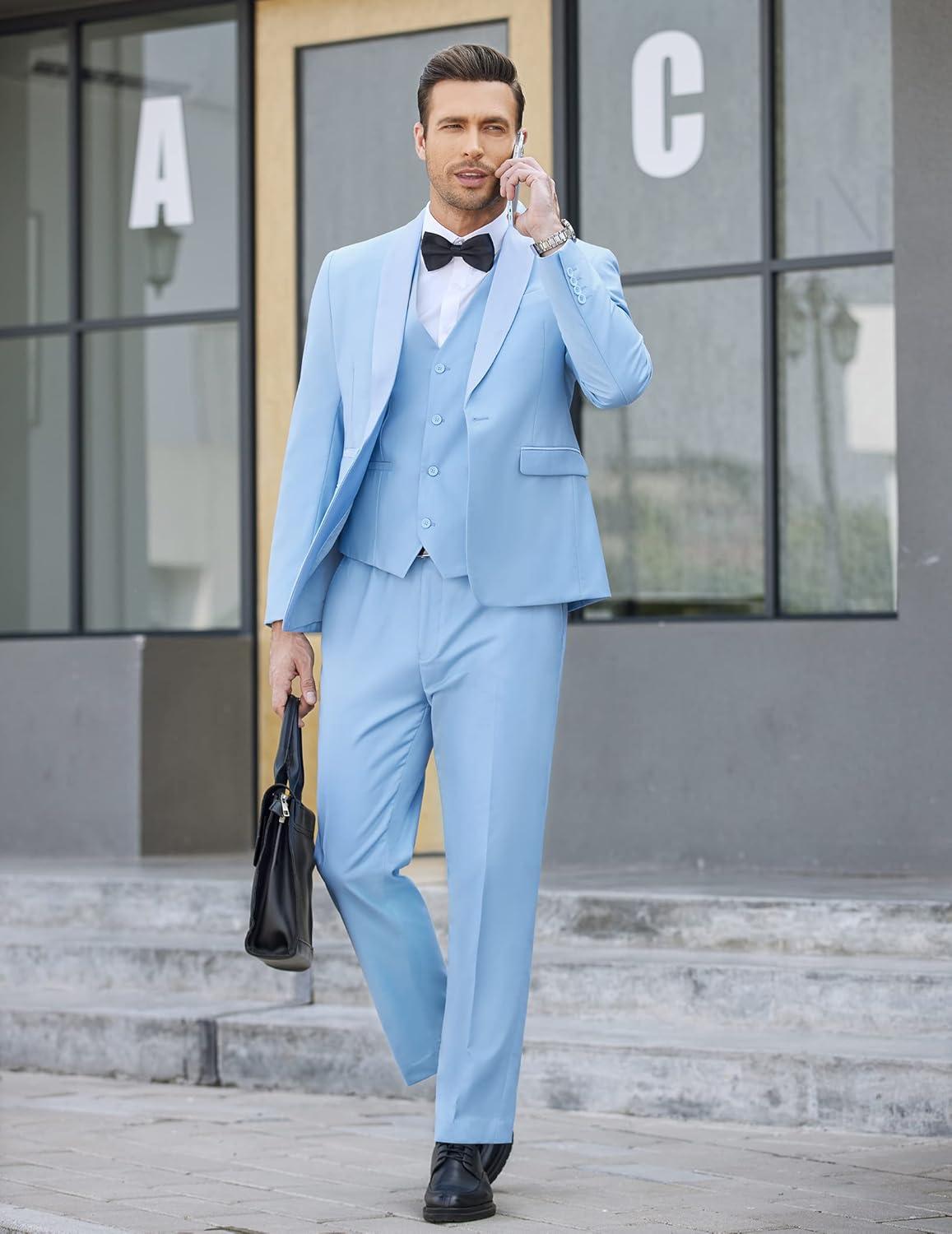 COOFANDY Men’s 3 Pieces Suit Slim Fit Tuxedo Set One Button Shawl Lapel Dinner Prom Jacket Vest Pants with Tie(Sky Blue)