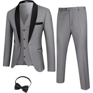COOFANDY Men’s 3 Pieces Suit Slim Fit Tuxedo Set One Button Shawl Lapel Dinner Prom Jacket Vest Pants with Tie(Lgrey/Black)