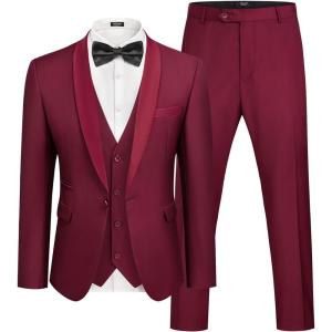 COOFANDY Men’s 3 Pieces Suit Slim Fit Tuxedo Set One Button Shawl Lapel Dinner Prom Jacket Vest Pants with Tie(Wine Red)