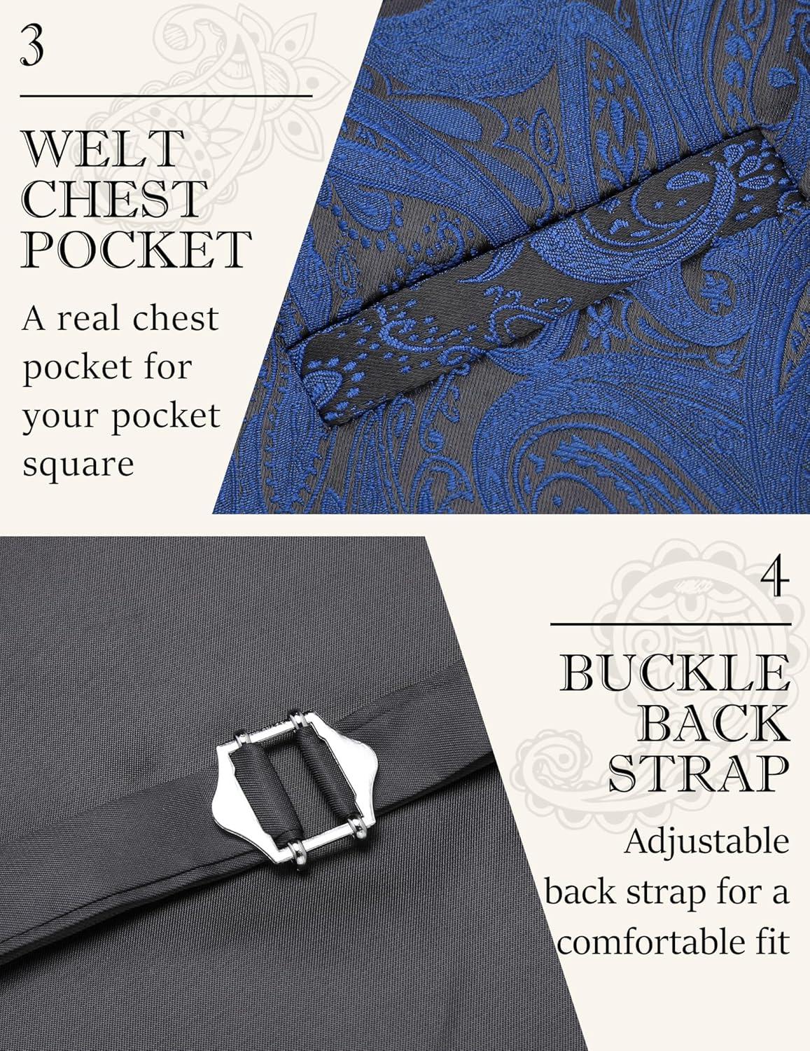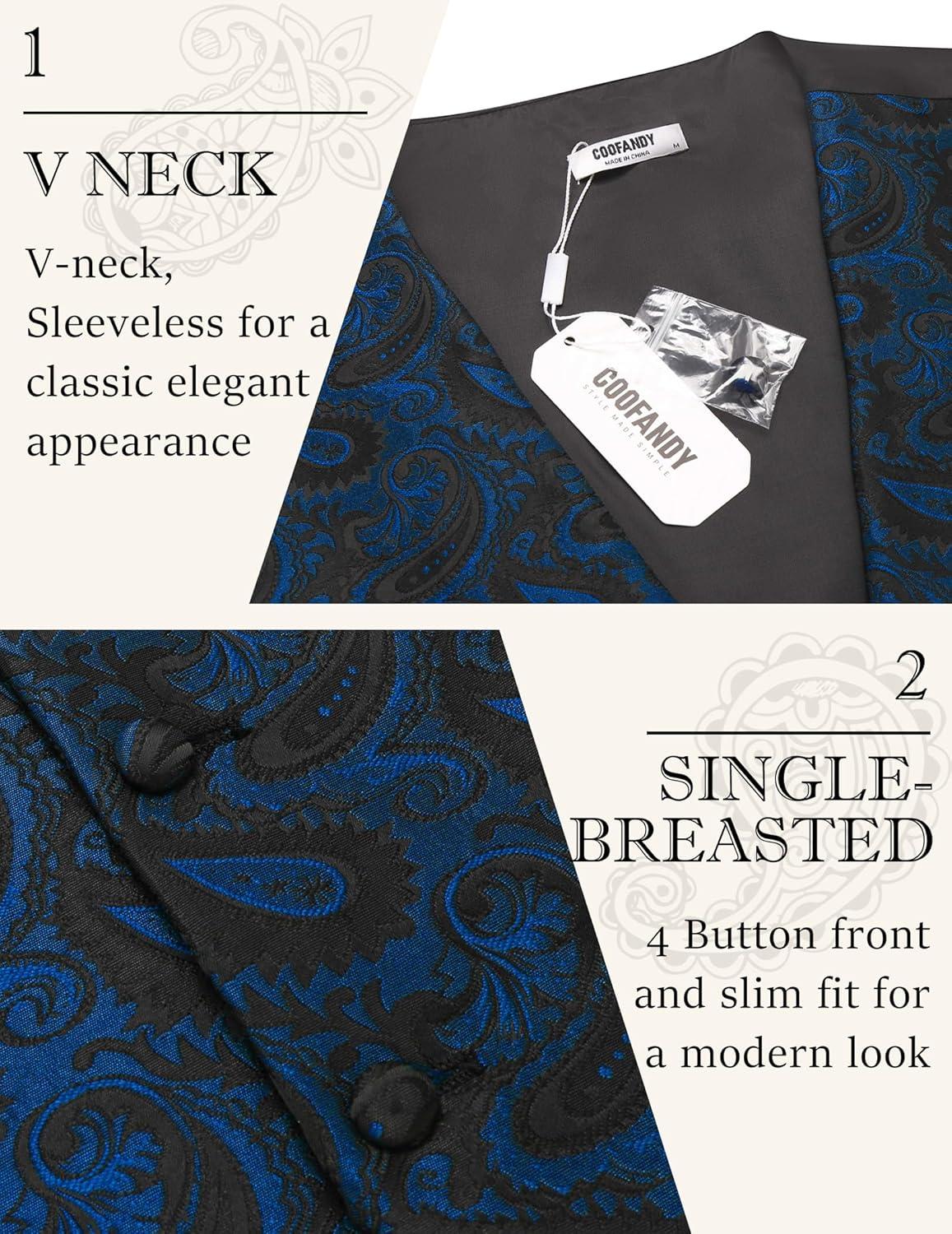 COOFANDY Men’s Suit Vest Tie Set 3PC Paisley Jacquard Waistcoat and Necktie Pocket Square for Holiday Party Wedding(Blue Paisley)