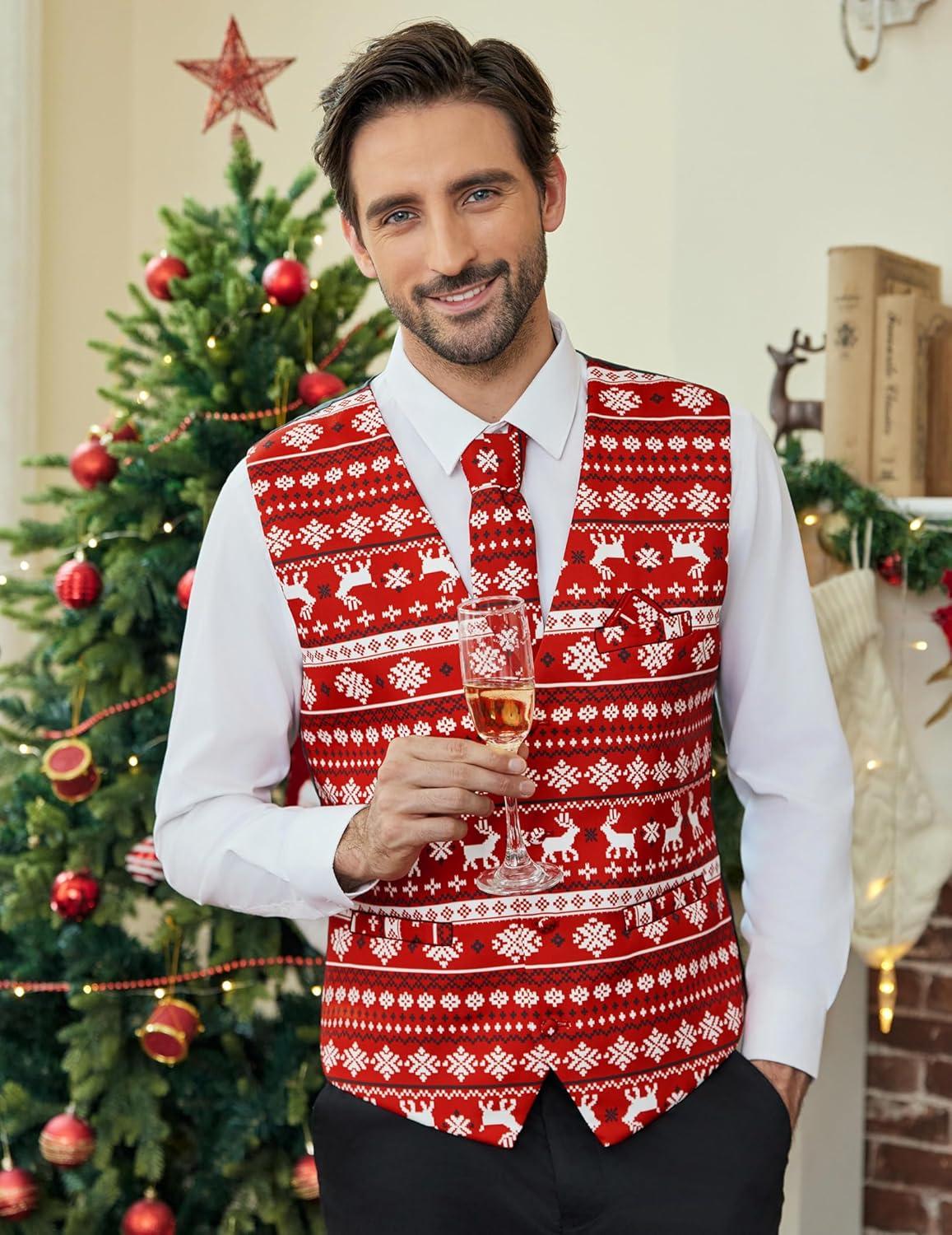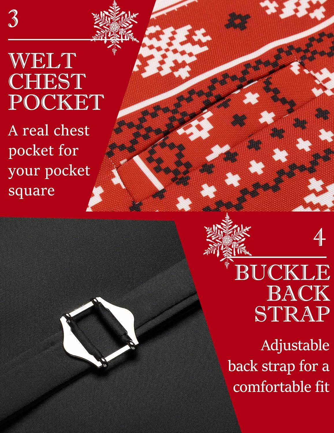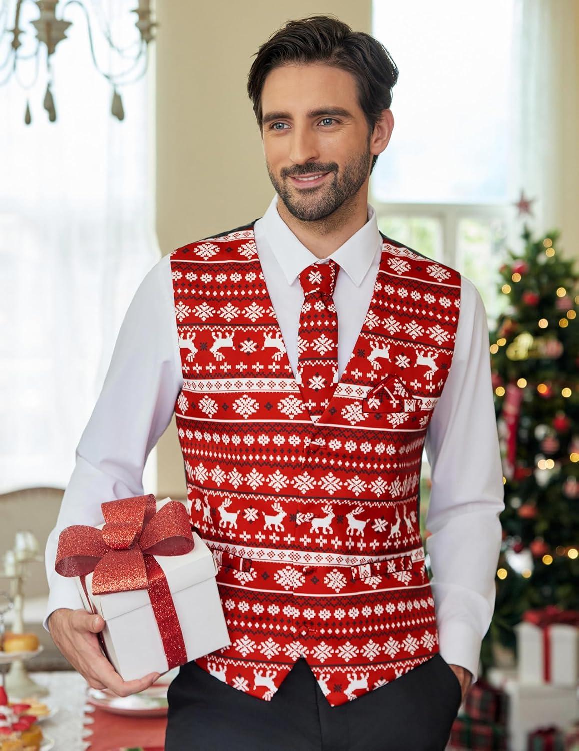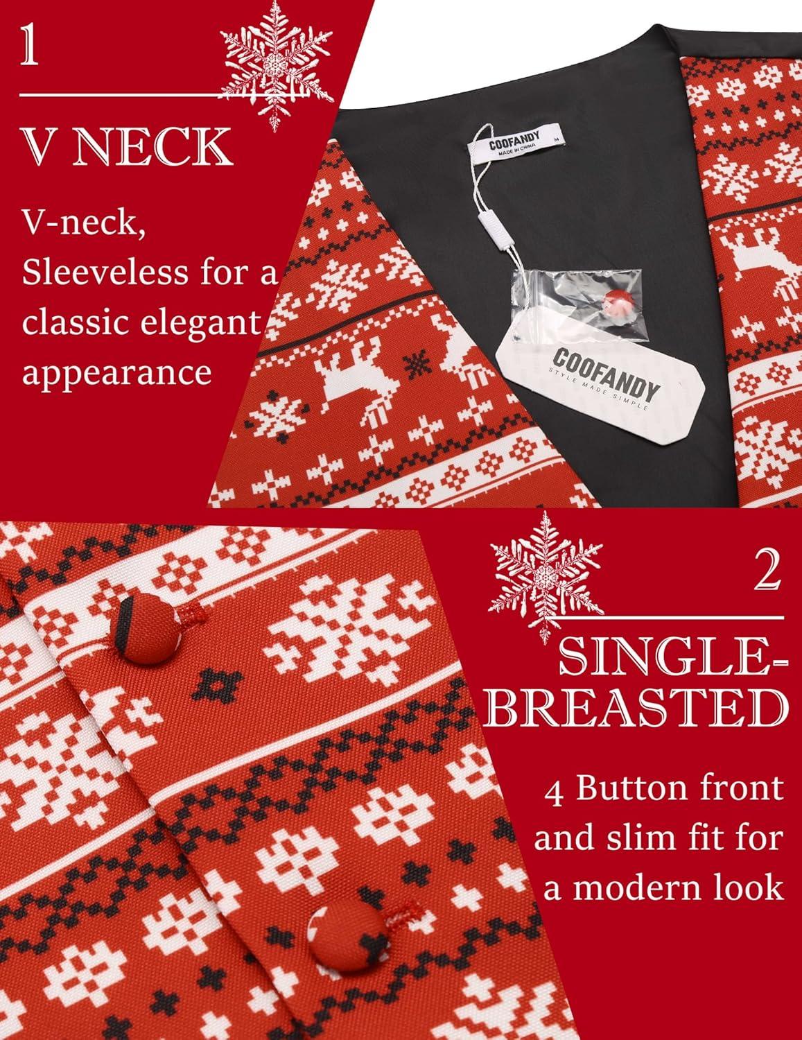 COOFANDY Men’s Suit Vest Tie Set 3PC Paisley Jacquard Waistcoat and Necktie Pocket Square for Holiday Party Wedding(Christmas Reindeer Snowflake)