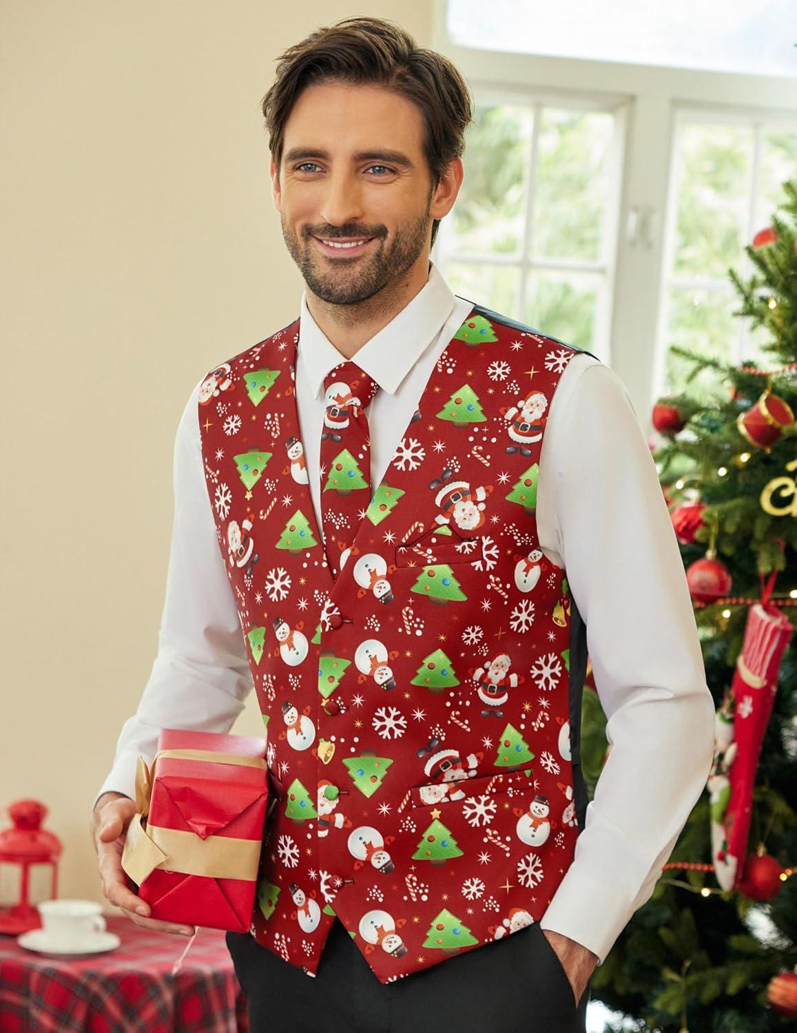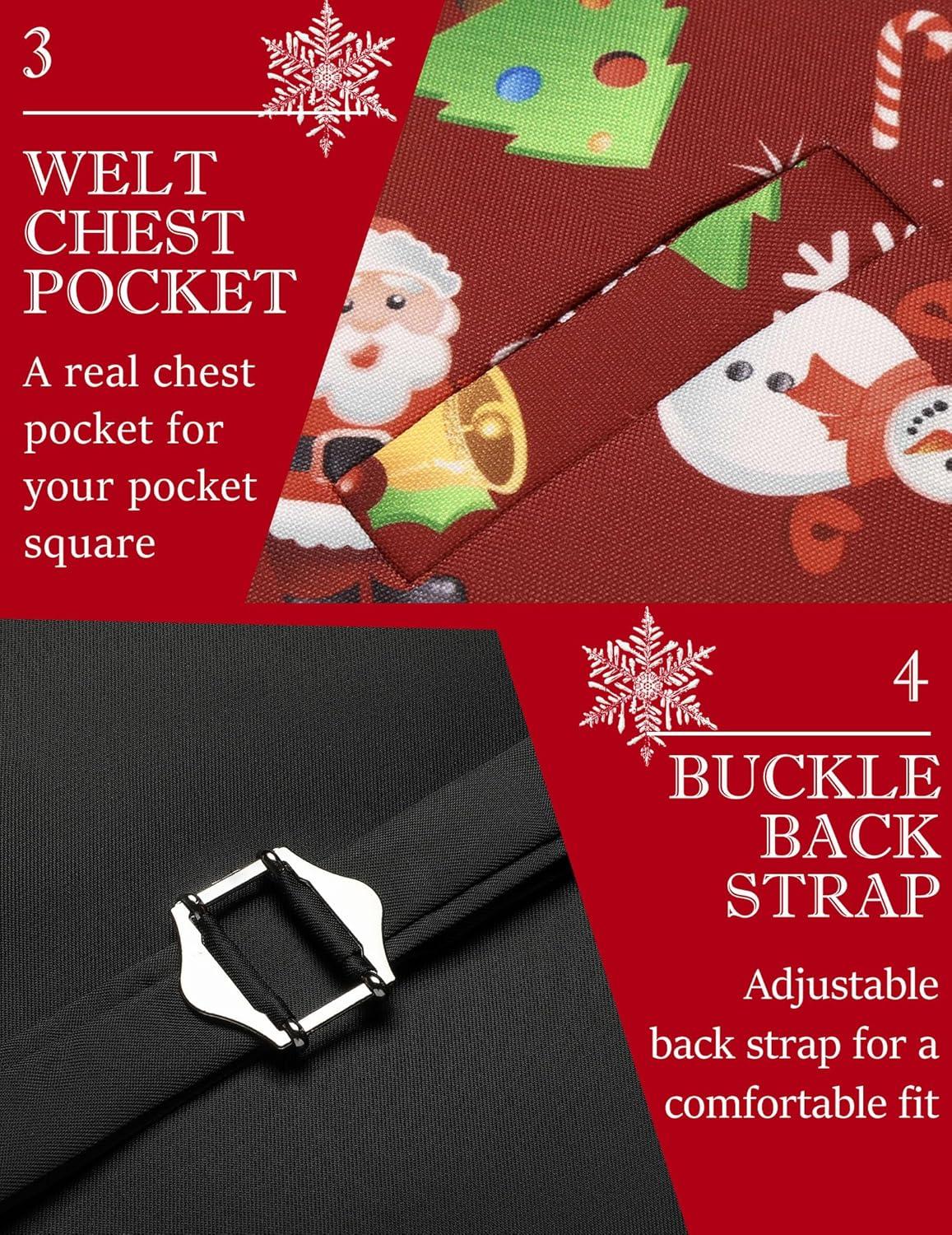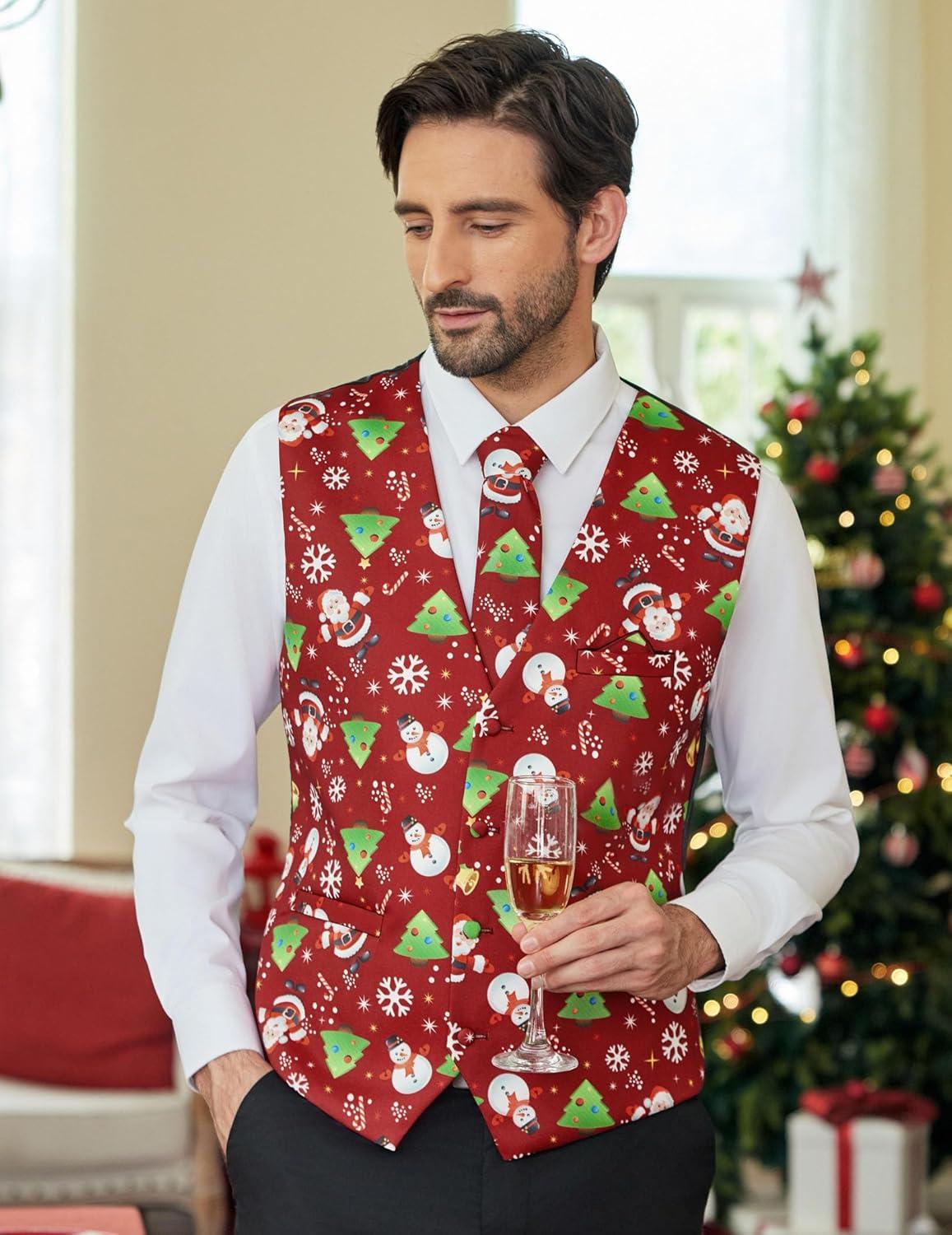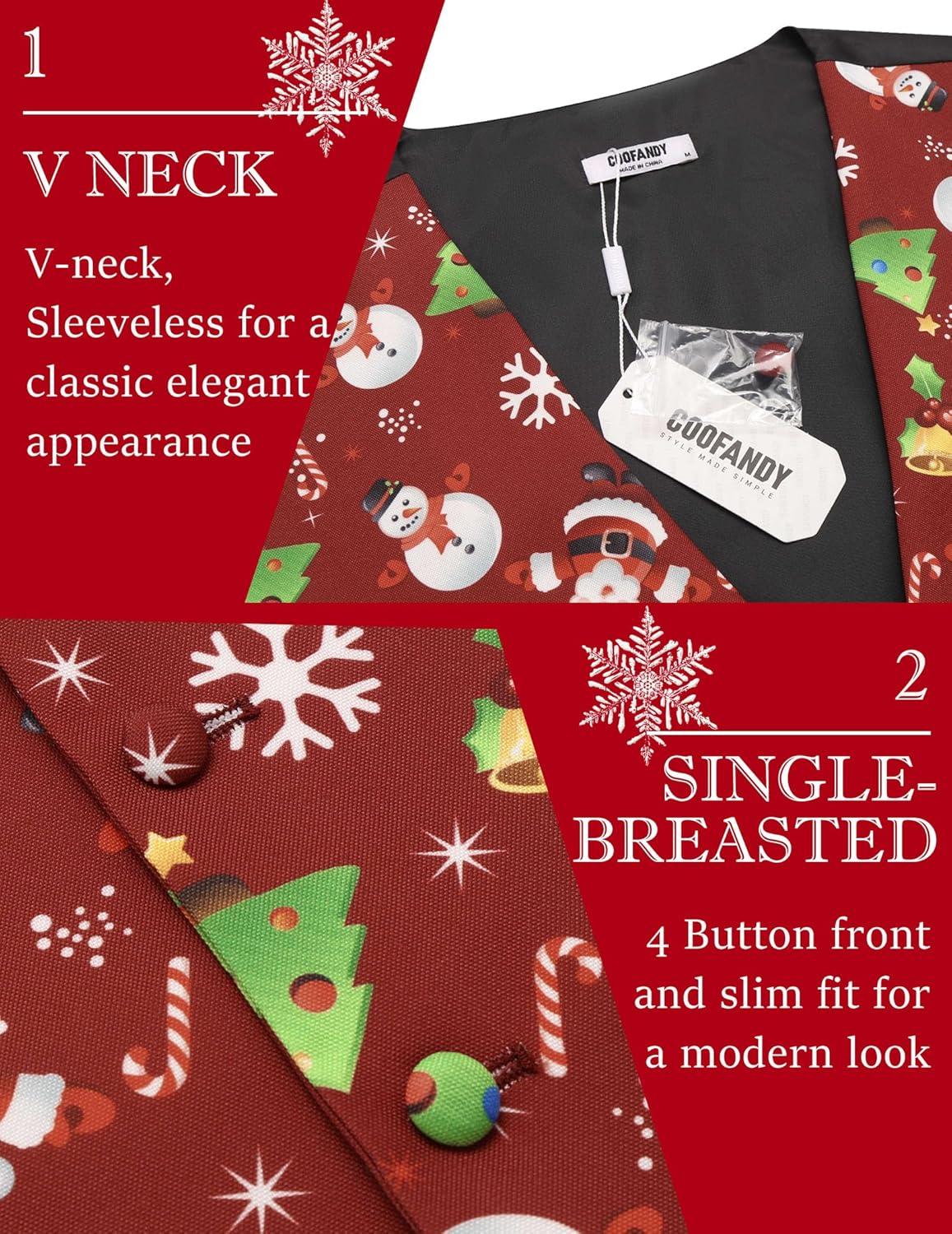 COOFANDY Men’s Suit Vest Tie Set 3PC Paisley Jacquard Waistcoat and Necktie Pocket Square for Holiday Party Wedding(Christmas Tree)