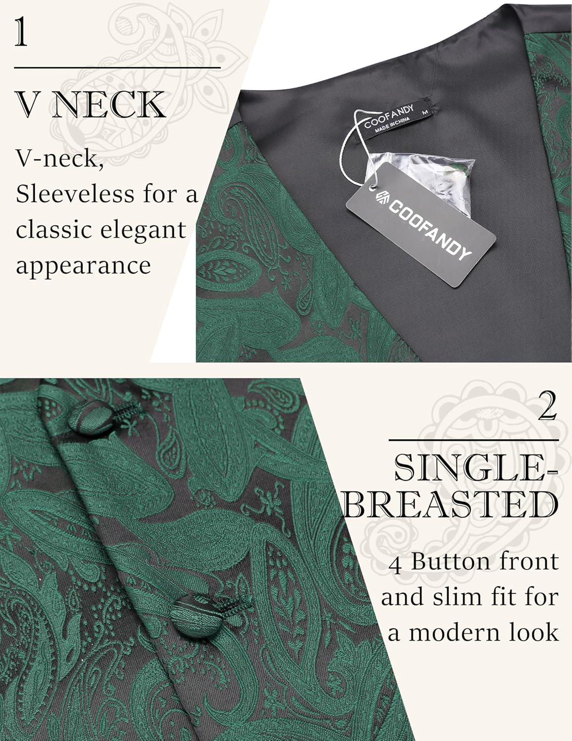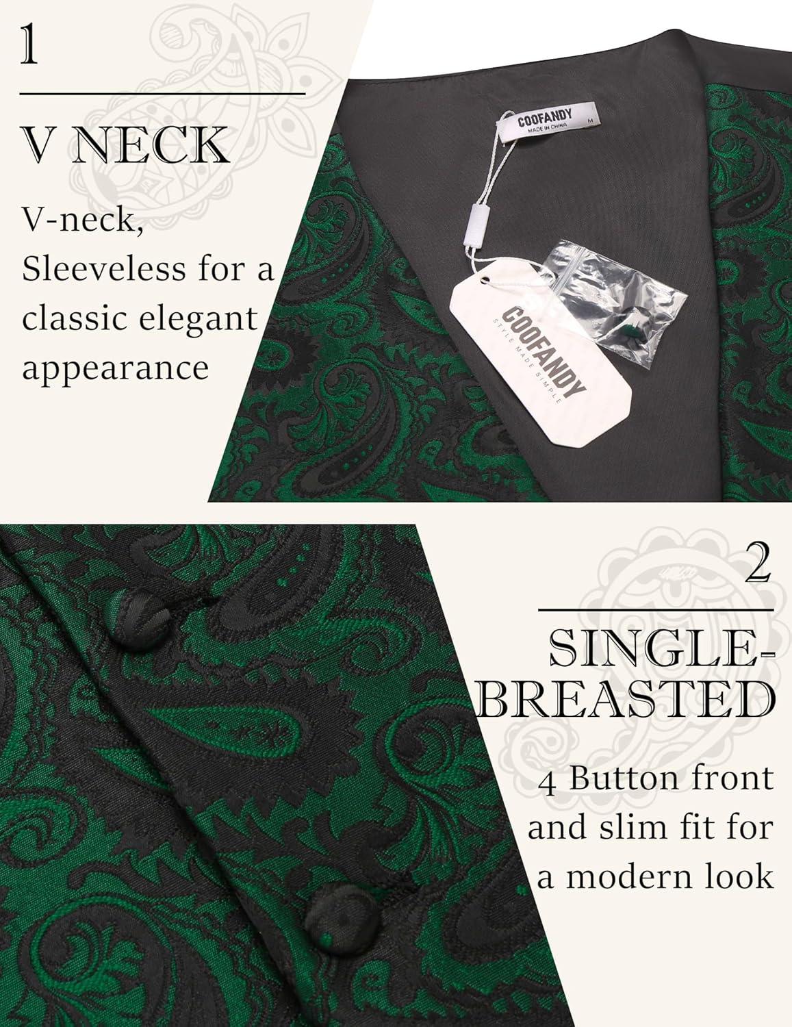 COOFANDY Men’s Suit Vest Tie Set 3PC Paisley Jacquard Waistcoat and Necktie Pocket Square for Holiday Party Wedding(Green Paisley)