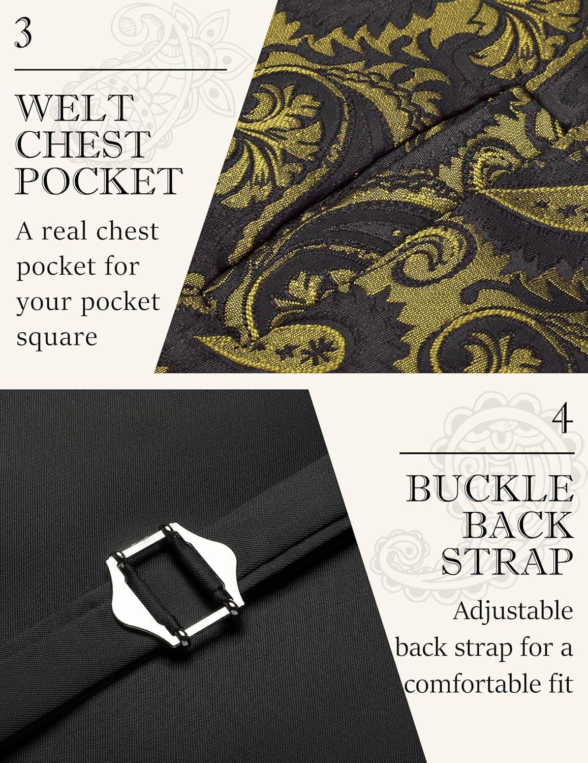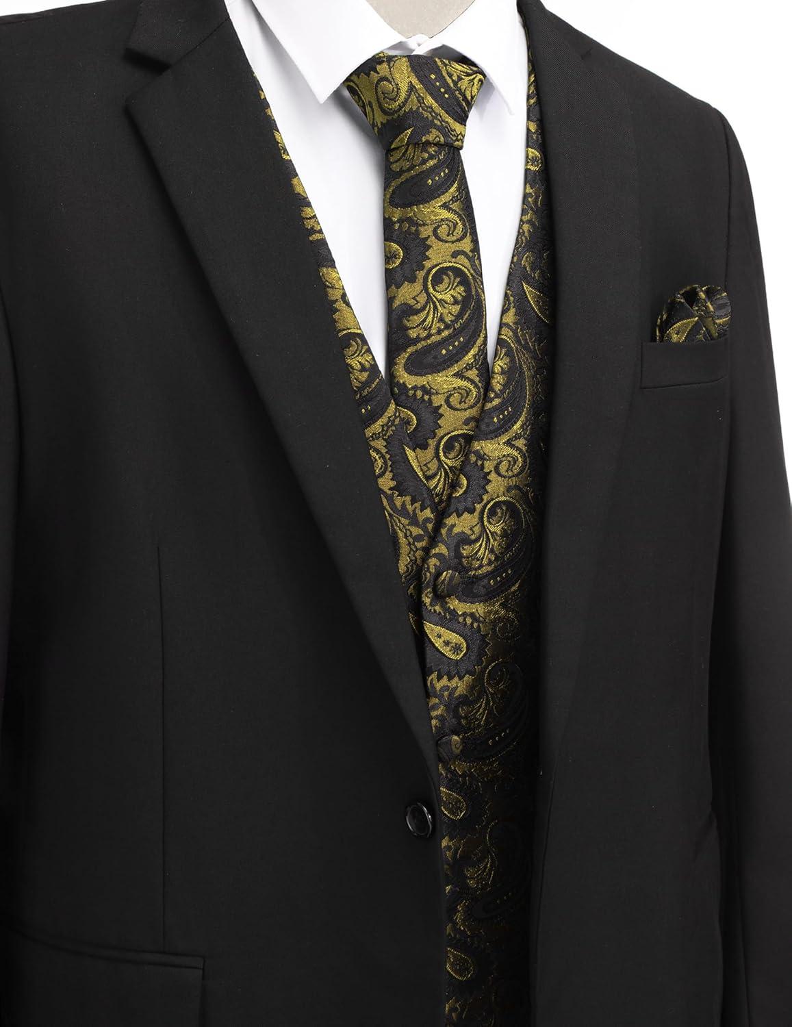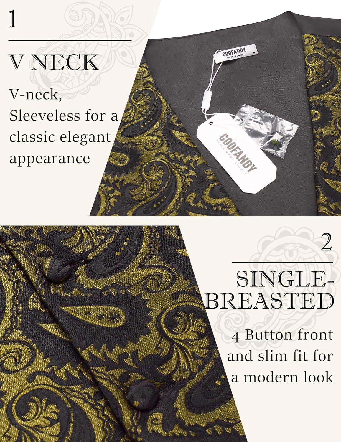 COOFANDY Men’s Suit Vest Tie Set 3PC Paisley Jacquard Waistcoat and Necktie Pocket Square for Holiday Party Wedding(Golden Paisley)