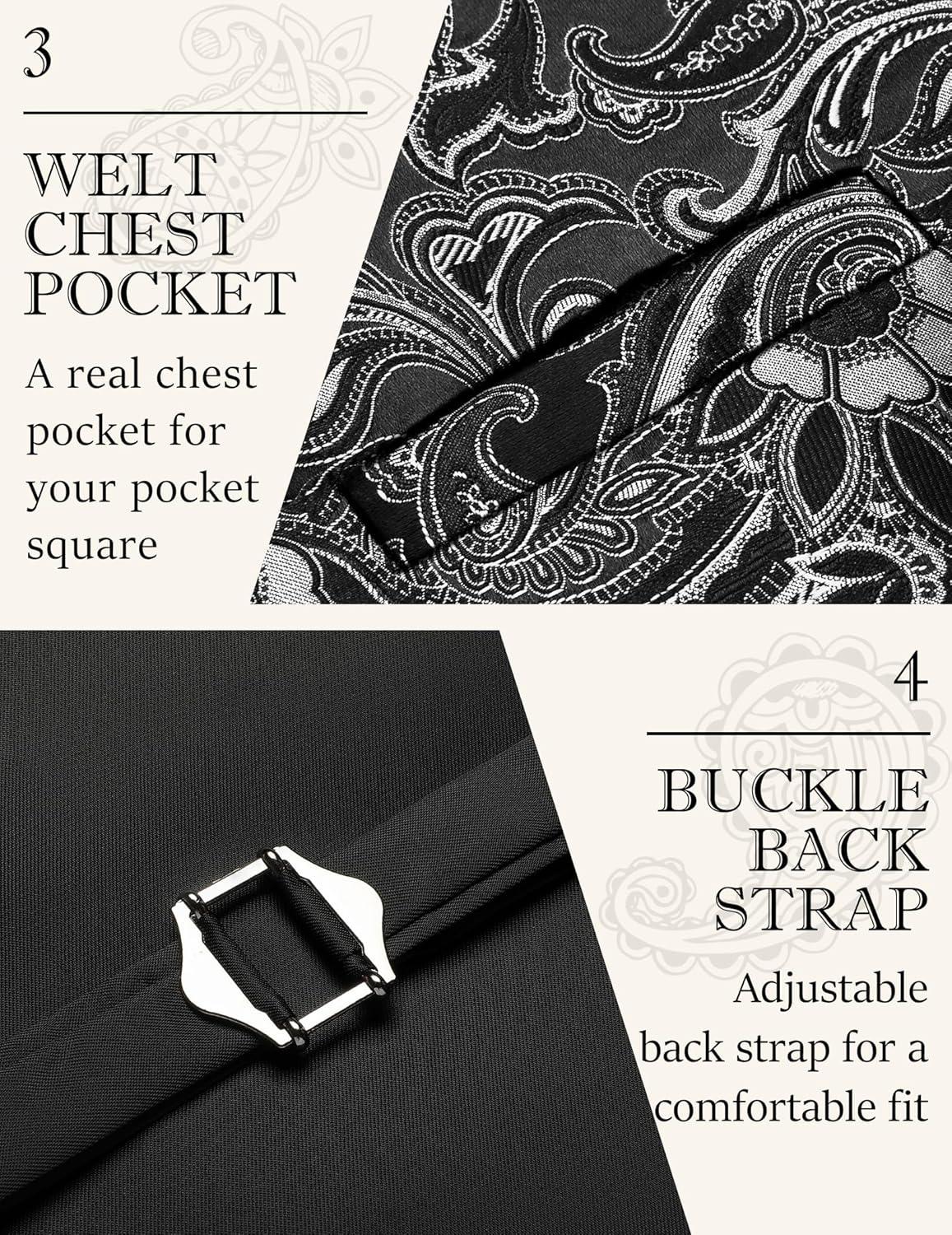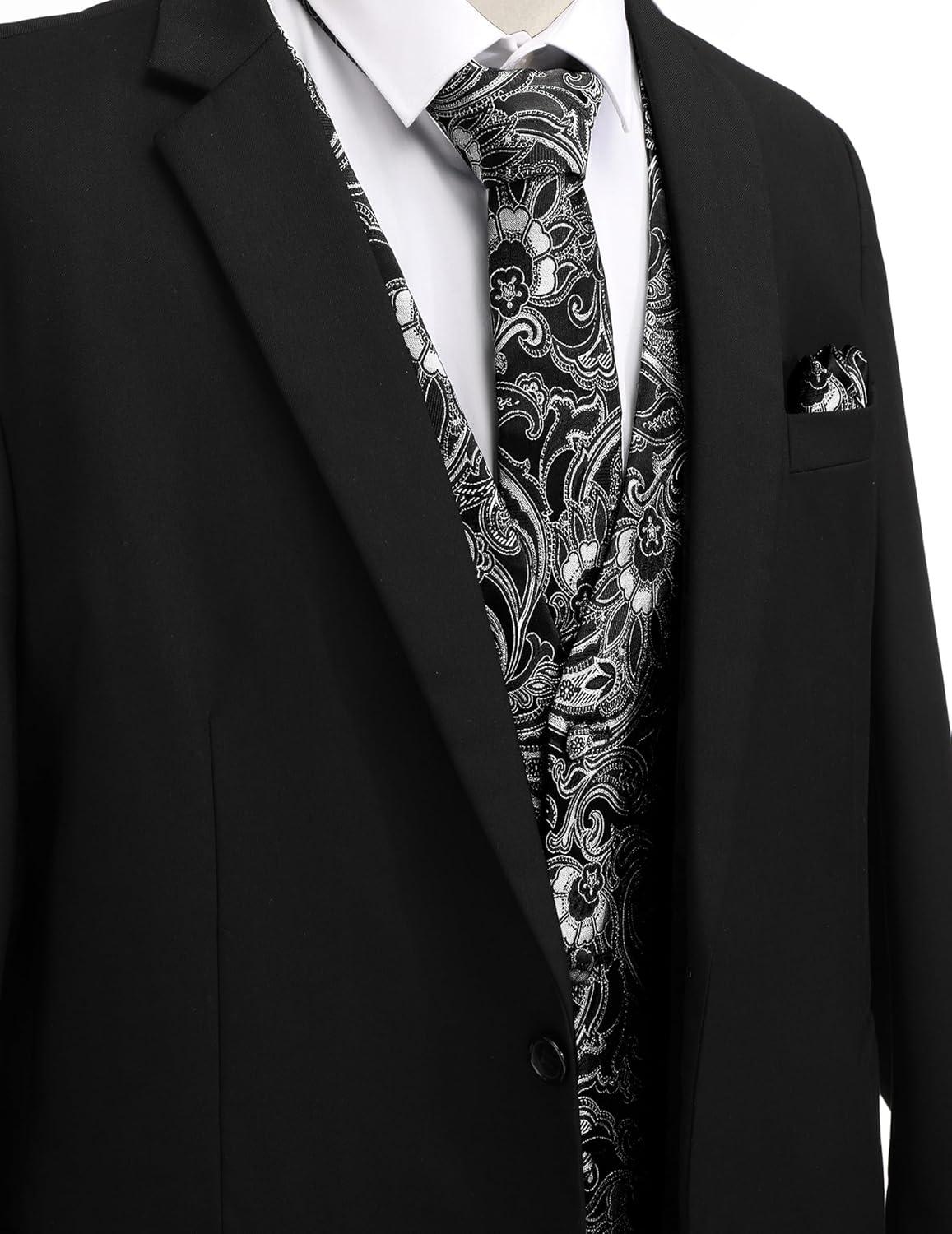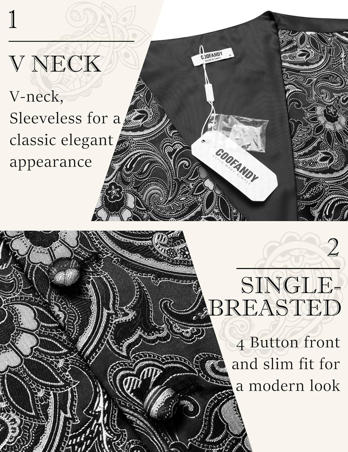 COOFANDY Men’s Suit Vest Tie Set 3PC Paisley Jacquard Waistcoat and Necktie Pocket Square for Holiday Party Wedding(Silver)