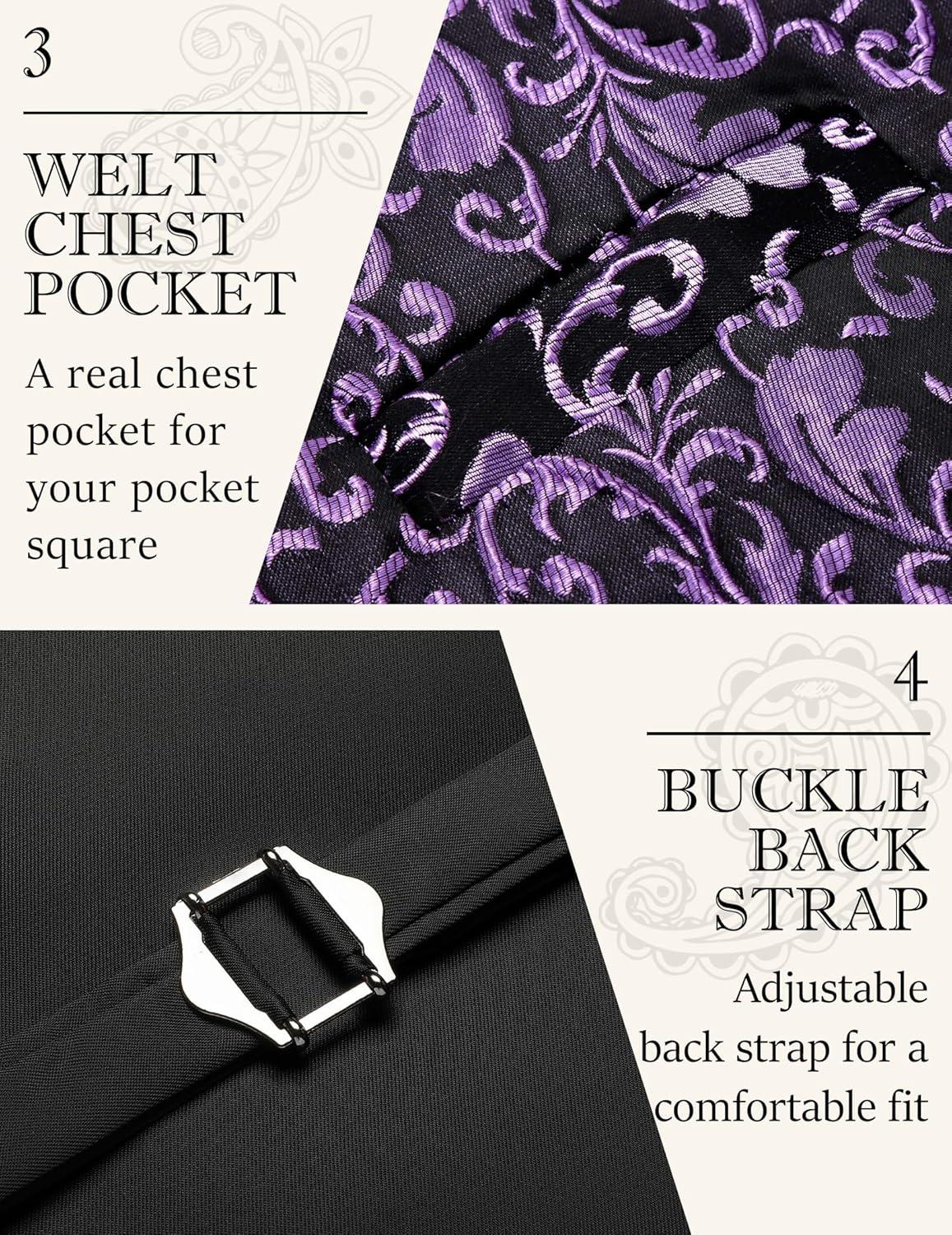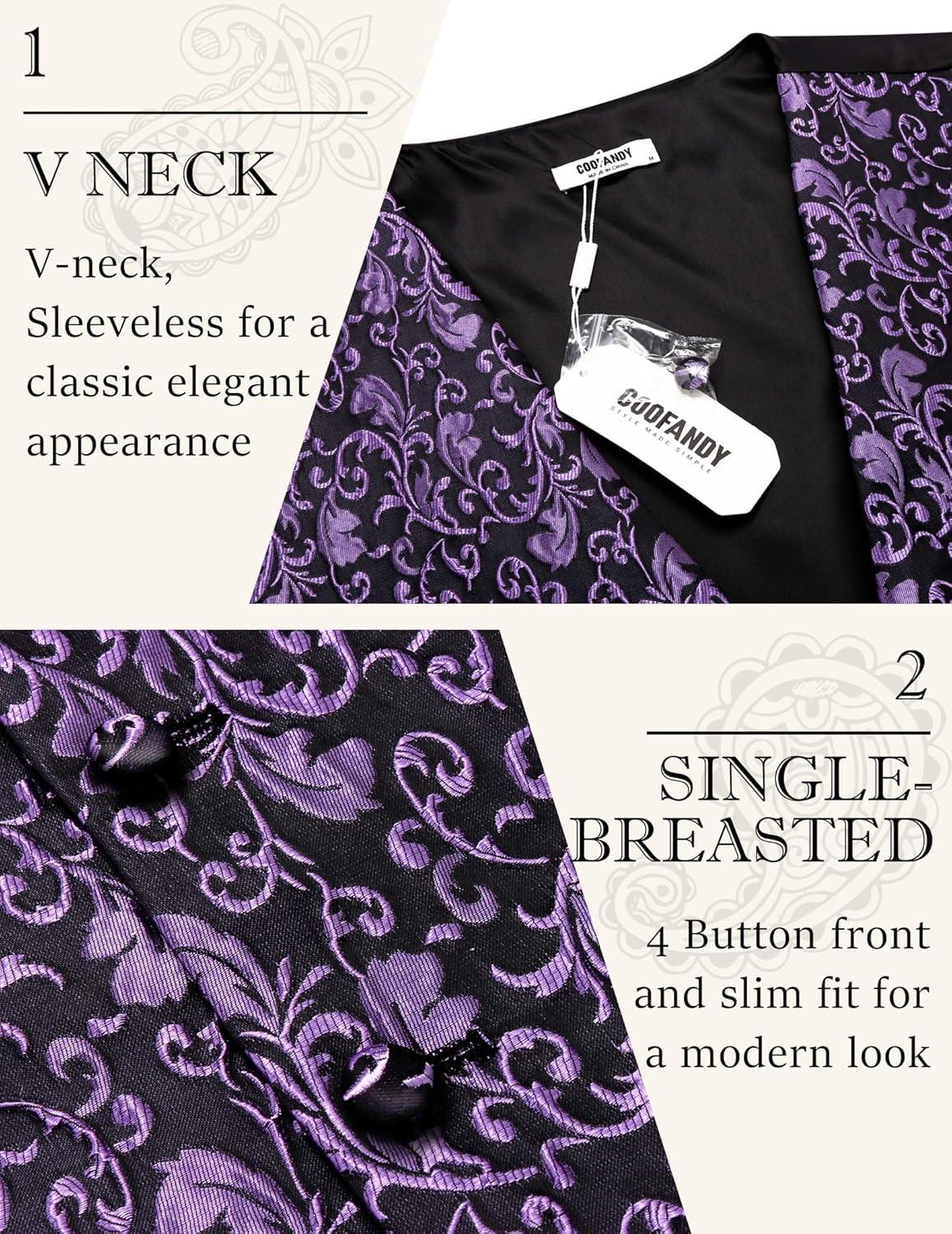 COOFANDY Men’s Suit Vest Tie Set 3PC Paisley Jacquard Waistcoat and Necktie Pocket Square for Holiday Party Wedding(Purple)