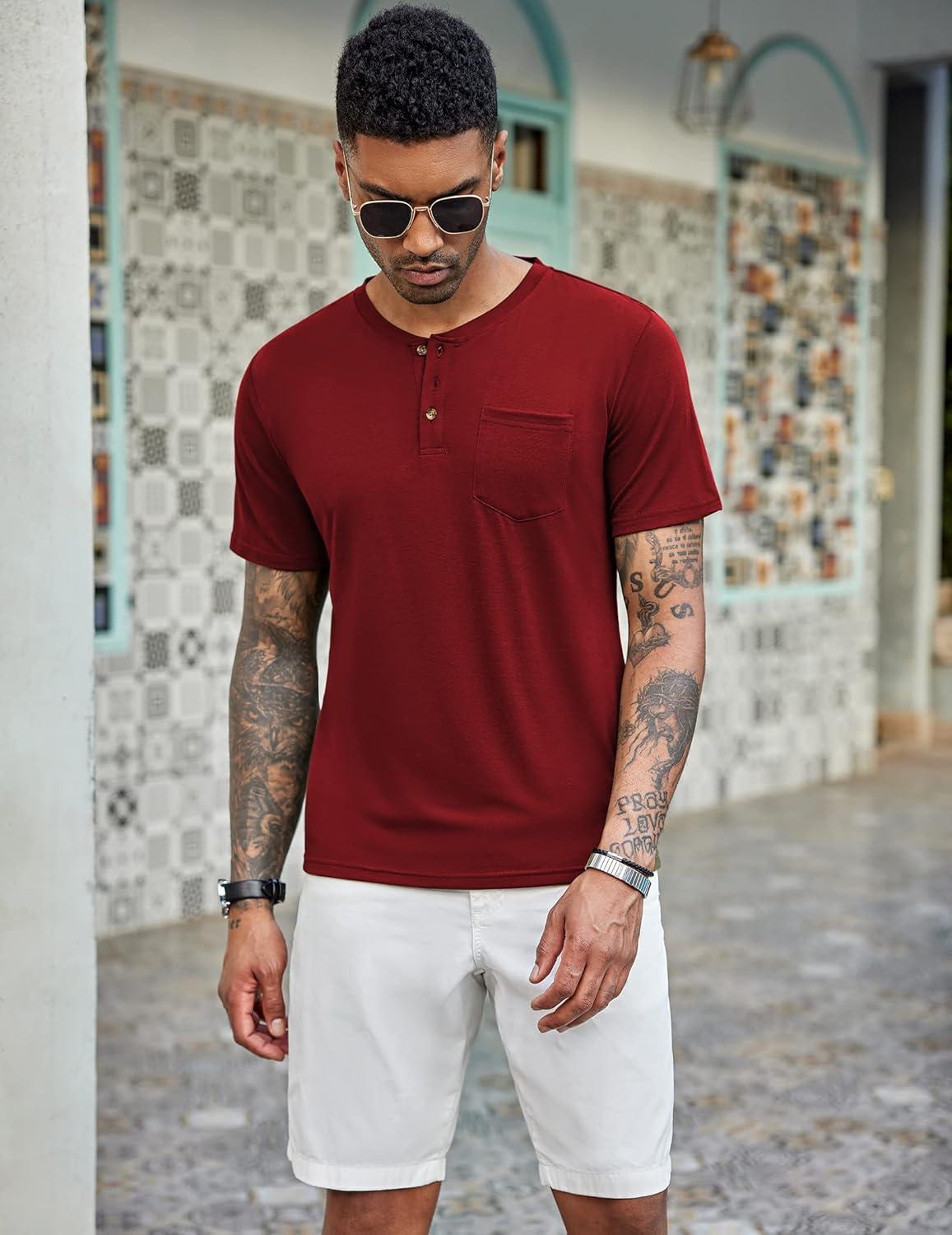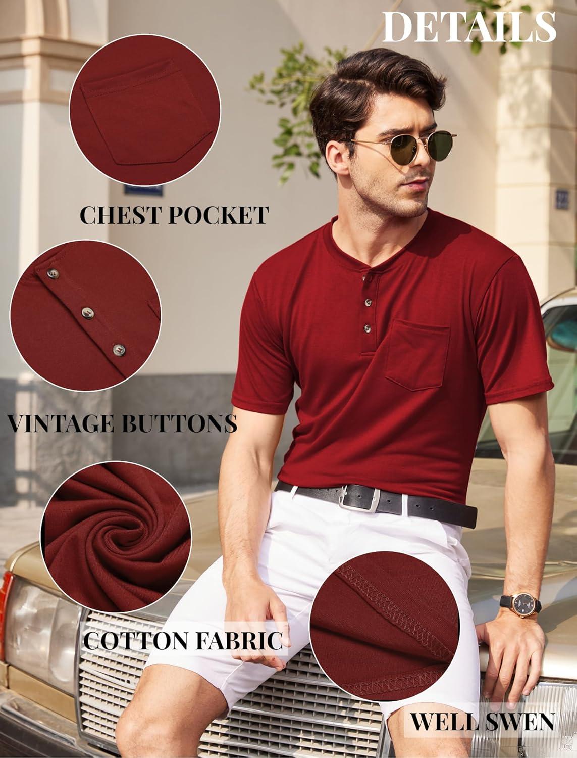COOFANDY Men’s 3 Pack Henley Shirts Short Sleeve Casual Basic Tees Classic Henley Summer Solid T Shirts with Pocket(1 Pack: Wine Red)