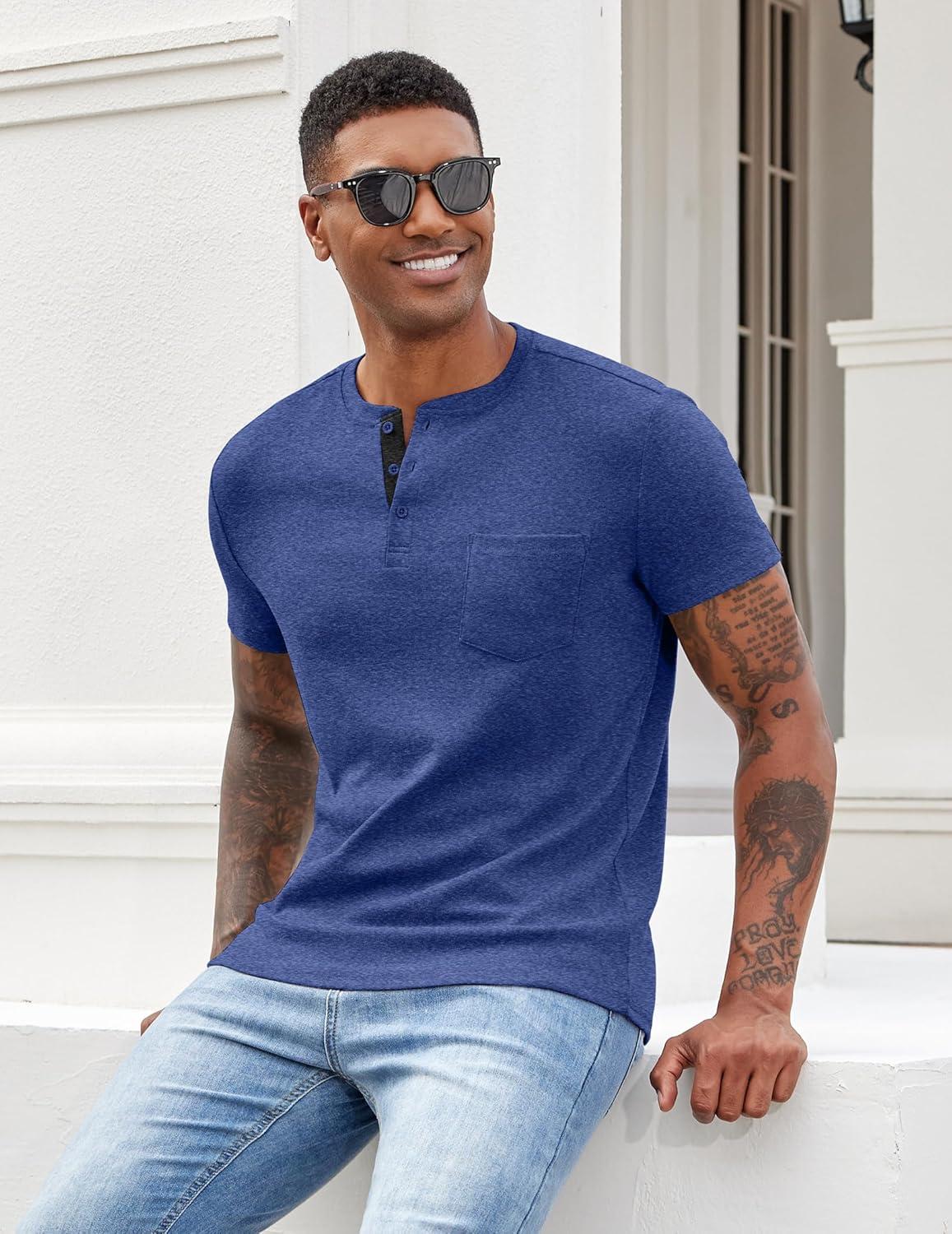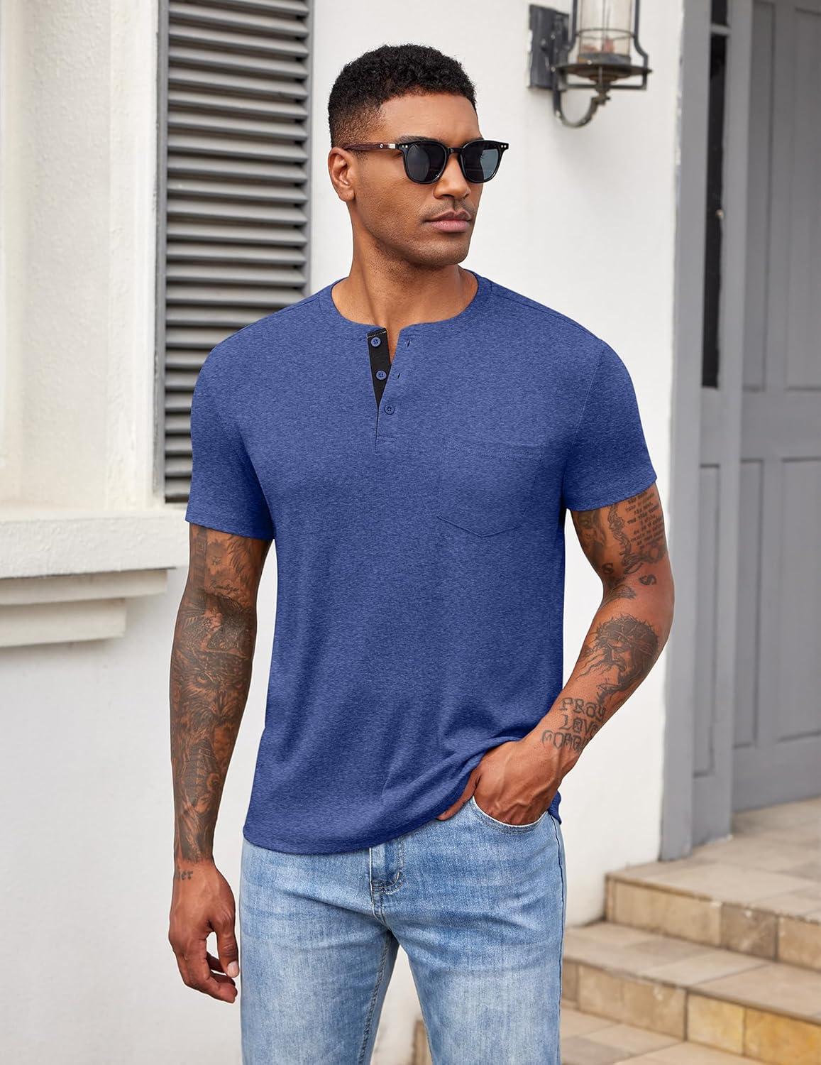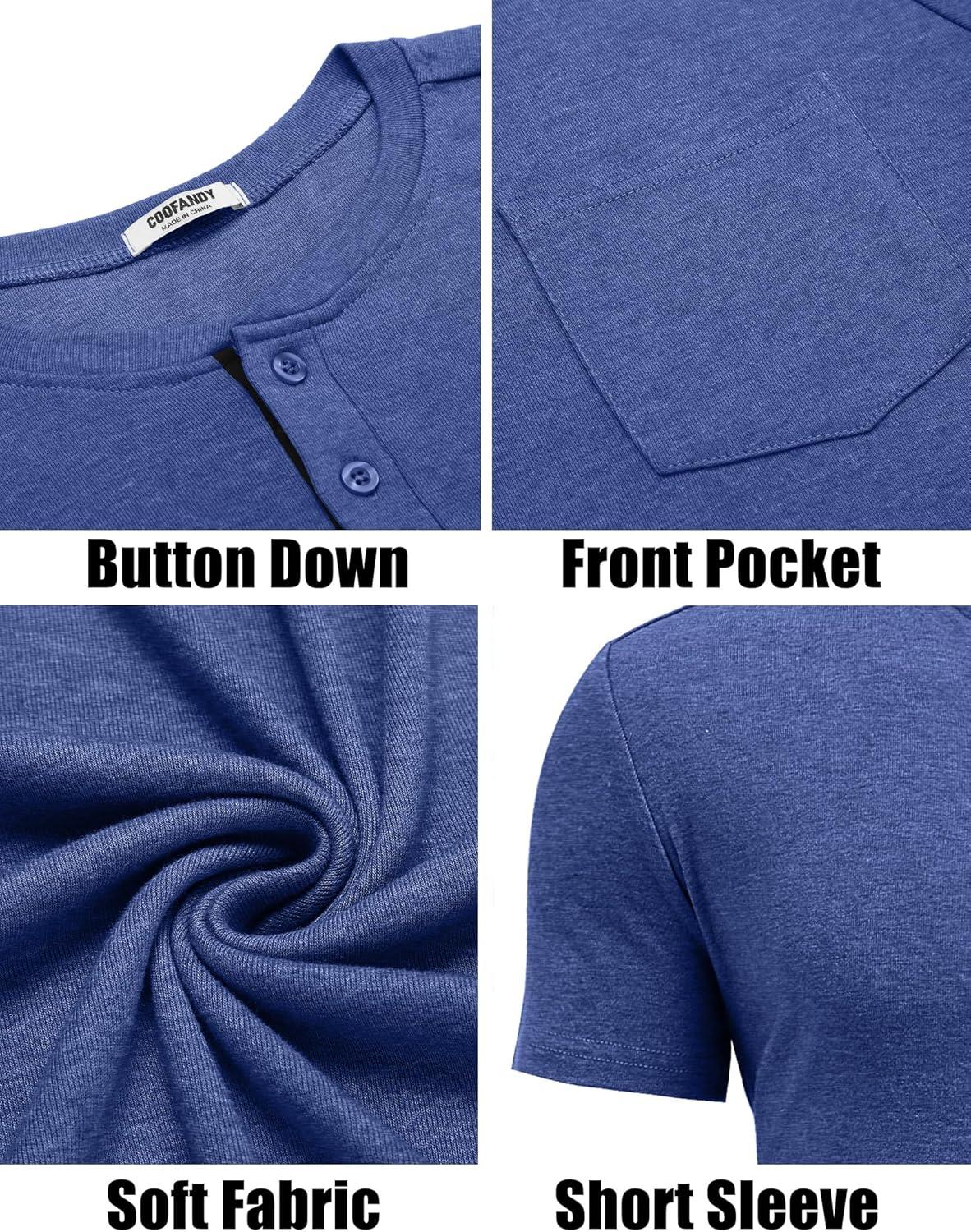 COOFANDY Men’s 3 Pack Henley Shirts Short Sleeve Casual Basic Tees Classic Henley Summer Solid T Shirts with Pocket(Blue)