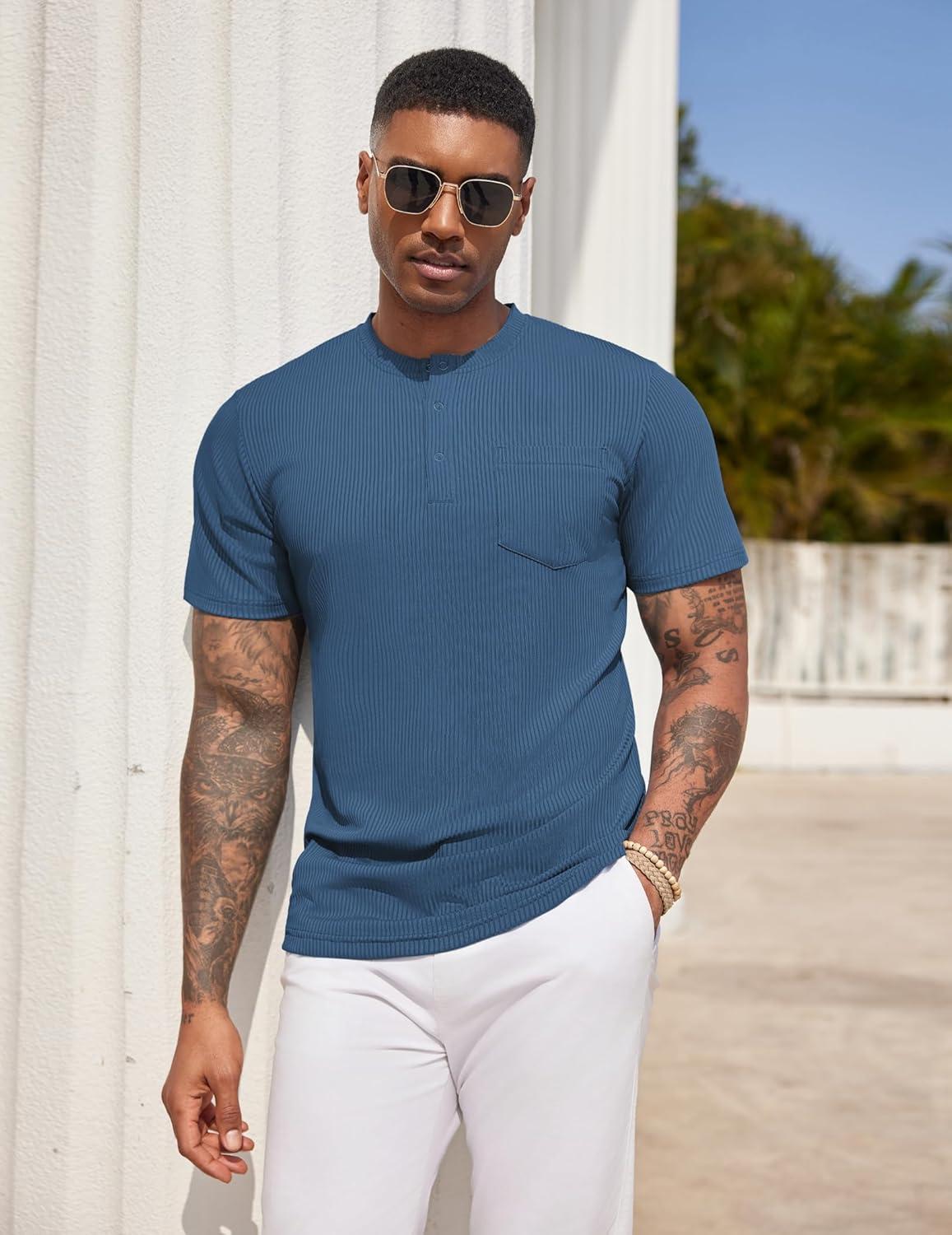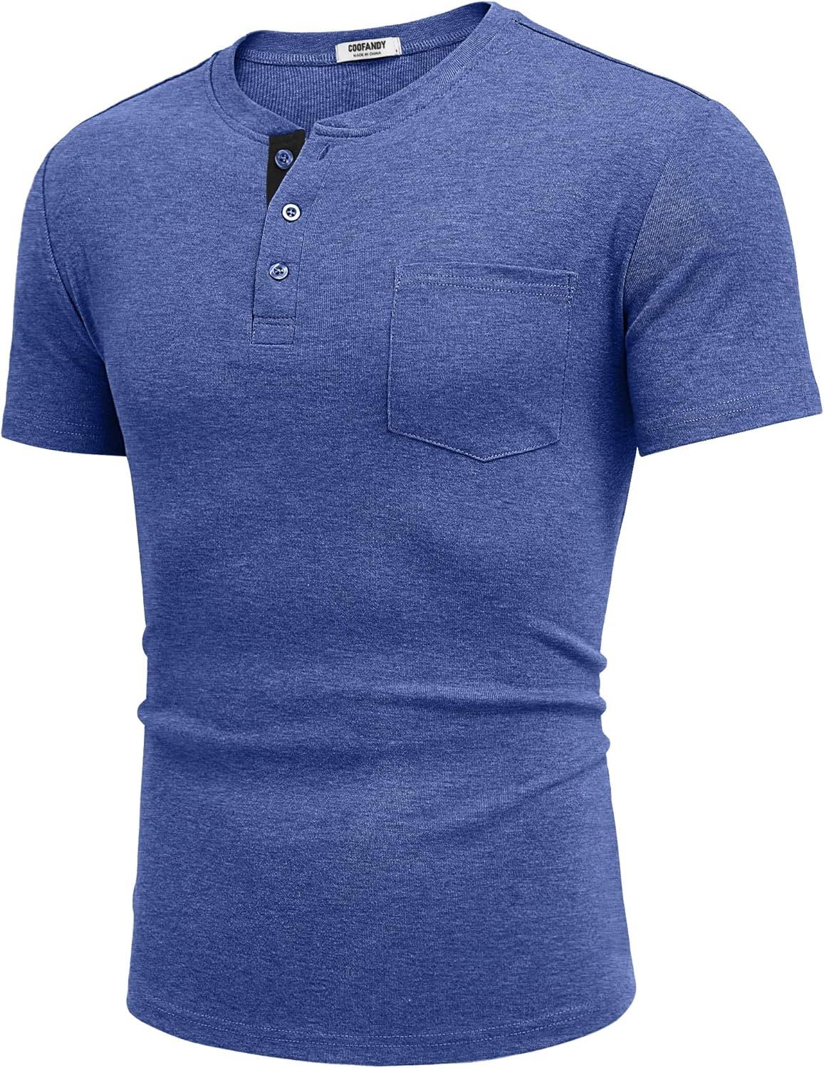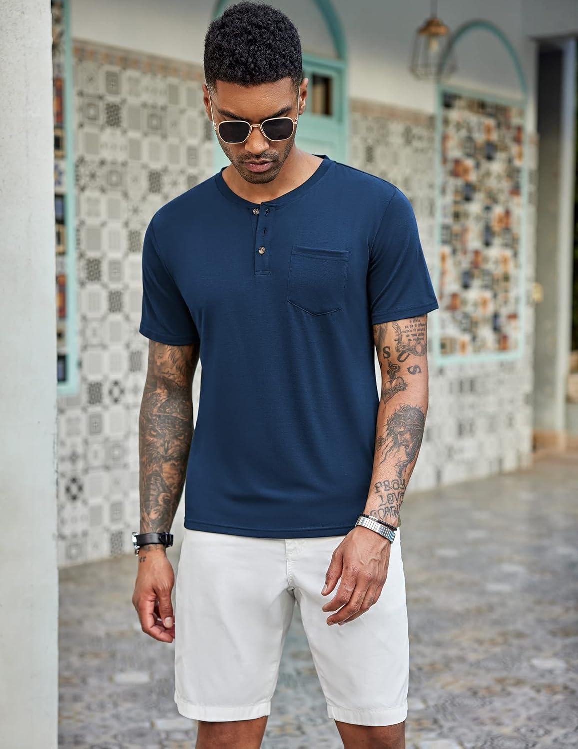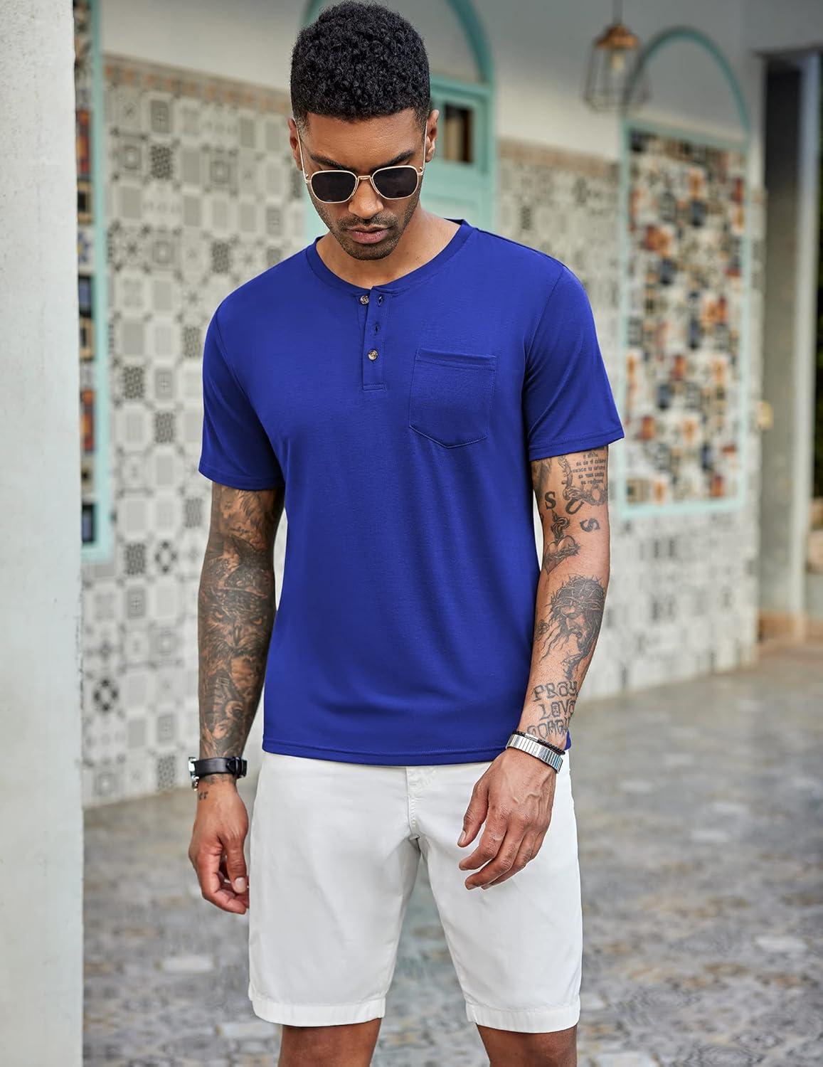 COOFANDY Men’s 3 Pack Henley Shirts Short Sleeve Casual Basic Tees Classic Henley Summer Solid T Shirts with Pocket(Blue)