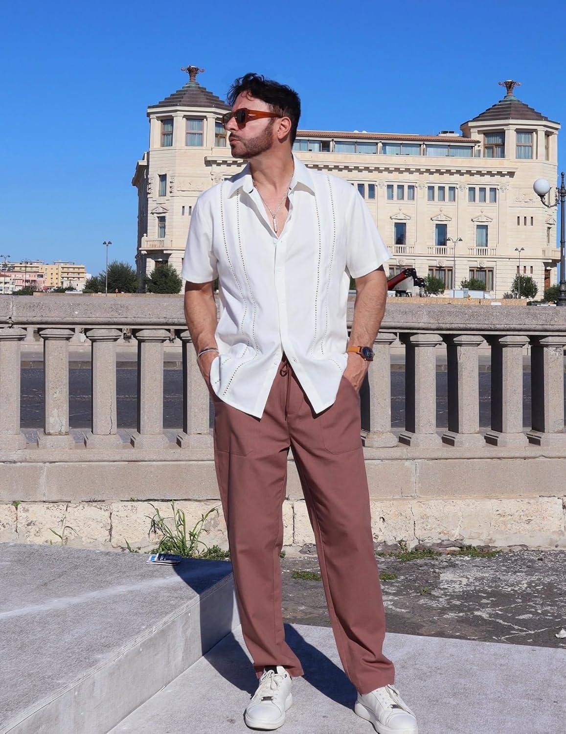 COOFANDY Men’s Cuban Guayabera Shirt Casual Short Sleeve Button Down Shirts Summer Beach Shirts(Pink)