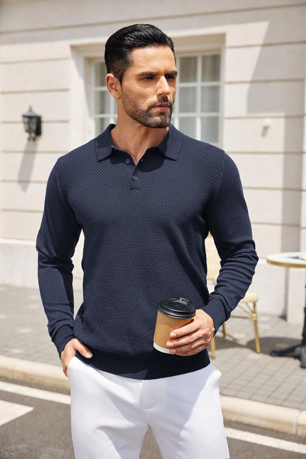 COOFANDY Men’s Knit Polo Sweater Long Sleeve Casual Collared Quarter Button Golf Waffle Textured Sweater(Dark Navy Blue-1)