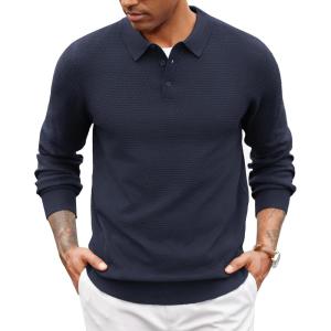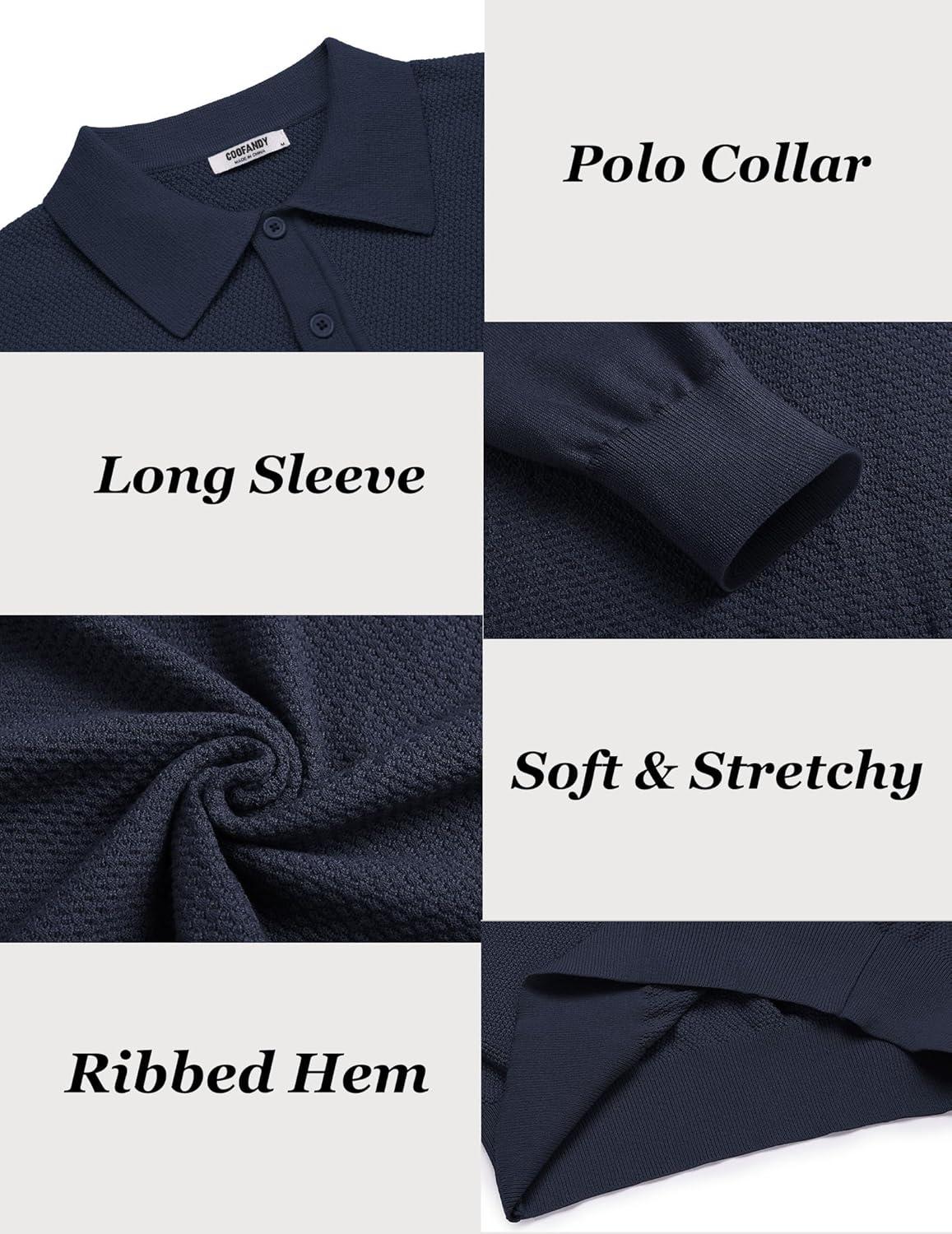 COOFANDY Men’s Knit Polo Sweater Long Sleeve Casual Collared Quarter Button Golf Waffle Textured Sweater(Dark Navy Blue)