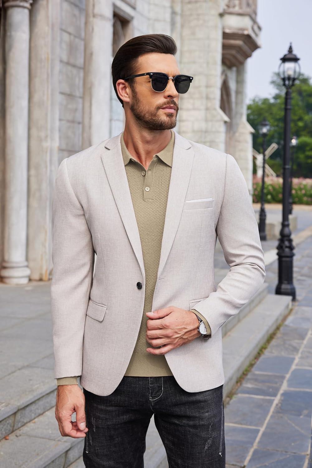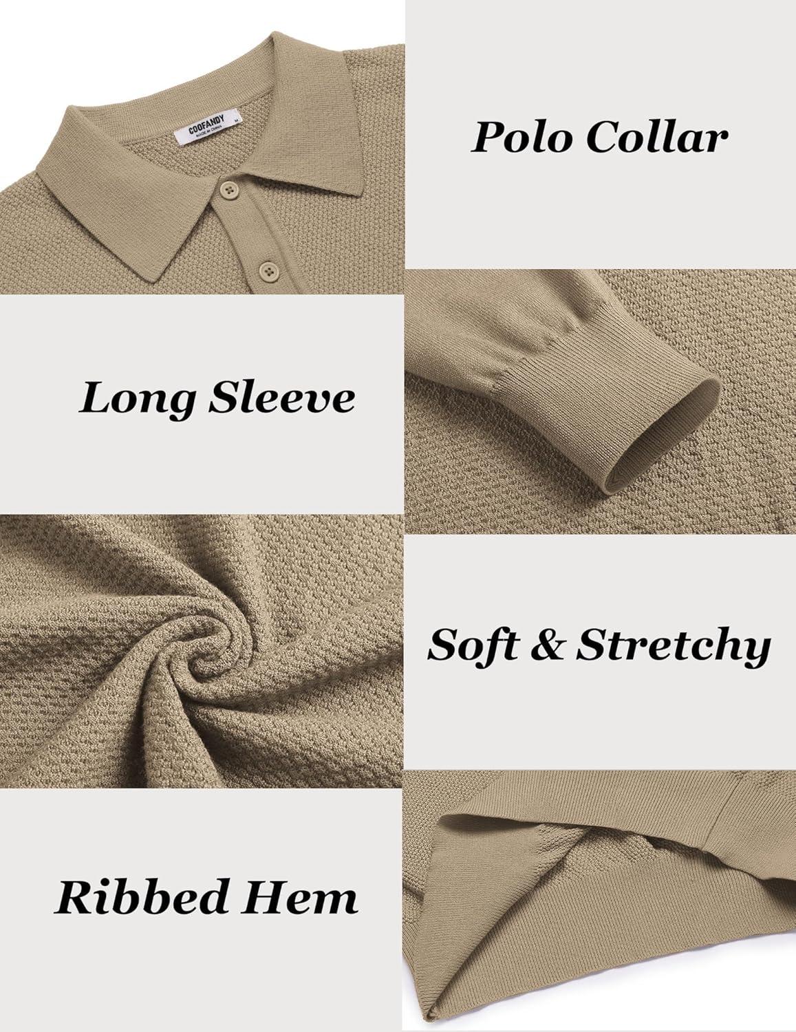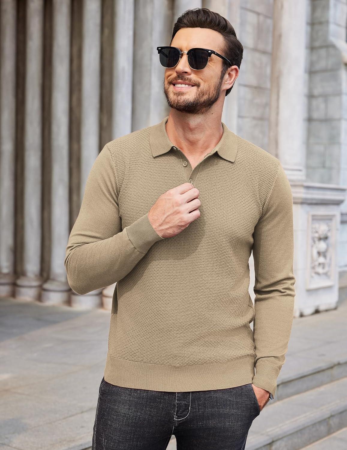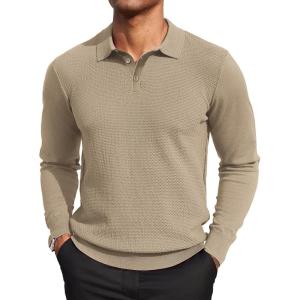 COOFANDY Men’s Knit Polo Sweater Long Sleeve Casual Collared Quarter Button Golf Waffle Textured Sweater(Khaki)