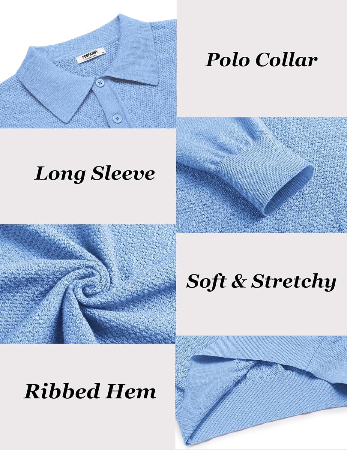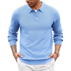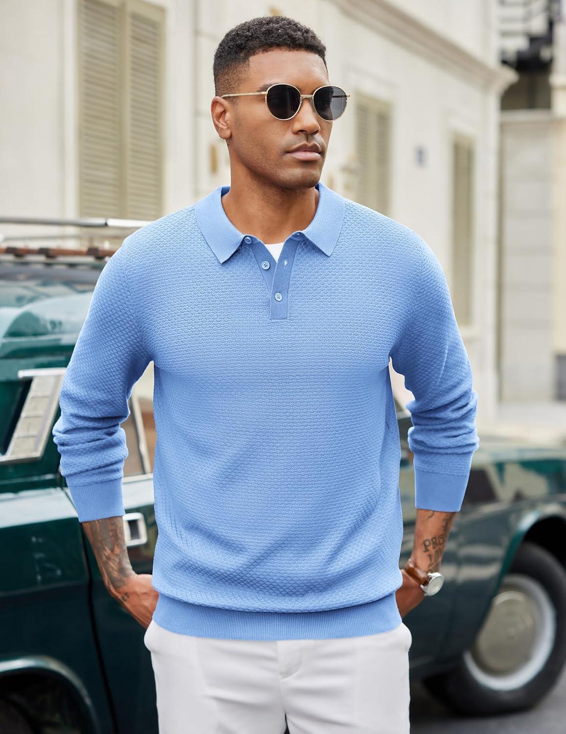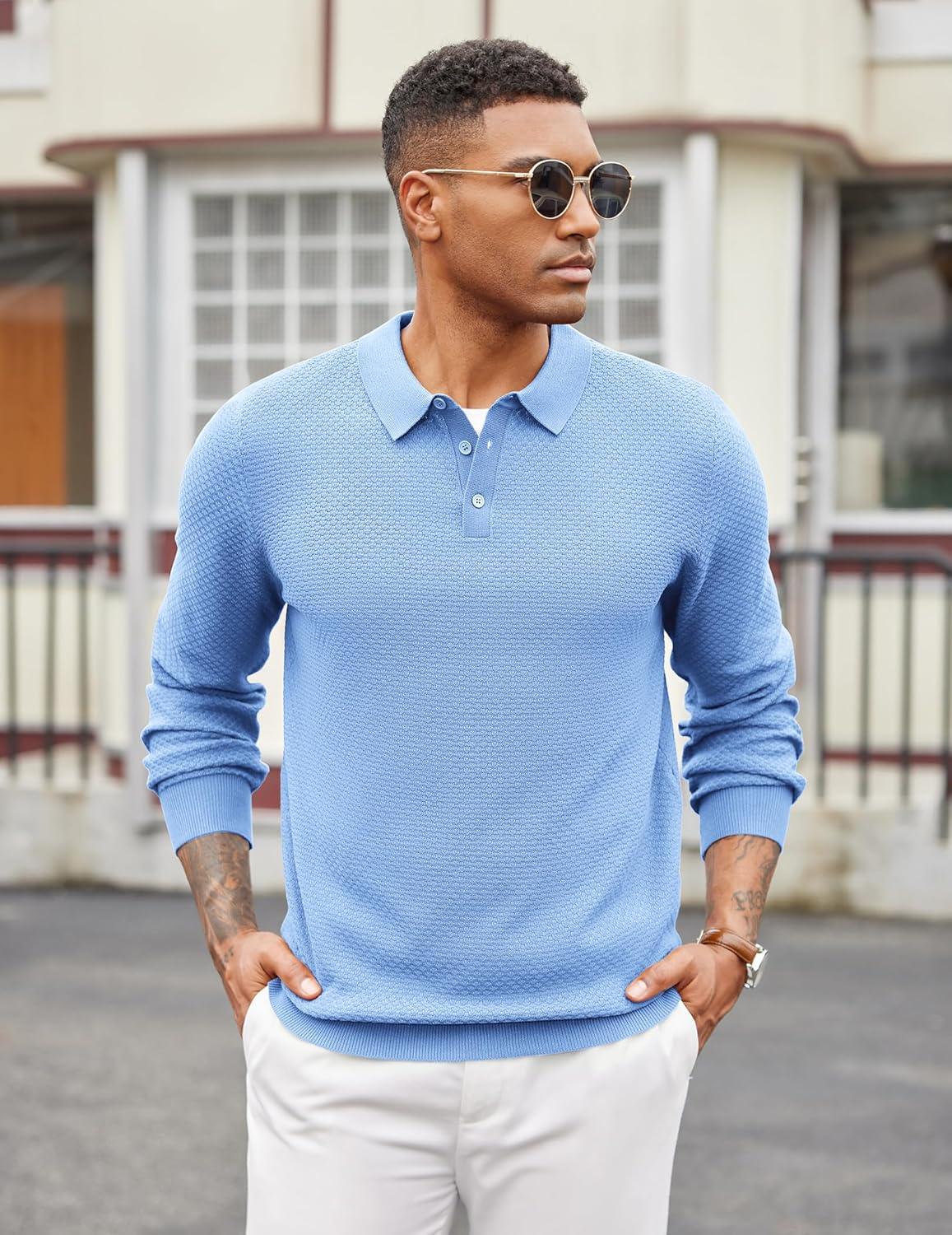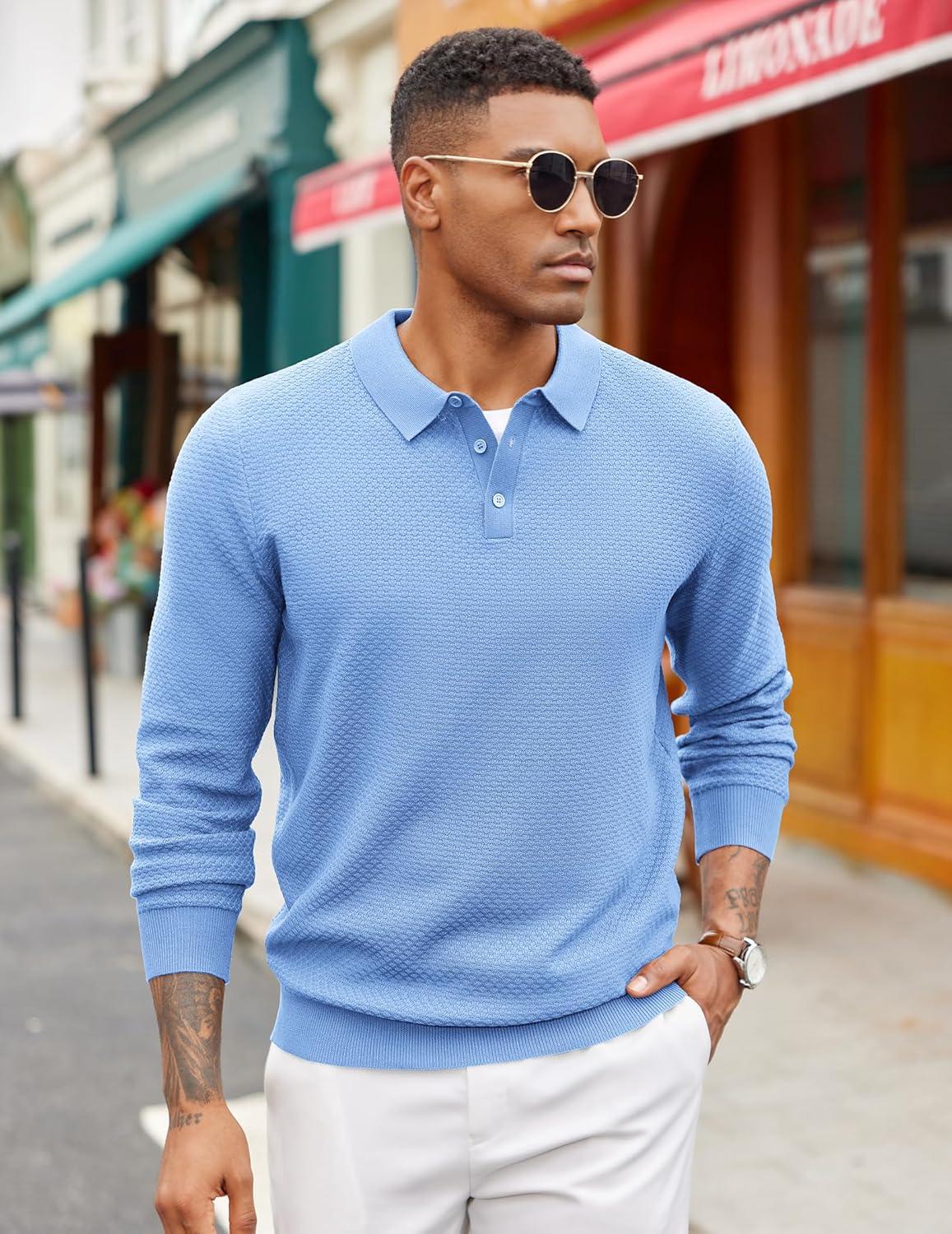 COOFANDY Men’s Knit Polo Sweater Long Sleeve Casual Collared Quarter Button Golf Waffle Textured Sweater(Light Blue)