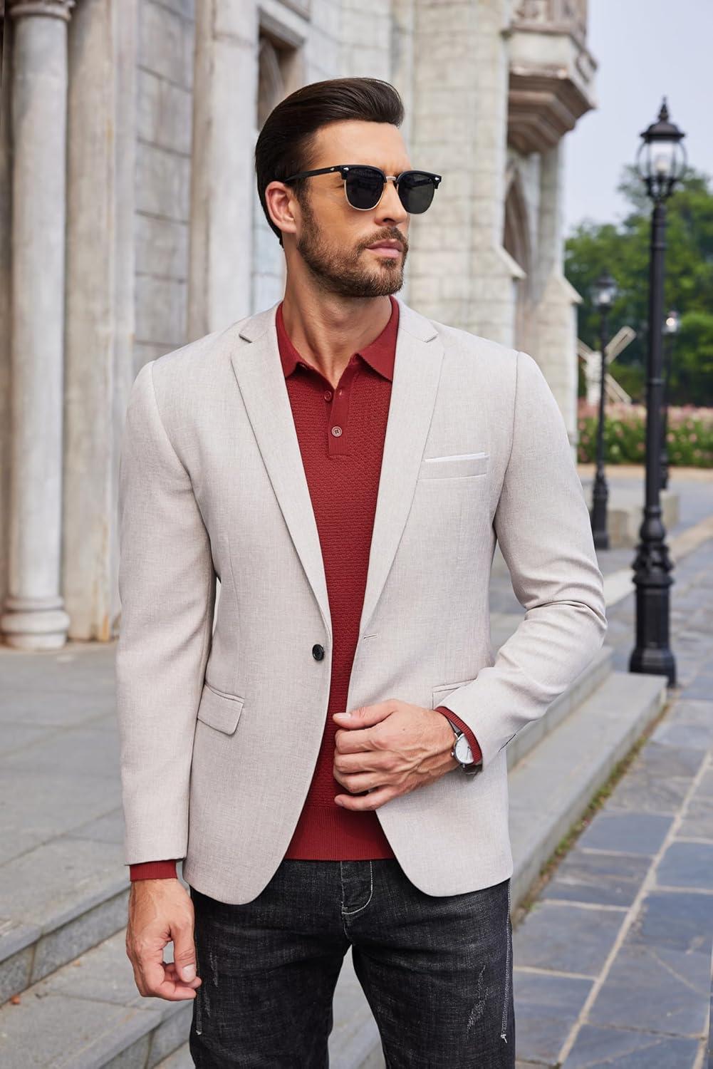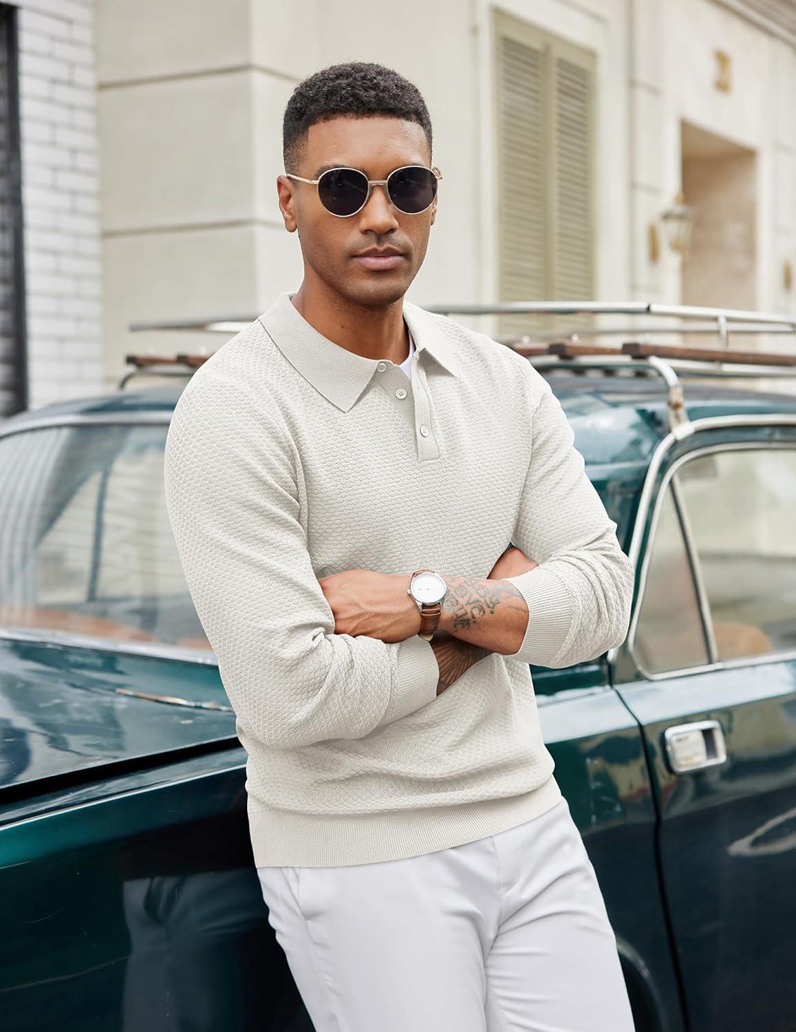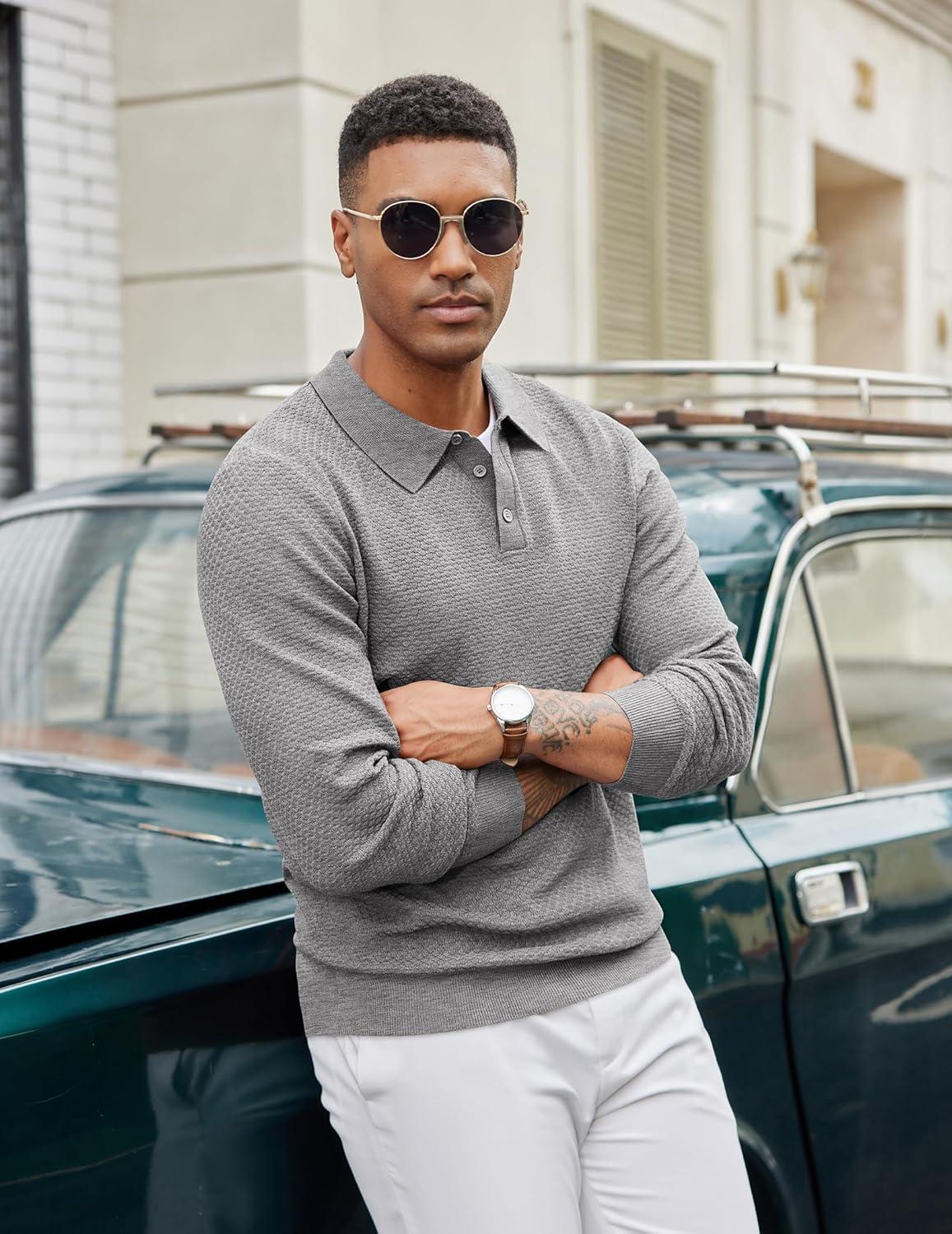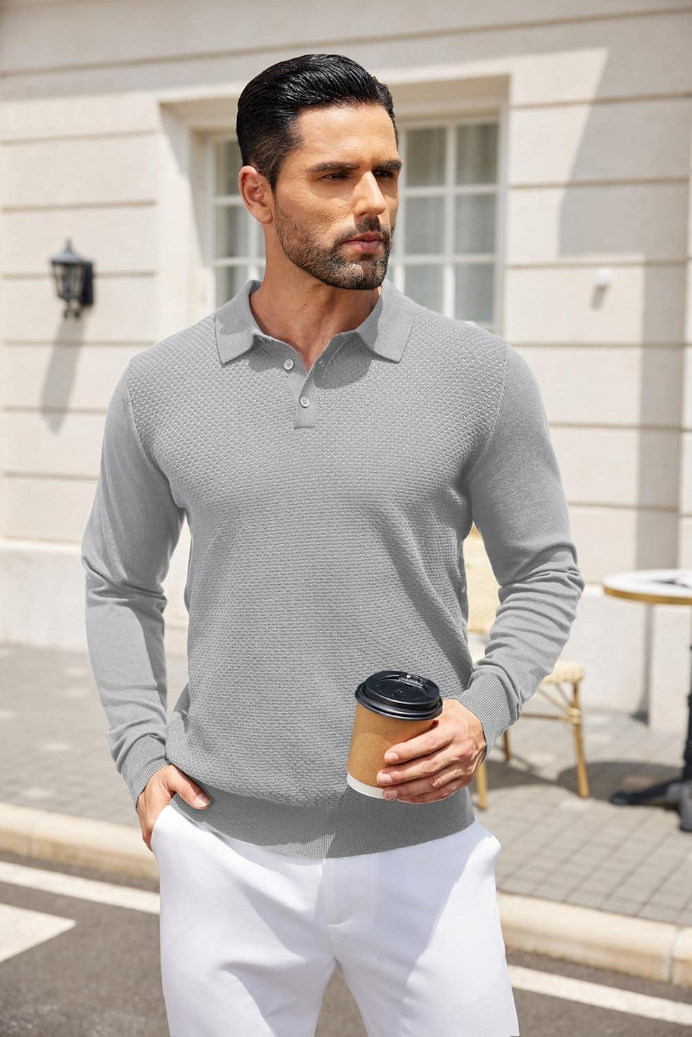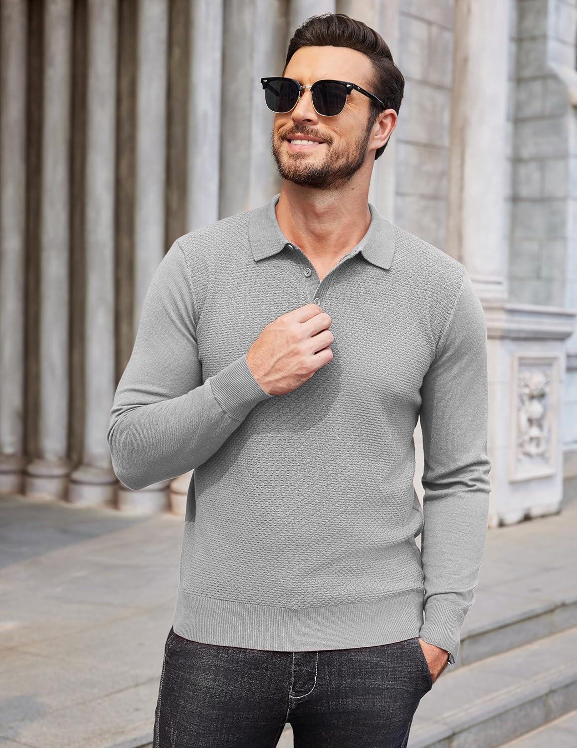 COOFANDY Men’s Knit Polo Sweater Long Sleeve Casual Collared Quarter Button Golf Waffle Textured Sweater(Light Grey)
