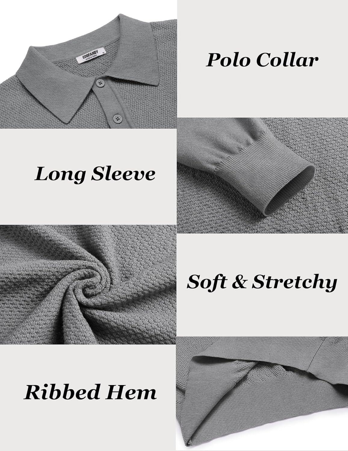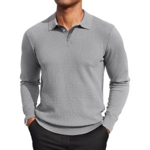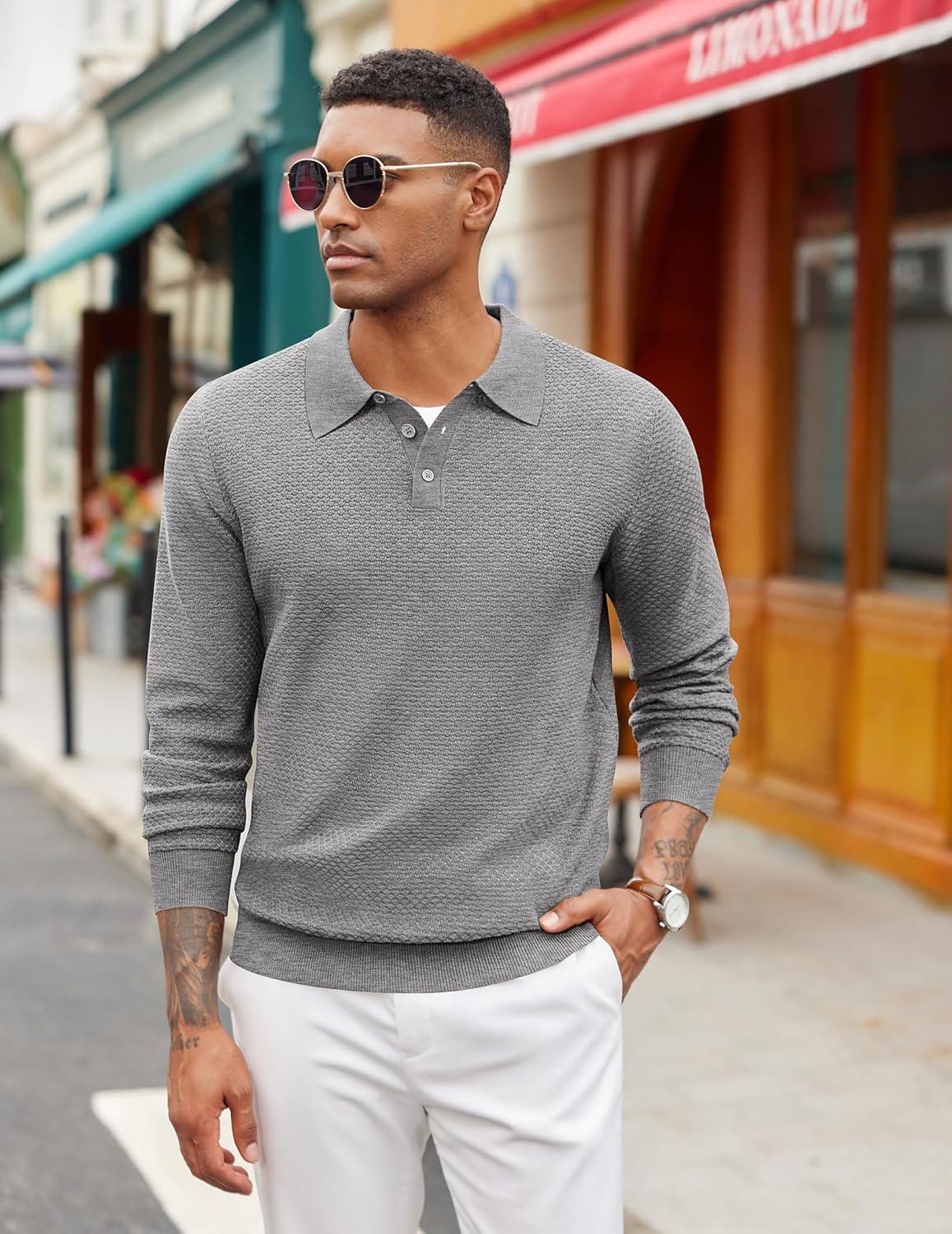 COOFANDY Men’s Knit Polo Sweater Long Sleeve Casual Collared Quarter Button Golf Waffle Textured Sweater(Medium Grey)