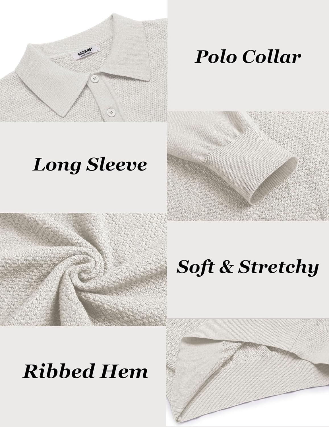 COOFANDY Men’s Knit Polo Sweater Long Sleeve Casual Collared Quarter Button Golf Waffle Textured Sweater(White)