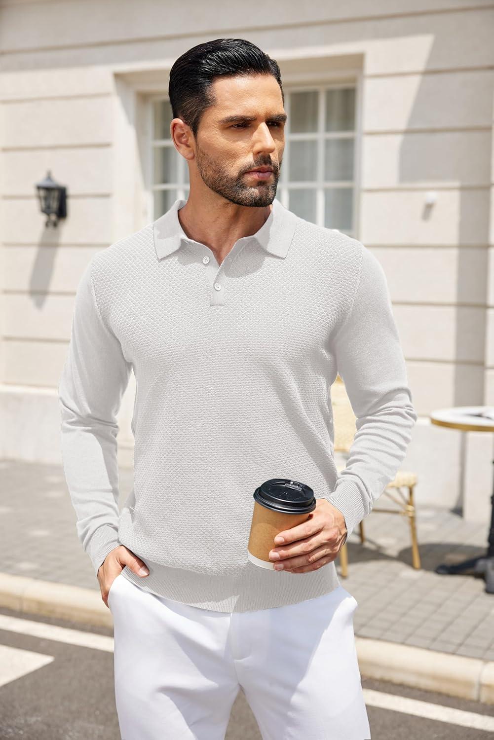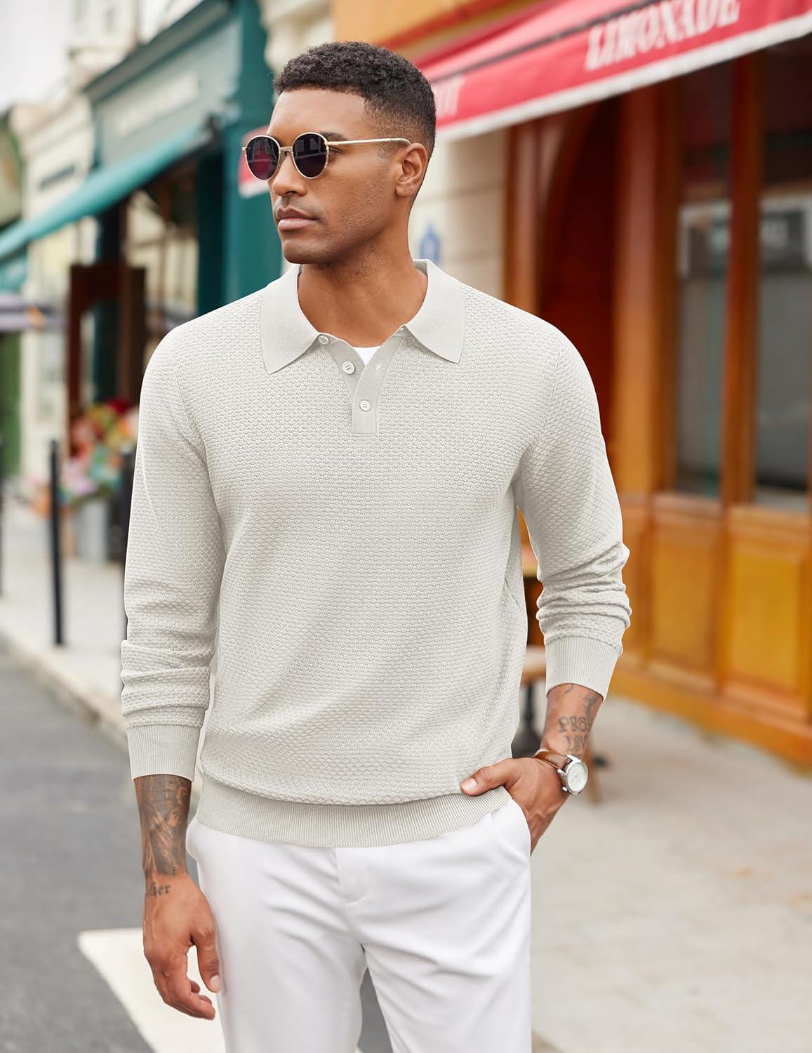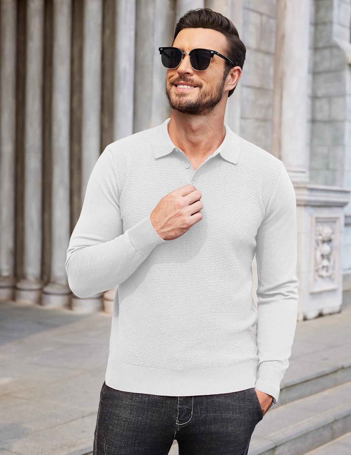COOFANDY Men’s Knit Polo Sweater Long Sleeve Casual Collared Quarter Button Golf Waffle Textured Sweater(White-1)