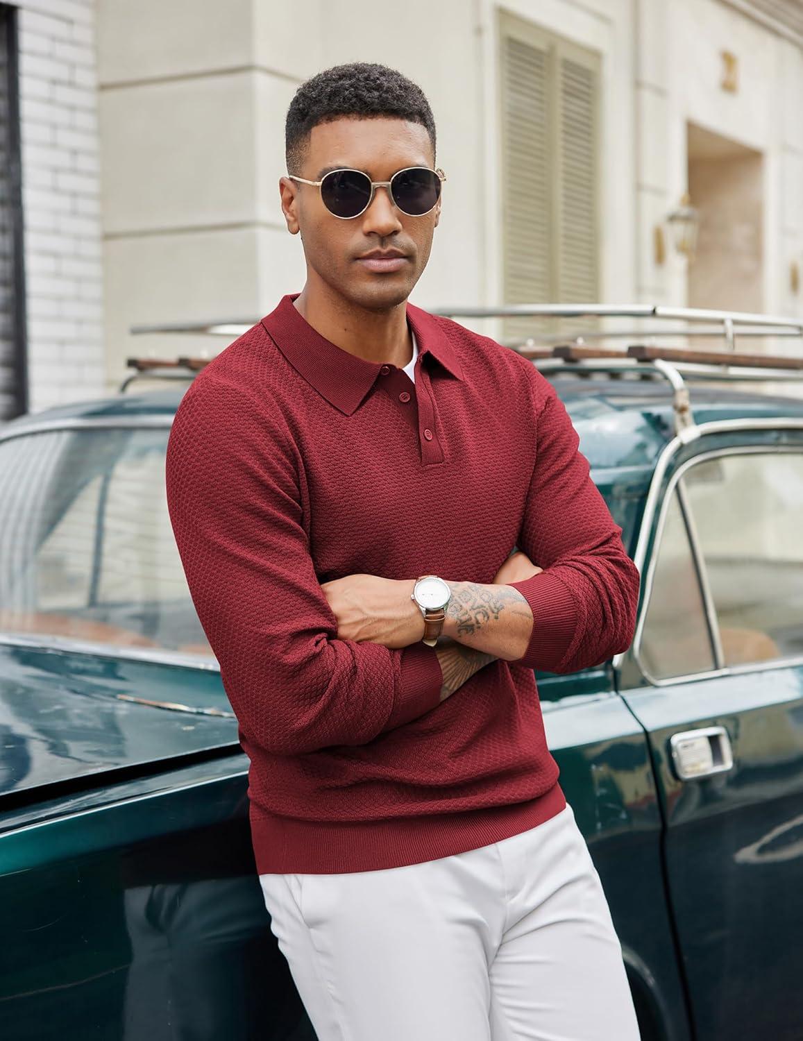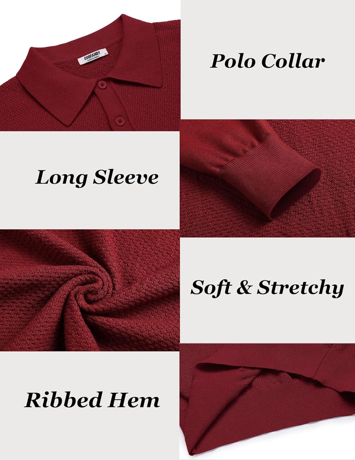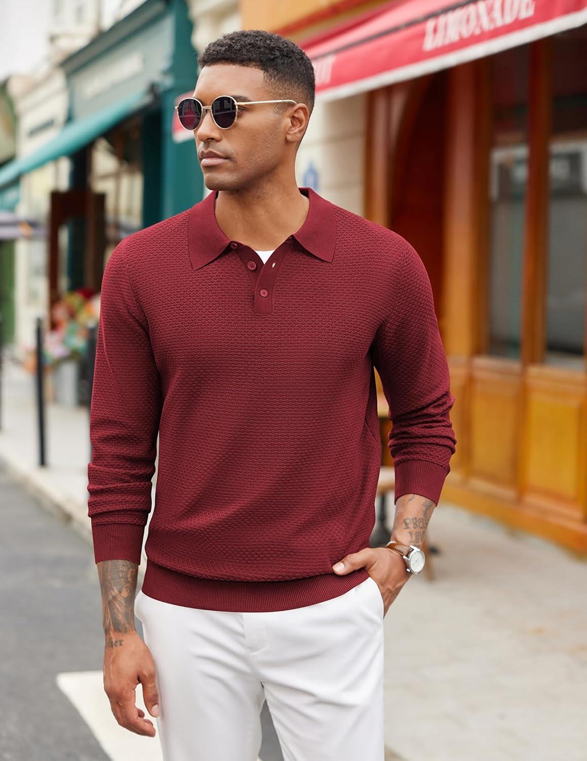 COOFANDY Men’s Knit Polo Sweater Long Sleeve Casual Collared Quarter Button Golf Waffle Textured Sweater(Wine Red)