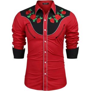 COOFANDY Men’s Western Cowboy Shirts Long Sleeve Cotton Casual Button Down Work Shirt with Pockets(Black & Red)