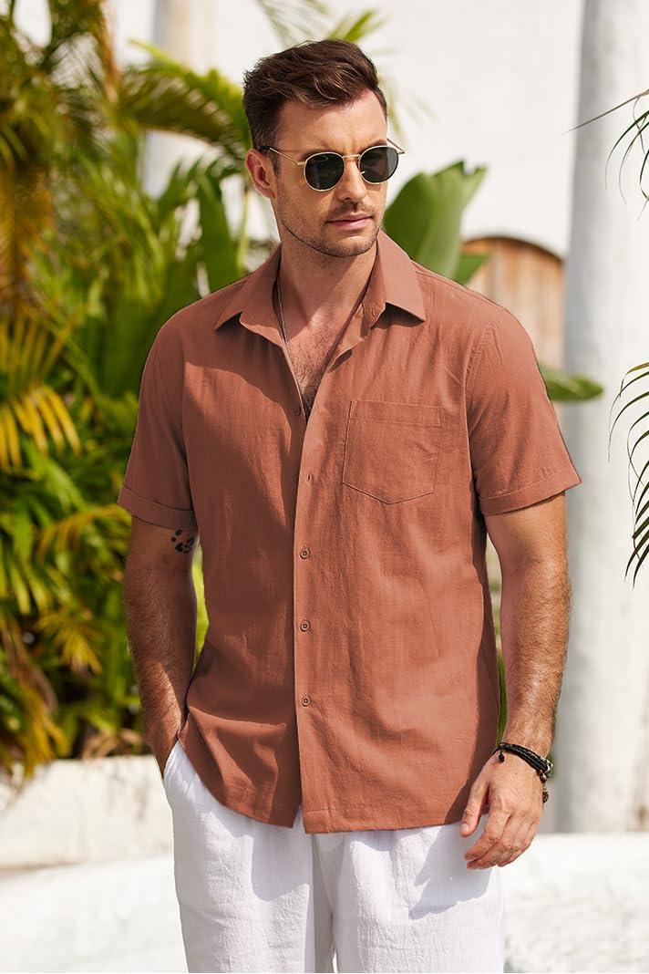 COOFANDY Mens Short Sleeve Button Down Shirts 100% Cotton Beach Style Textured Shirts(Caramel)