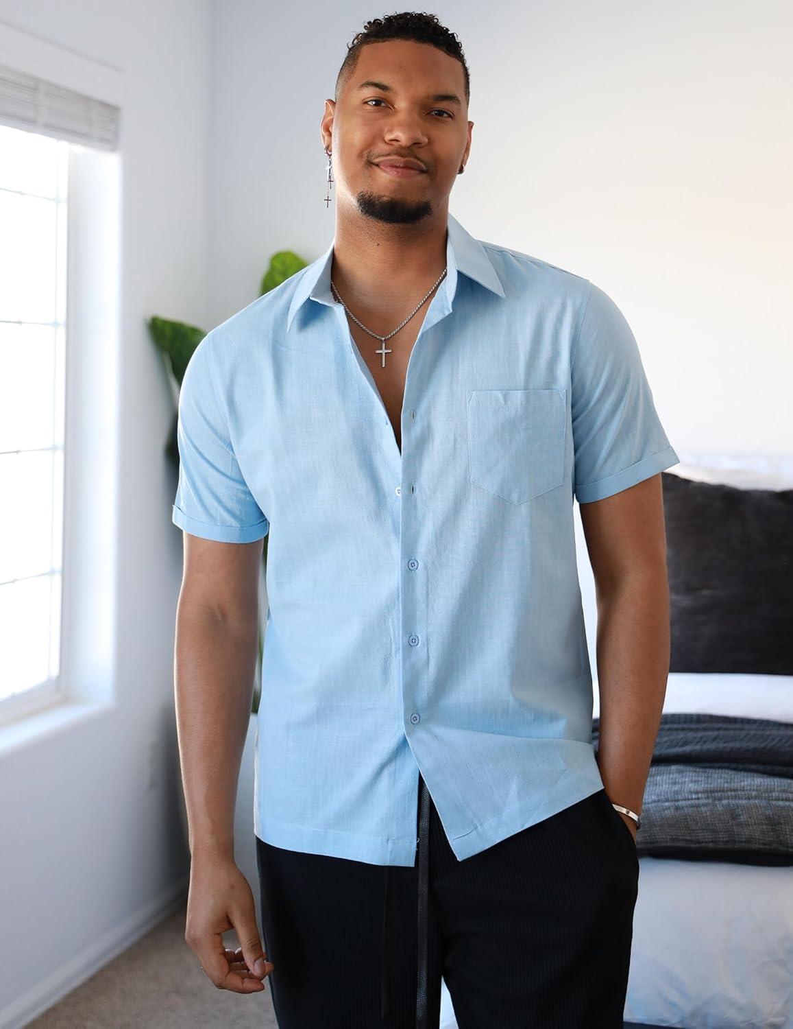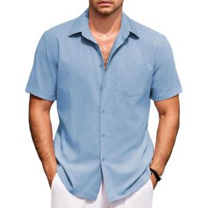 COOFANDY Mens Short Sleeve Button Down Shirts 100% Cotton Beach Style Textured Shirts(Light Blue)
