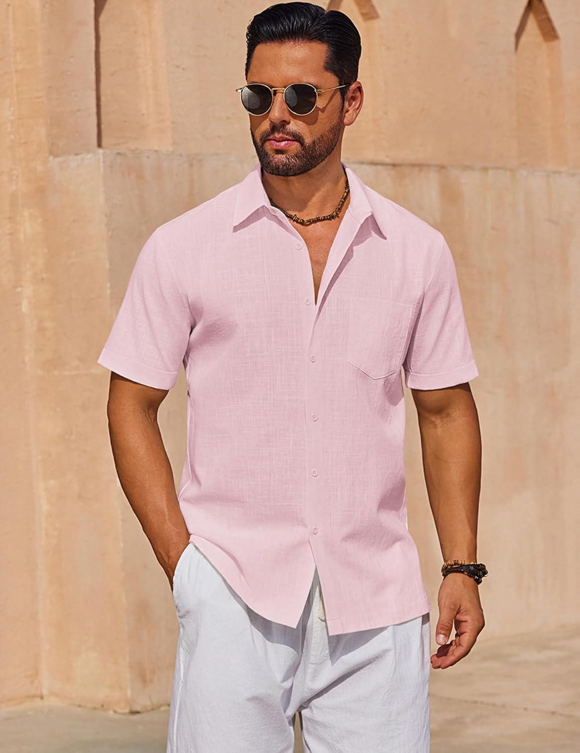 COOFANDY Mens Short Sleeve Button Down Shirts 100% Cotton Beach Style Textured Shirts(Pink)