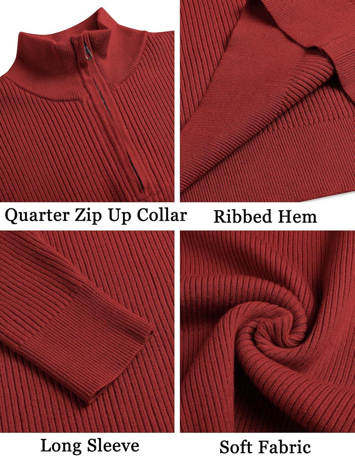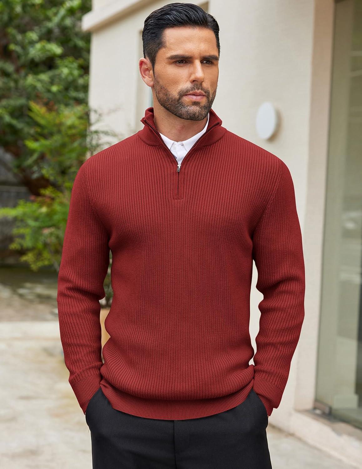 COOFANDY Men’s Quarter Zip Sweaters Slim Fit Mock Neck Pullover Sweater Lightweight Knitted Polo Sweaters(Red)