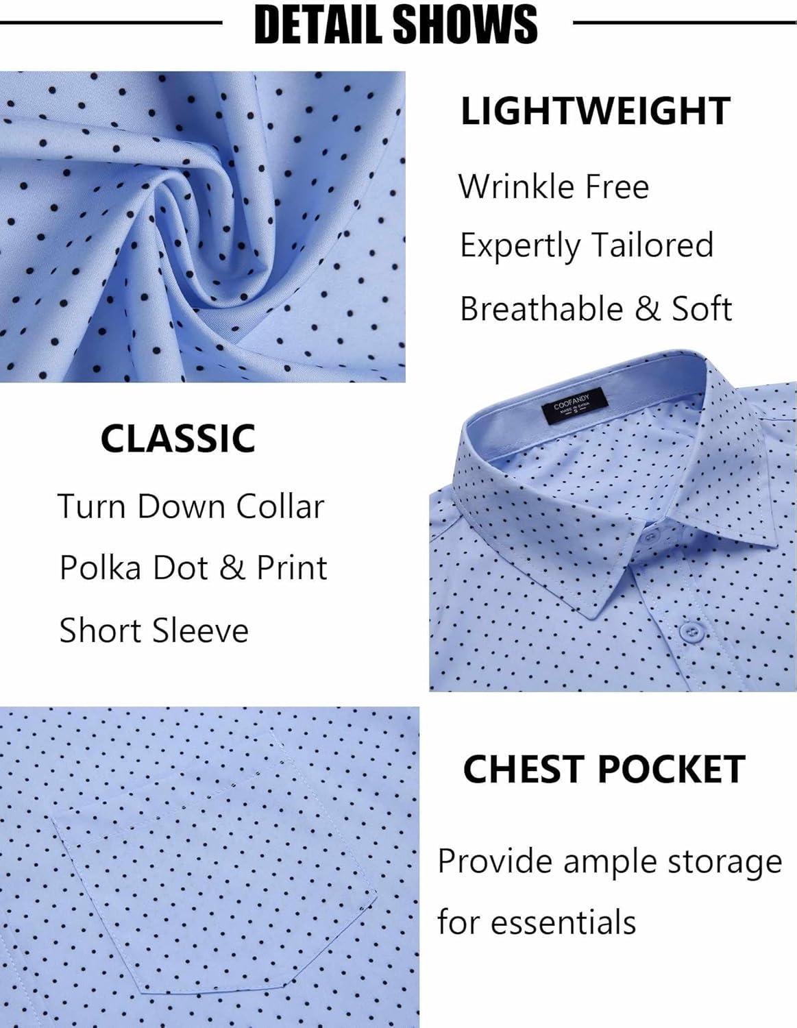 COOFANDY Mens Short Sleeve Button Down Shirts Wrinkle Free Dress Shirts Casual Polka Dot Print Shirt with Pocket(Light Blue(windmill))