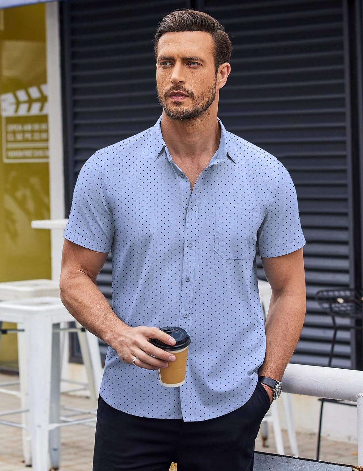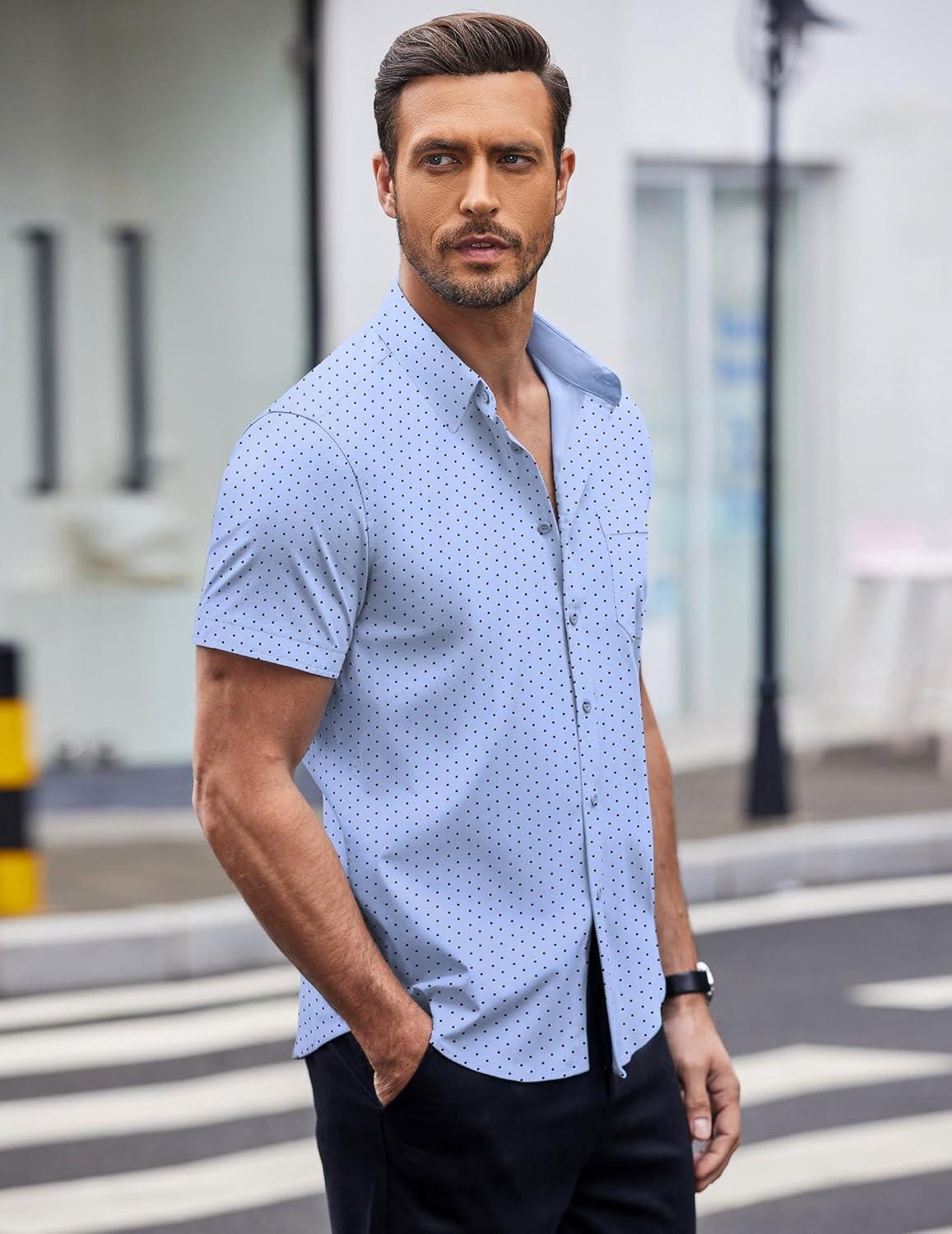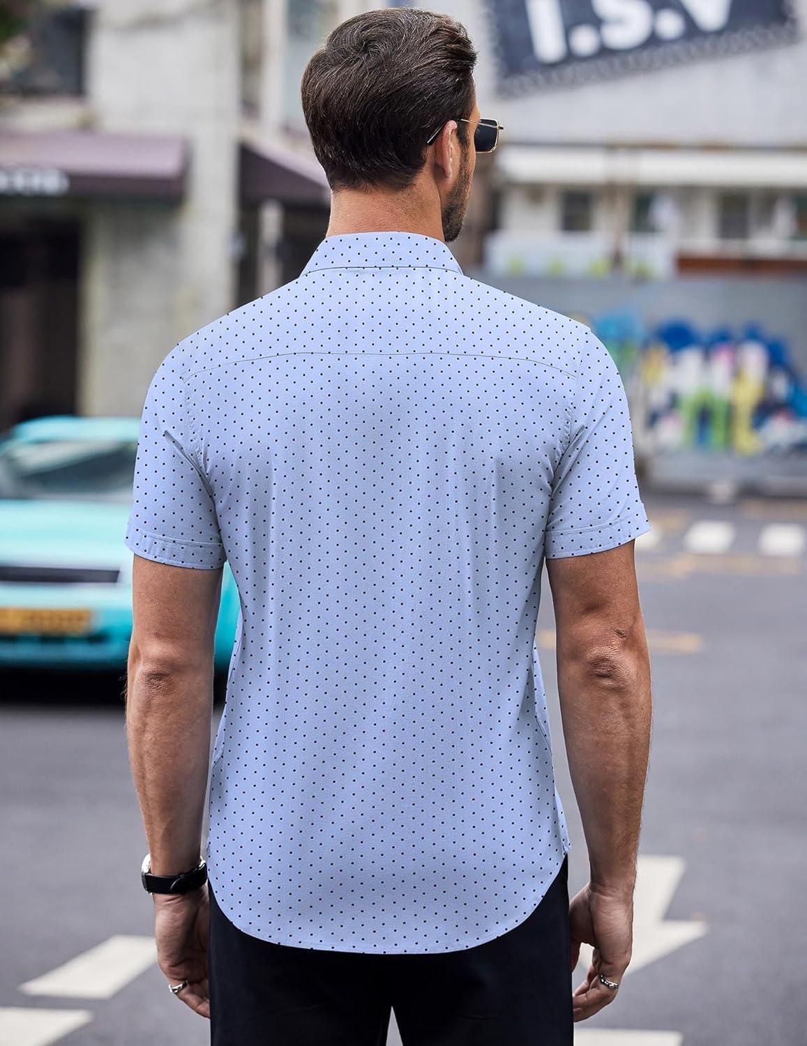 COOFANDY Mens Short Sleeve Button Down Shirts Wrinkle Free Dress Shirts Casual Polka Dot Print Shirt with Pocket(Light Blue)