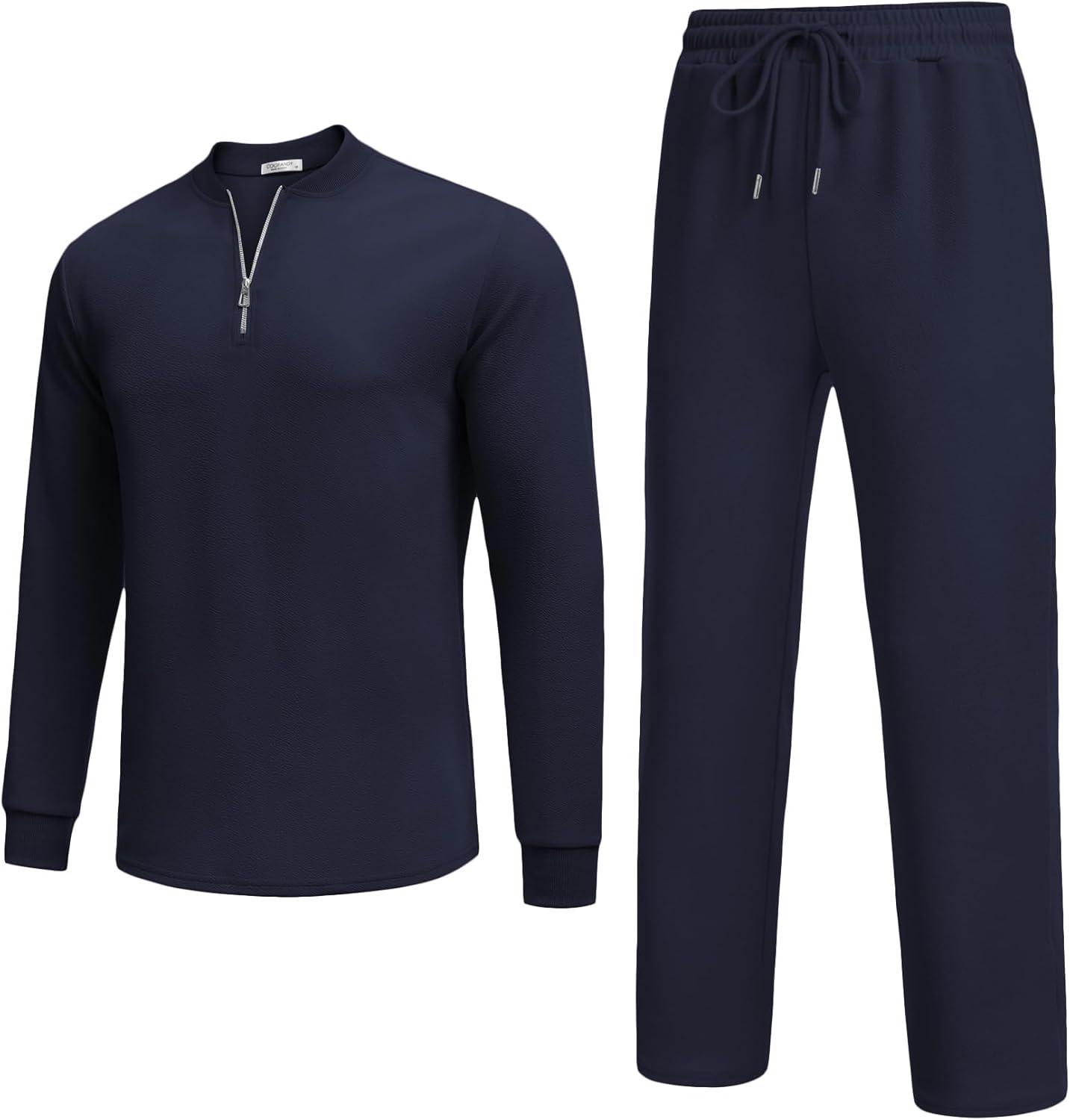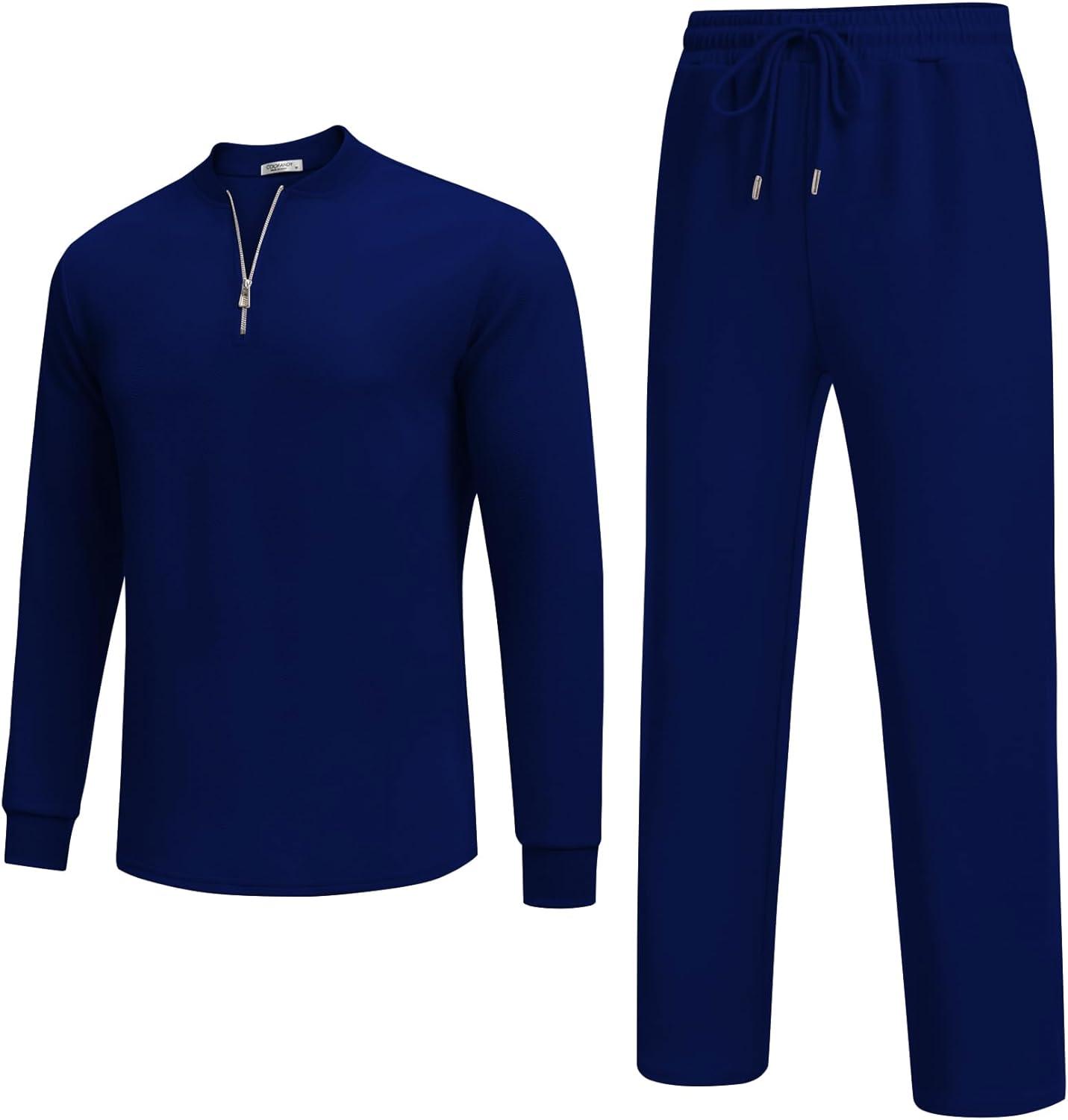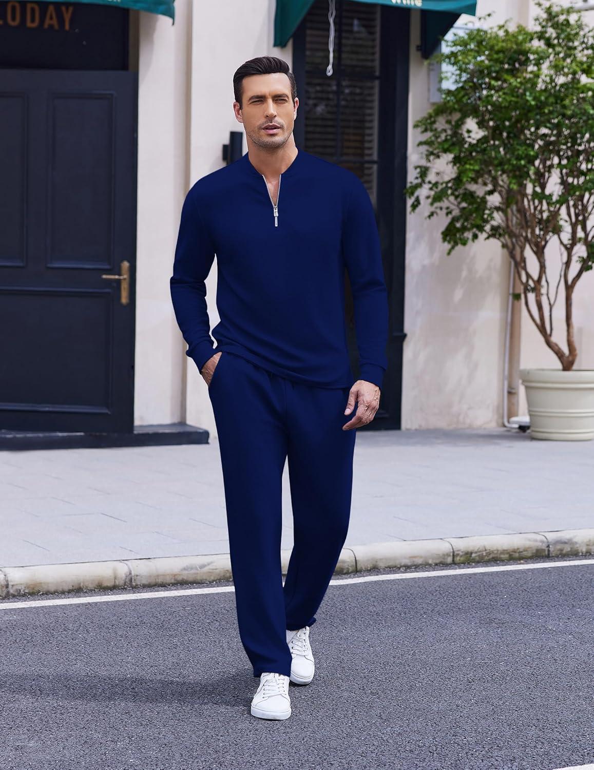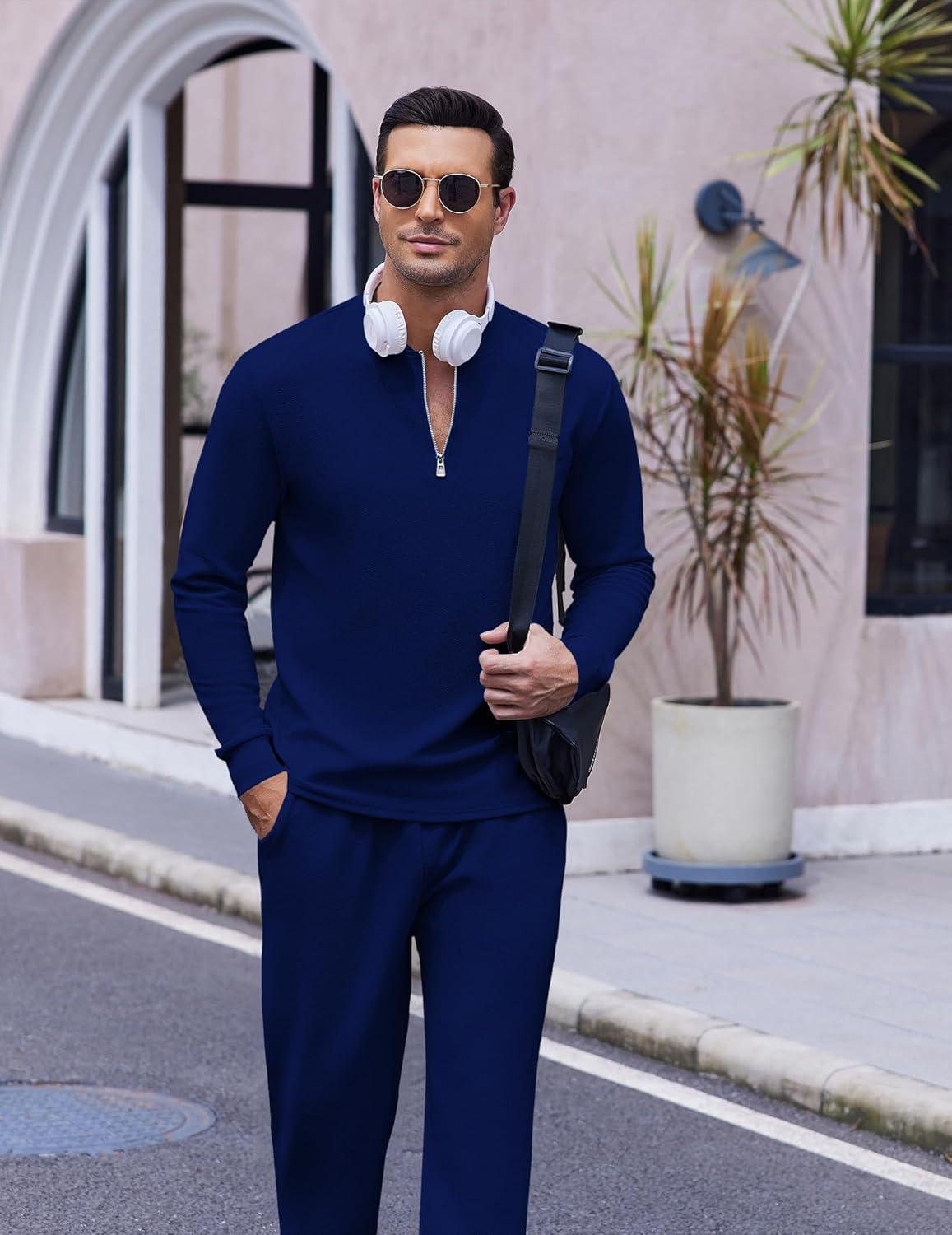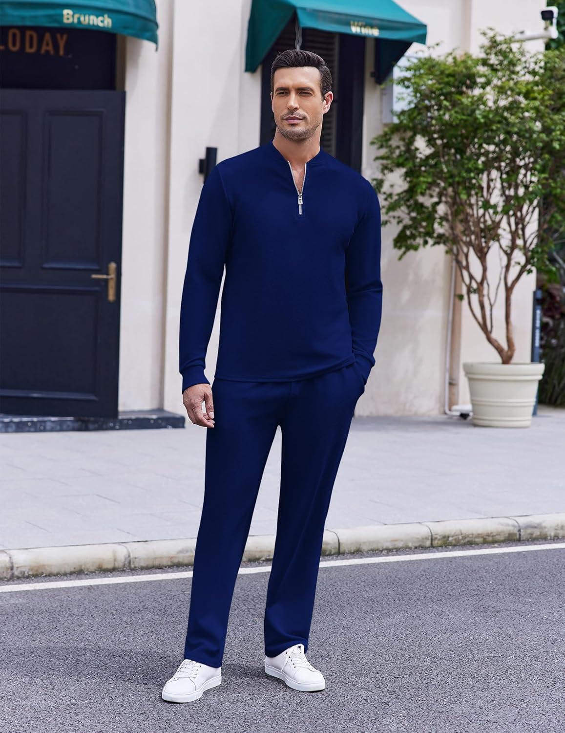COOFANDY Men’s 2 Piece Tracksuit Set Polo Athletic Sweatsuit Quarter Zip Jogging Long Sleeve Casual Sports Outfits(Denim Blue)